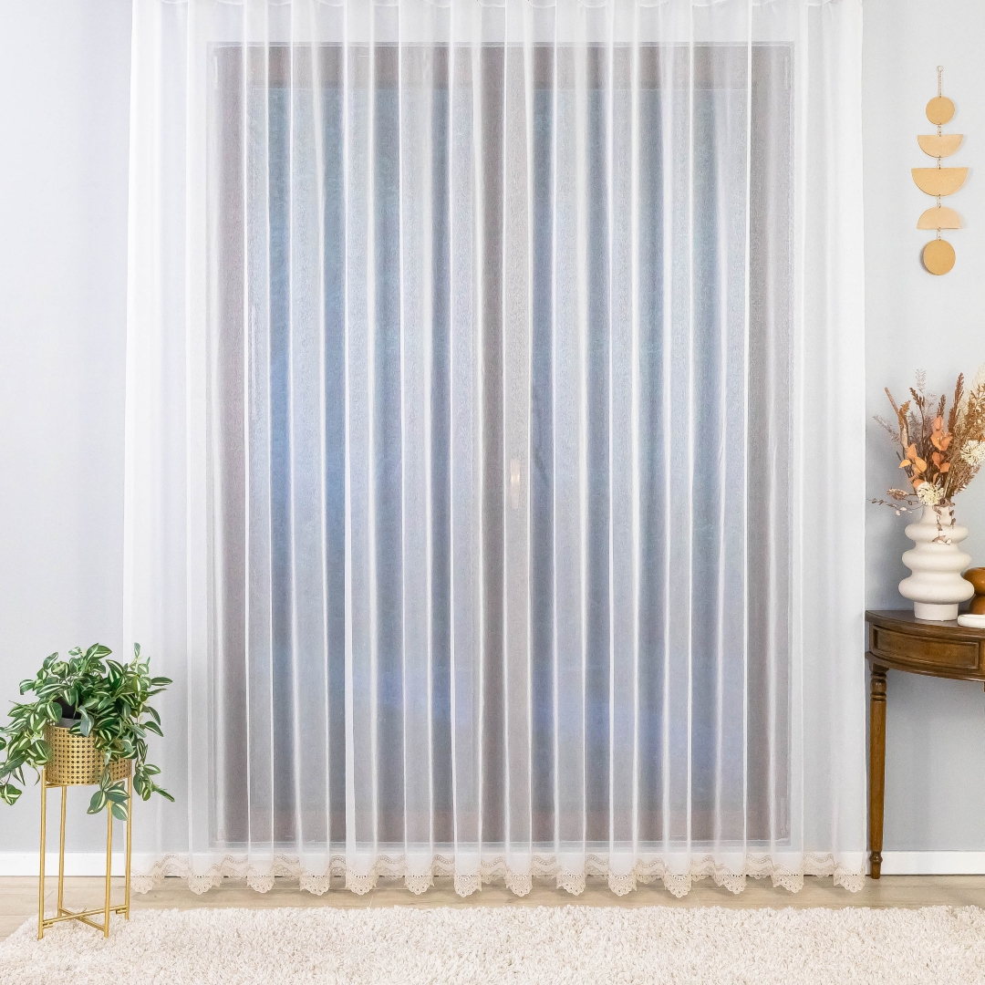 Taśma marszcząca umożliwia szybkie i łatwe zawieszenie firany, a także zapewnia równe, miękkie fale, które doskonale układają się na karniszu. To rozwiązanie idealne dla osób, które cenią gotowe, estetyczne dekoracje okienne bez konieczności szycia.