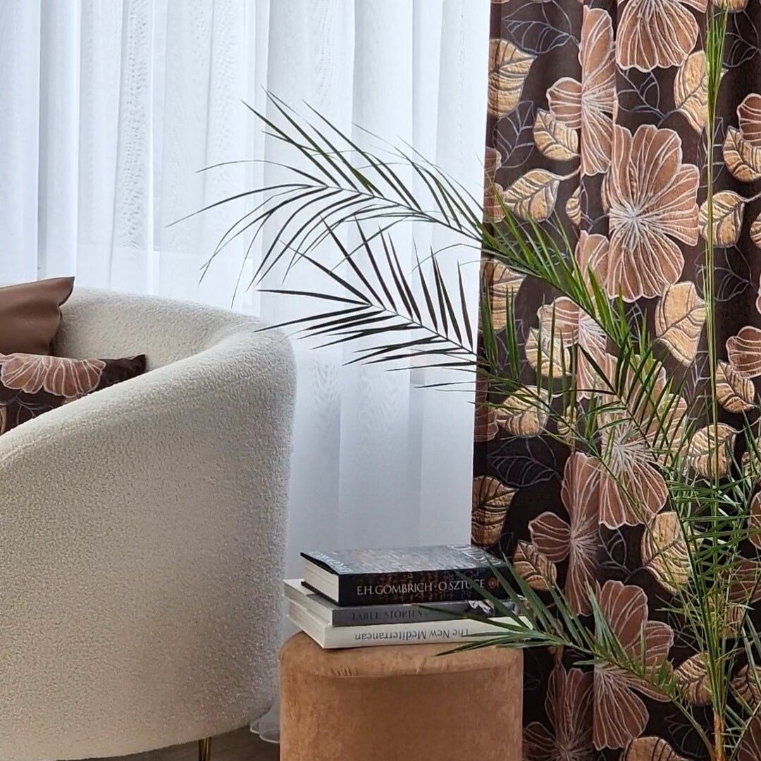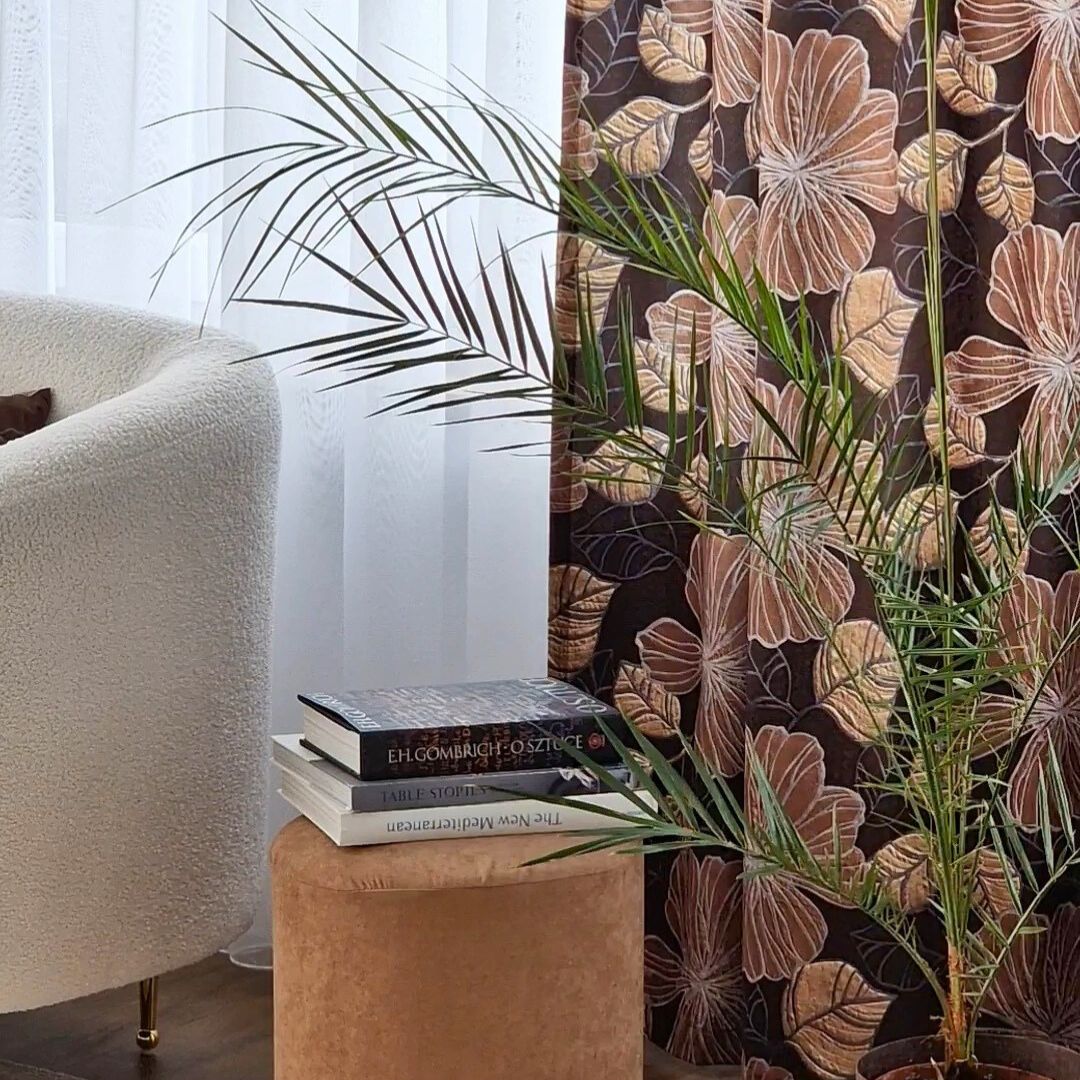 Zasłony velvetowe w liście na przelotkach to propozycja dla osób, które cenią połączenie elegancji i funkcjonalności. Wzór dużych liści w odcieniach brązu i złota pięknie komponuje się z ciemnym tłem, tworząc wyjątkowo przytulny klimat we wnętrzu. Dzięki przelotkom zasłony są łatwe do zawieszenia na każdym standardowym karniszu, a ich miękko układająca się tkanina velvet dodatkowo ociepla pomieszczenie wizualnie i akustycznie.