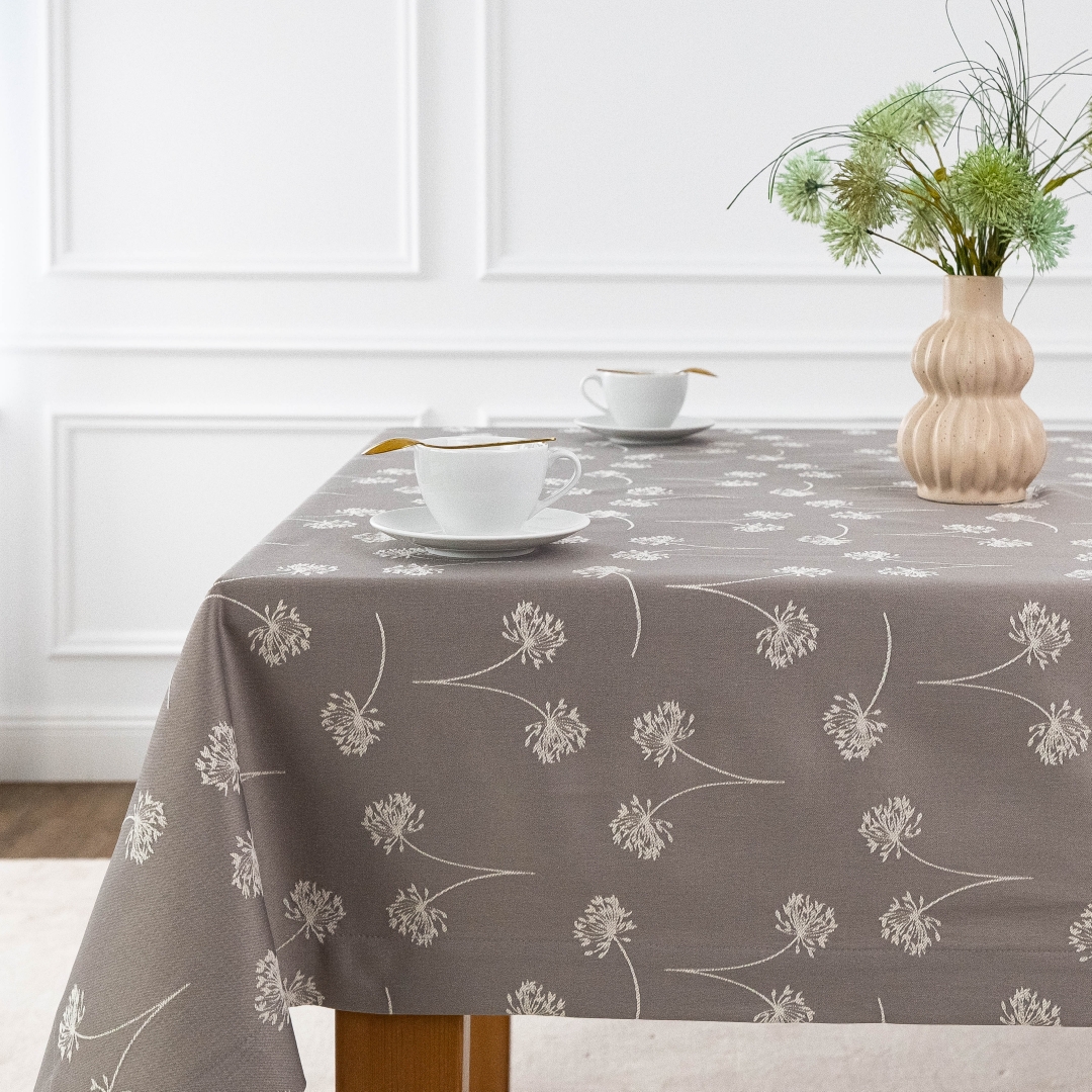 Jeśli szukasz obrusu, który łączy elegancję z codzienną wygodą – ten model spełni wszystkie oczekiwania. Subtelny, roślinny wzór żakardowy w modnym odcieniu szaro-beżowym nadaje wnętrzu wyjątkowego charakteru, a jednocześnie pozostaje na tyle uniwersalny, że bez trudu dopasujesz go do różnych aranżacji stołu.