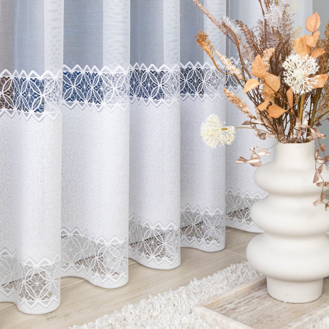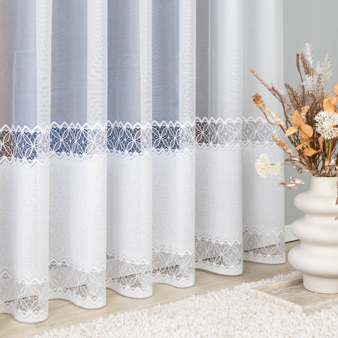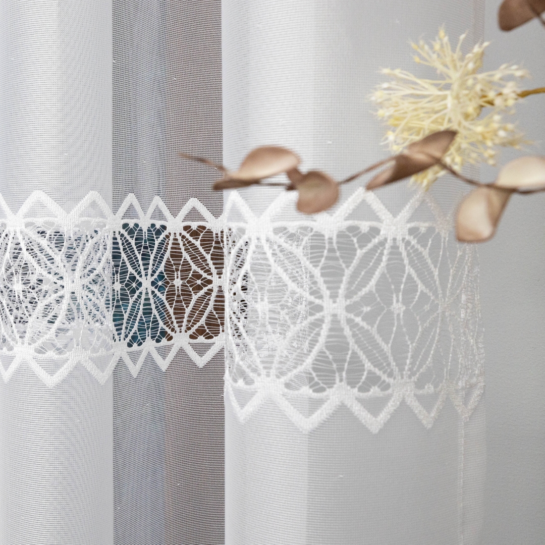 Elegancka firana żakardowa z ażurowym geometrycznym wzorem w wersji gotowej na przelotkach to doskonałe połączenie stylu, wygody i nowoczesności.