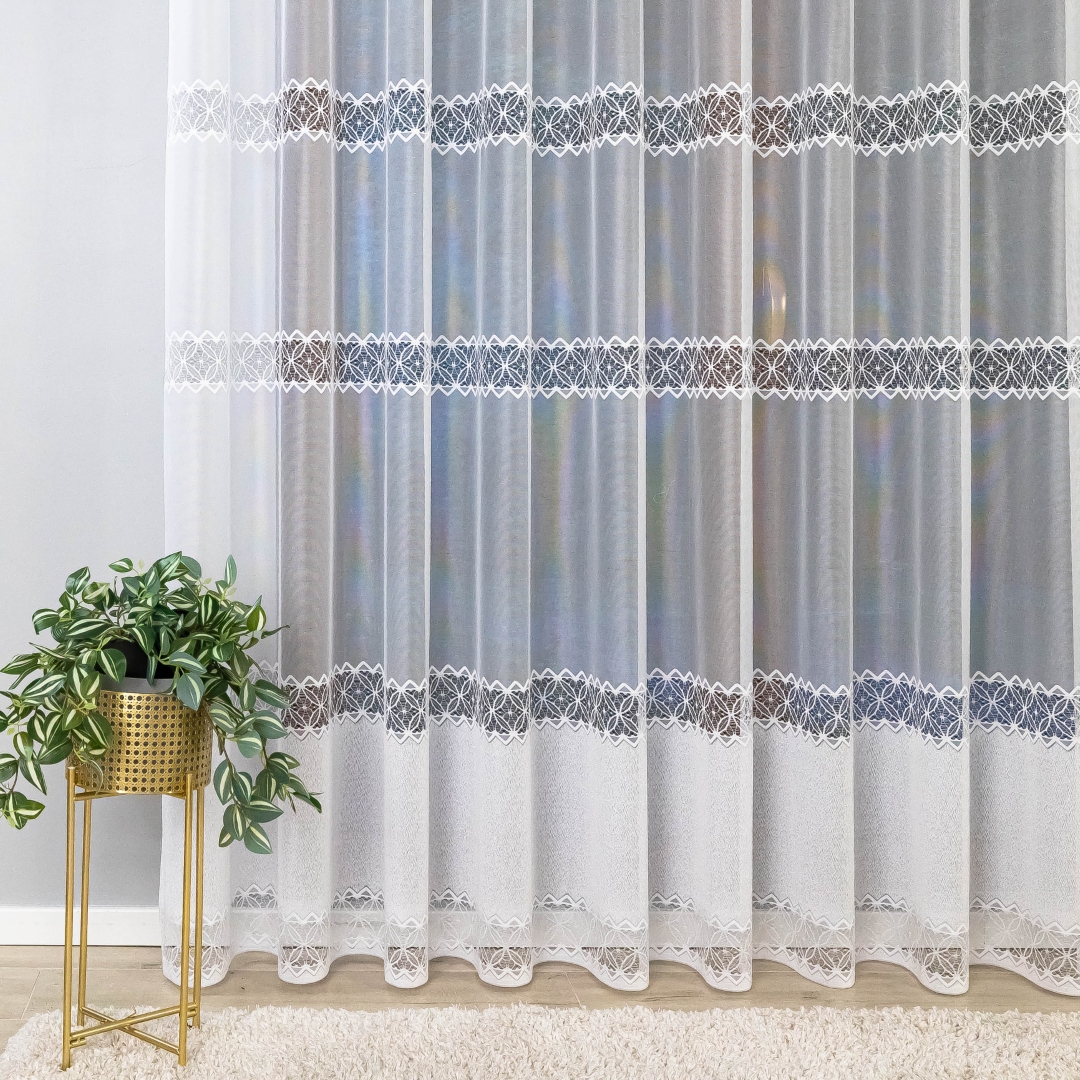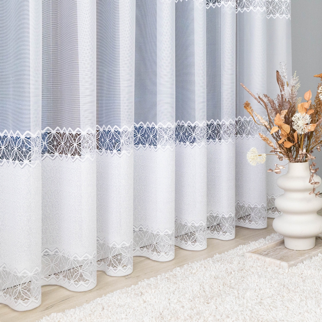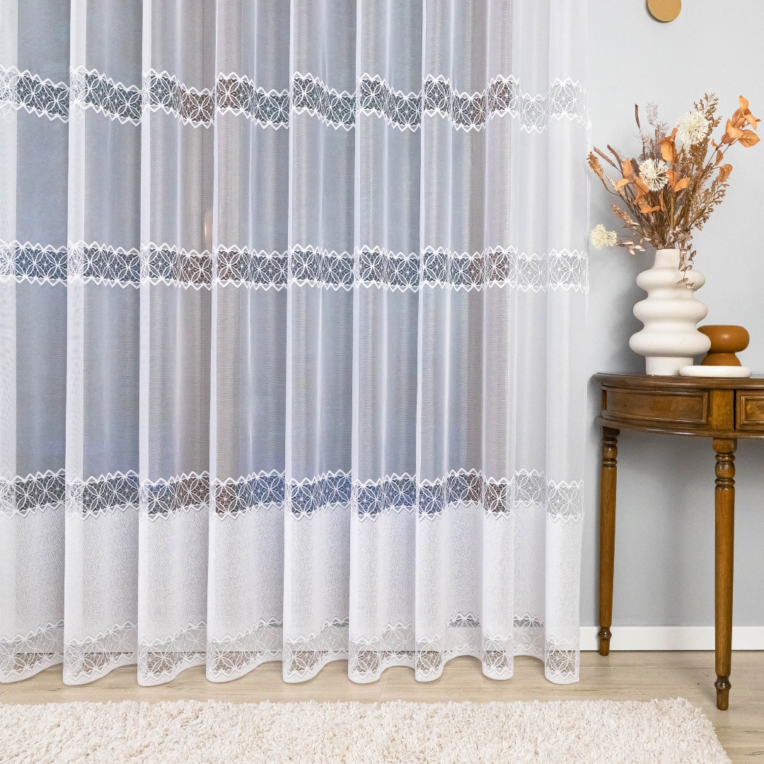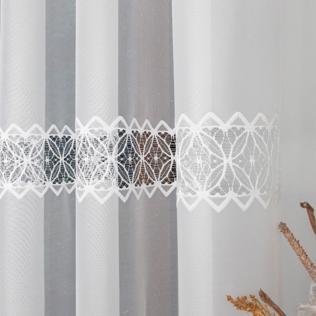 Elegancka firana żakardowa z ażurowym geometrycznym wzorem w wersji gotowej na przelotkach to doskonałe połączenie stylu, wygody i nowoczesności.