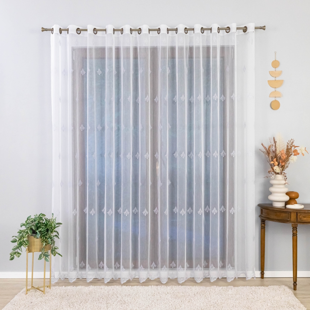 Delikatna, półtransparentna tkanina pięknie przepuszcza światło, subtelnie rozjaśniając wnętrze, a haft w odcieniu srebra dodaje całości blasku i klasy.