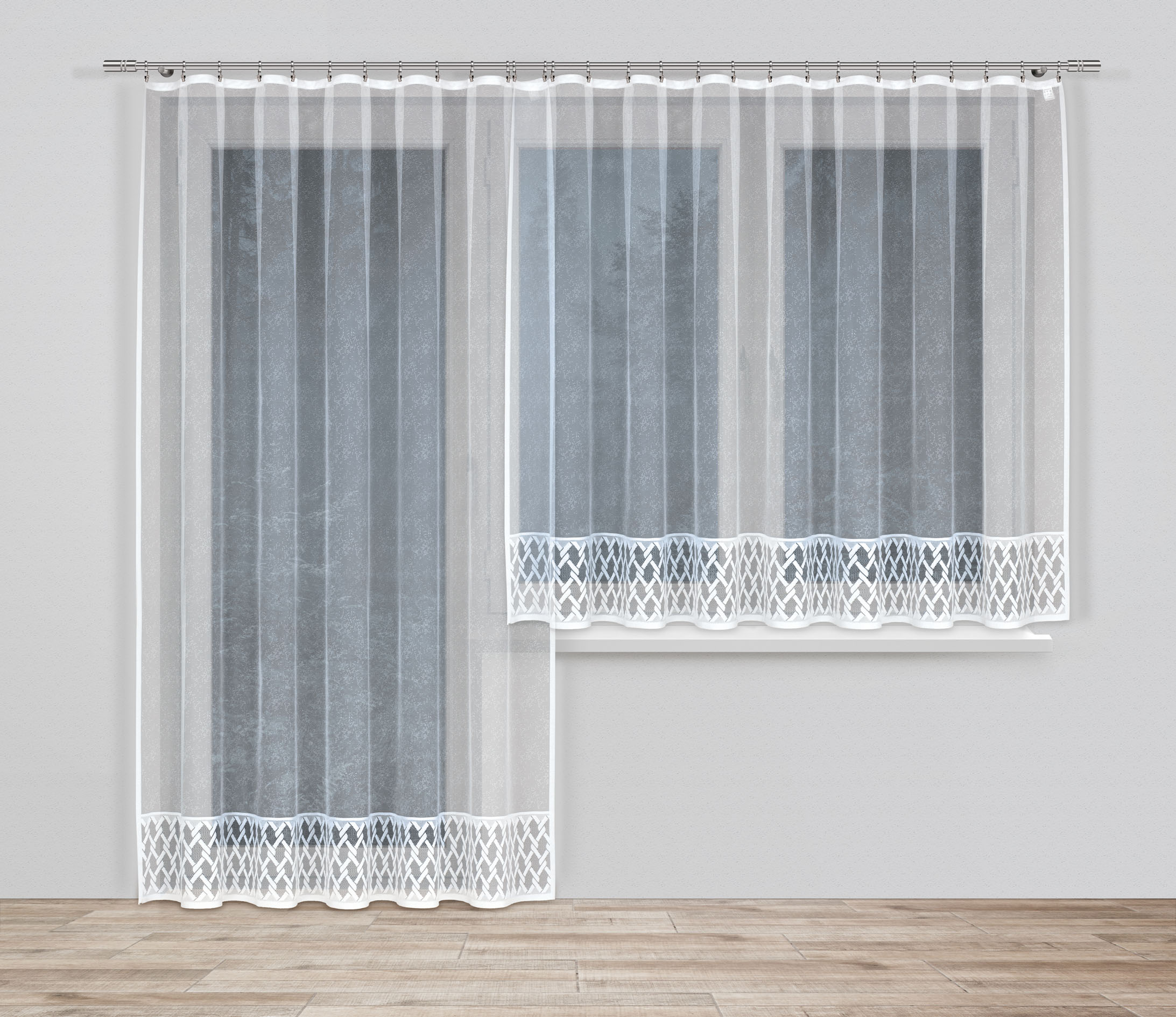 Nasze gotowe komplety dwóch firan składają się z firanki krótkiej, która sięga parapetu oraz firanki długiej, która zakrywa całe drzwi balkonowe i dosięga aż do podłogi. Posiadamy firany w finezyjnych kształtach, które mają na celu wyeksponowanie przestrzeni na parapecie. To ulubione rozwiązanie klientek, które parapety w swoich salonach dekorują kwiatami.