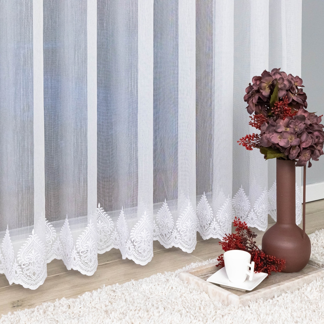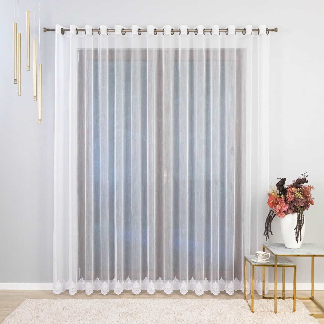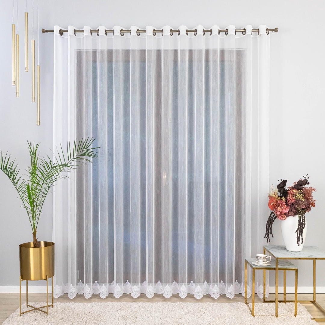 Finezyjny haft na dole dodaje firanie wyjątkowego uroku i stylu, podkreślając elegancję każdego wnętrza. Dzięki metalowym przelotkom montaż firany jest szybki i wygodny – wystarczy zawiesić ją na karniszu, bez potrzeby stosowania taśm czy haczyków.