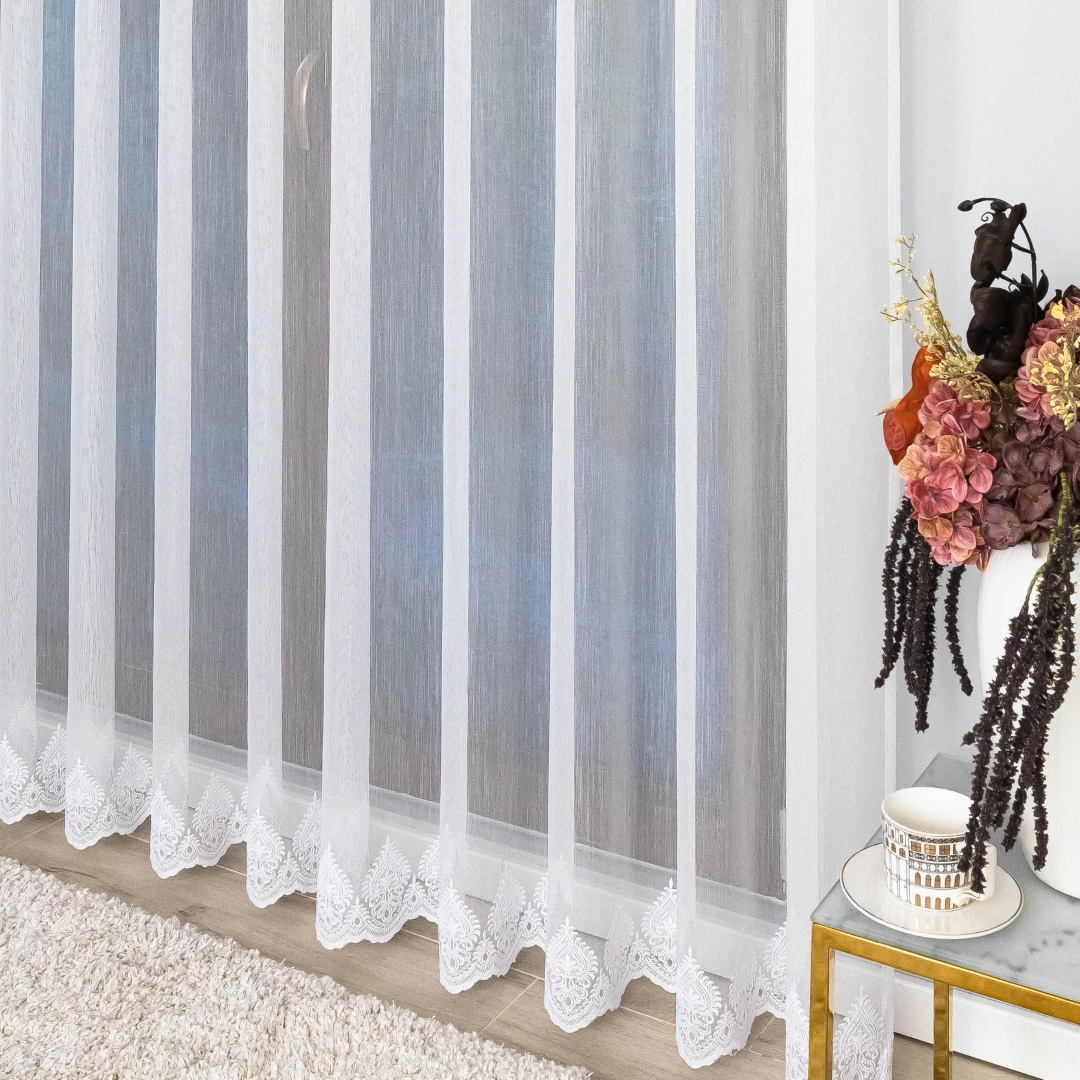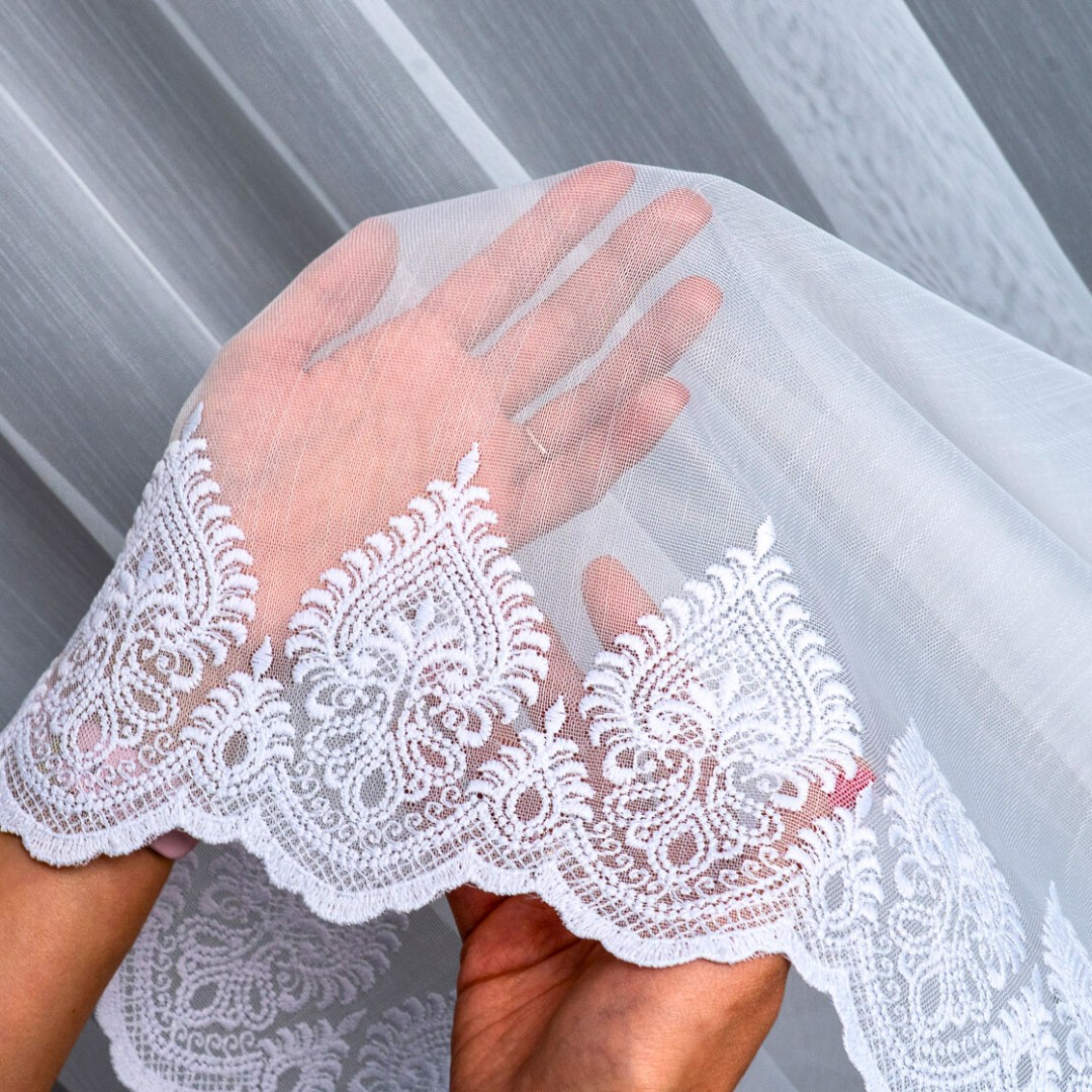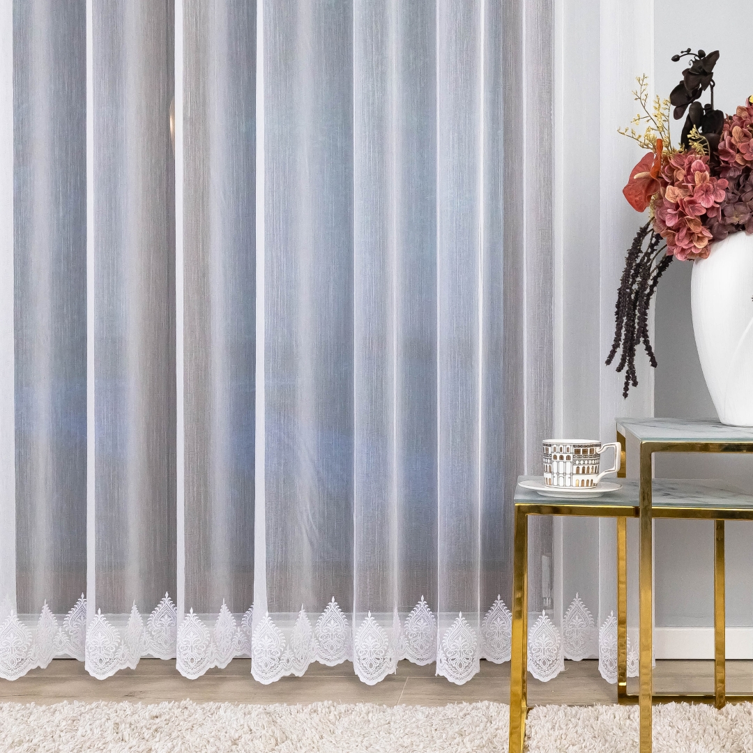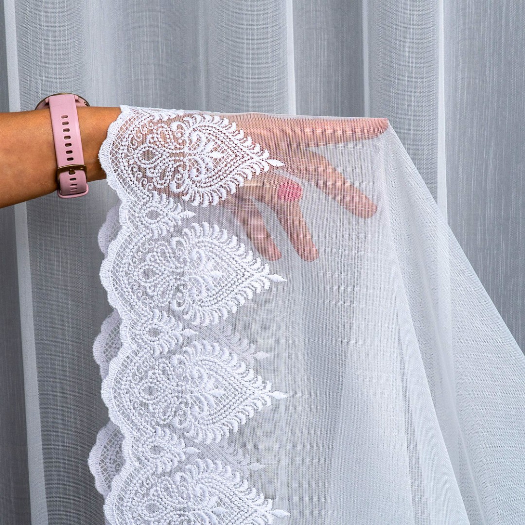 Finezyjny haft na dole dodaje firanie wyjątkowego uroku i stylu, podkreślając elegancję każdego wnętrza. Dzięki metalowym przelotkom montaż firany jest szybki i wygodny – wystarczy zawiesić ją na karniszu, bez potrzeby stosowania taśm czy haczyków.