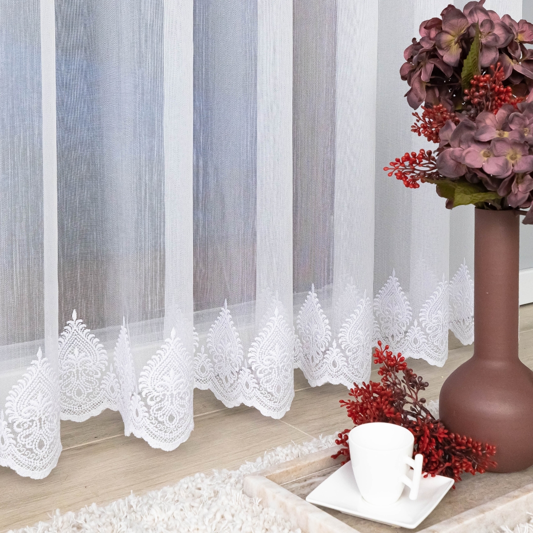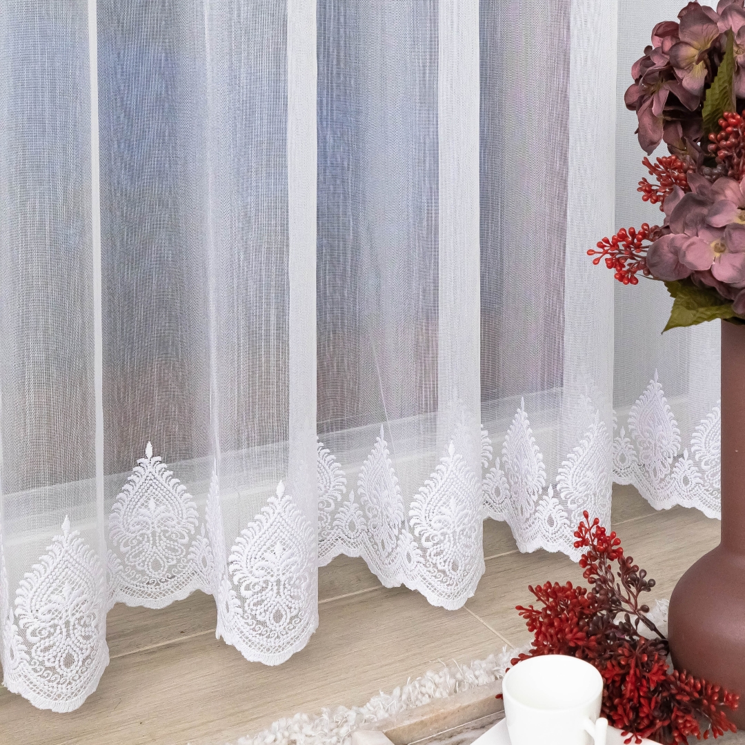 Elegancka gotowa firana markizeta gładka z finezyjnym haftowanym wzorem na dole – na przelotkach to idealna dekoracja okienna łącząca subtelną elegancję i wygodę użytkowania. Lekka, półprzezroczysta tkanina markizeta doskonale przepuszcza światło, rozjaśniając wnętrze i nadając mu przytulnego charakteru.