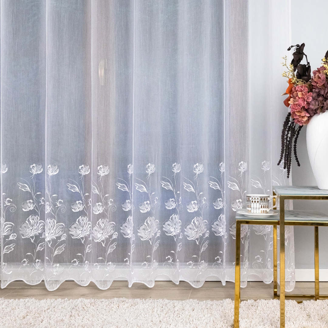 Haftowane kwiaty w dolnej części firany wprowadzają do pomieszczenia romantyczny i przytulny nastrój, czyniąc ją doskonałym wyborem do salonu, sypialni, jadalni, a także pokoju gościnnego. Jej klasyczny biały kolor pasuje do wnętrz urządzonych w stylu nowoczesnym, skandynawskim, rustykalnym czy boho.