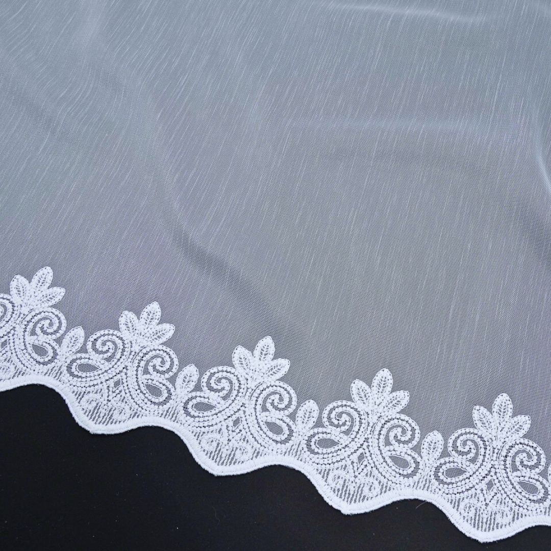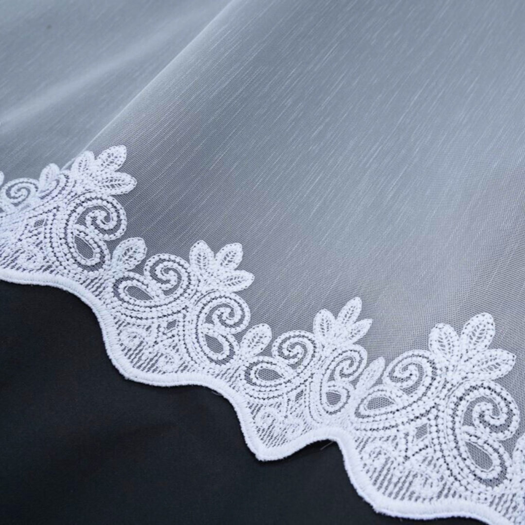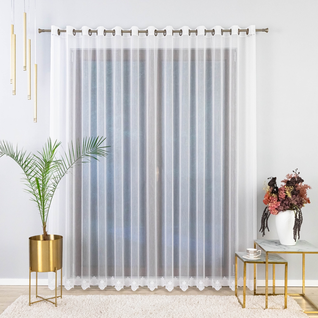 Gotowa firana z białej markizety z subtelnym haftowanym dołem to połączenie elegancji i wygody w codziennym użytkowaniu. Dzięki metalowym przelotkom montaż firany jest szybki i niezwykle prosty – wystarczy ją zawiesić na karniszu rurkowym, by od razu cieszyć się idealnym efektem. Delikatny haft wzdłuż dolnej krawędzi dodaje lekkości i szyku, a gładka, lekko transparentna tkanina pięknie rozprasza światło, rozjaśniając pomieszczenie.