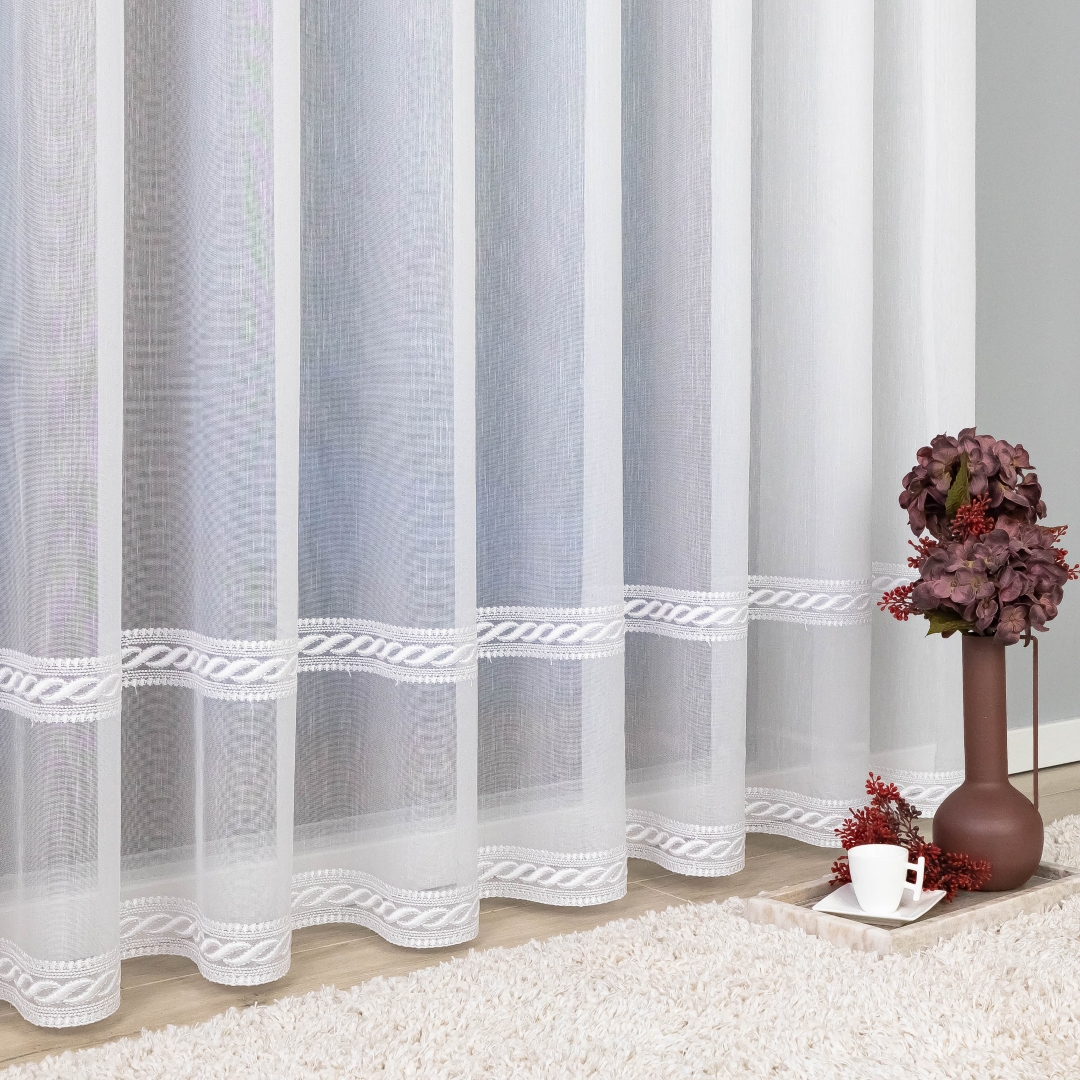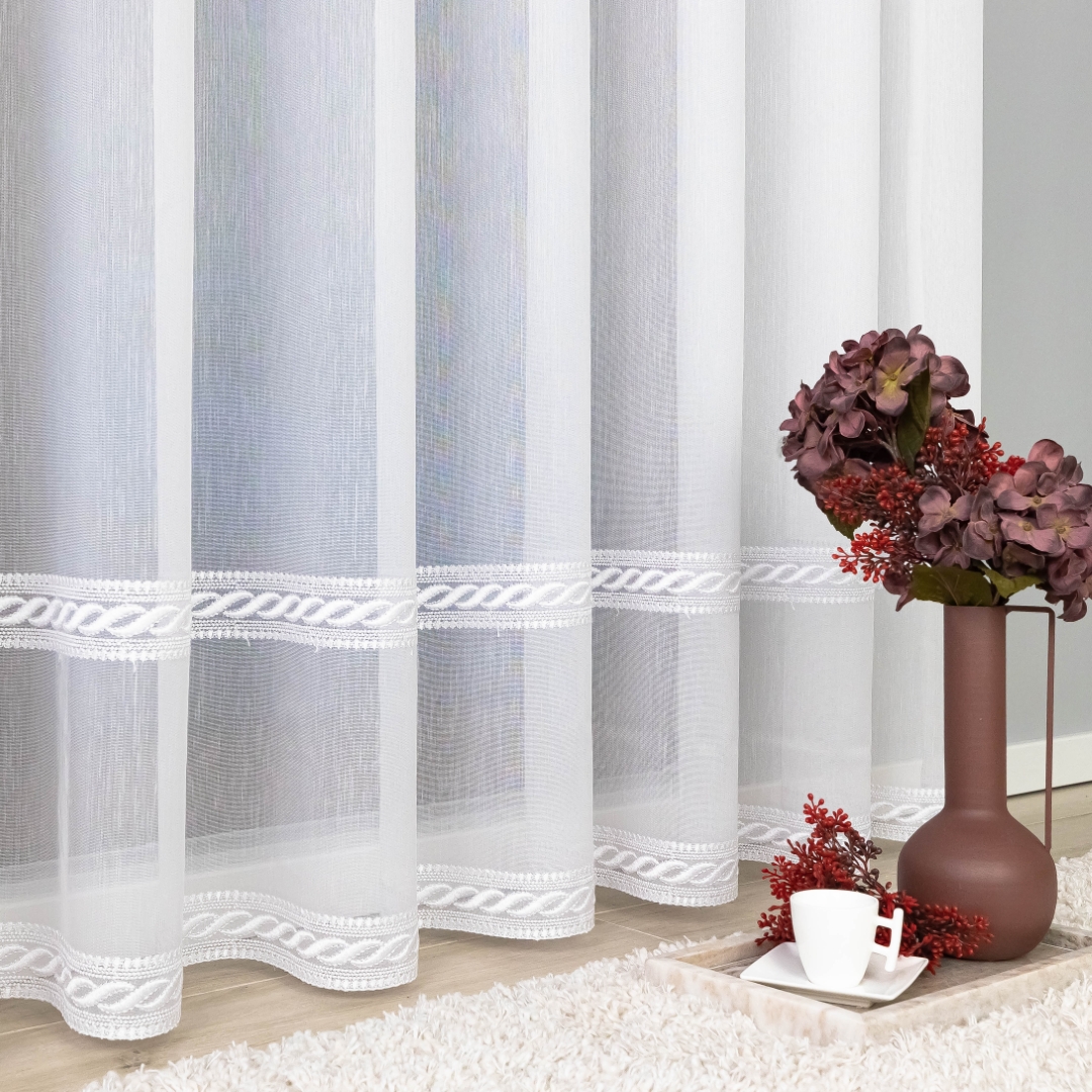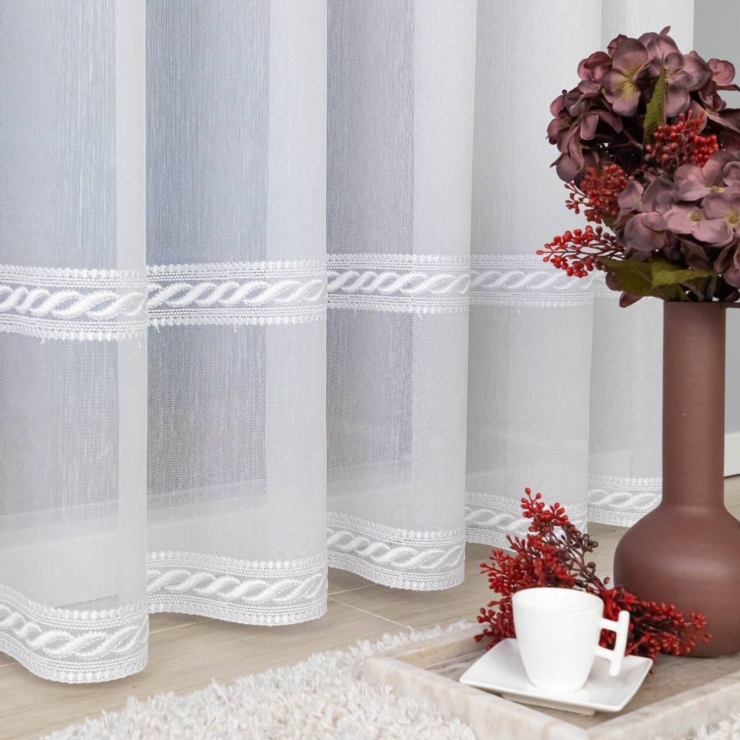 Delikatny haft w formie poziomych pasków umieszczony w dolnej części firany dodaje jej wyrafinowanego uroku i sprawia, że całość prezentuje się elegancko i lekko. Dzięki wszytej taśmie marszczącej firana jest gotowa do zawieszenia od razu po zakupie – to szybkie i wygodne rozwiązanie bez dodatkowych przeróbek.