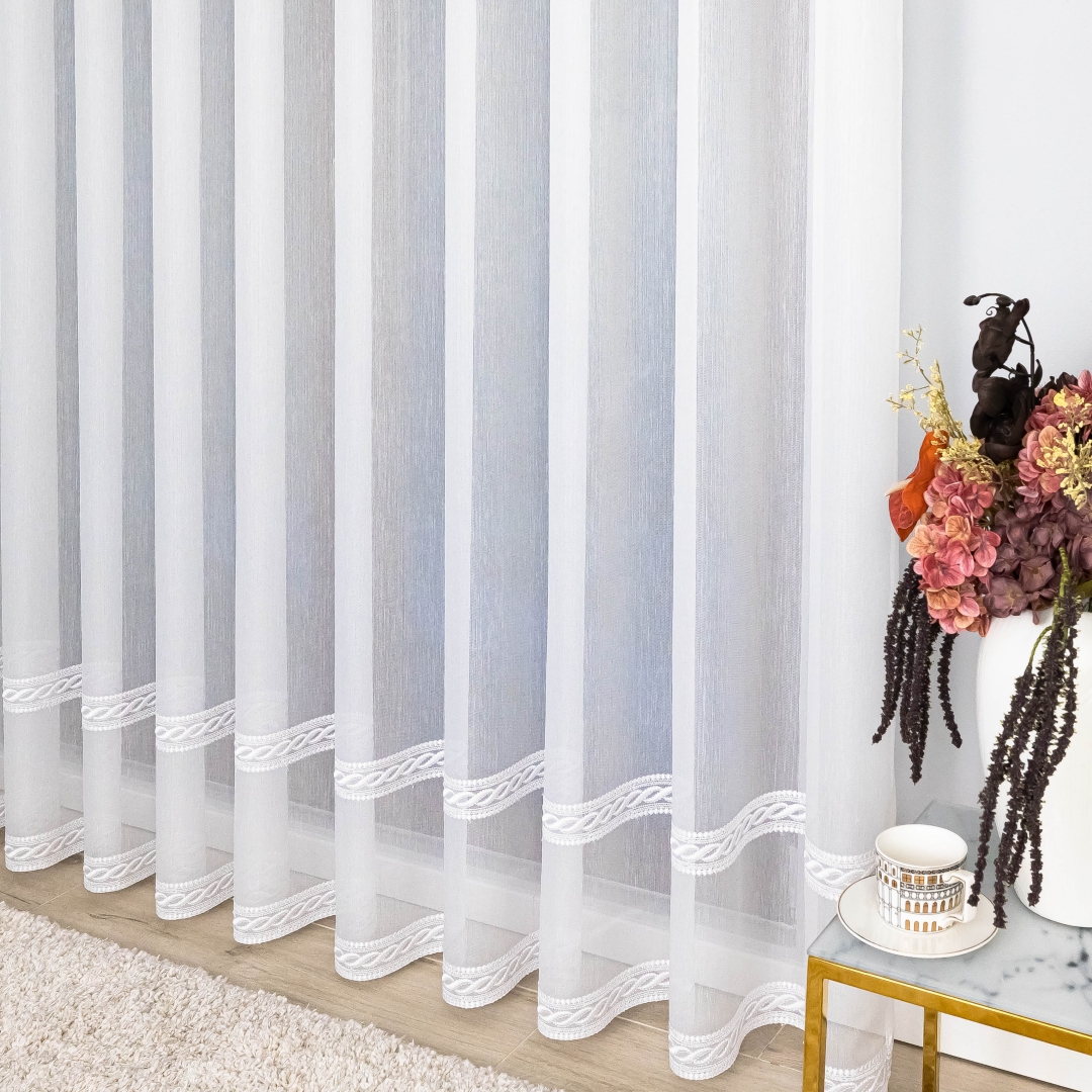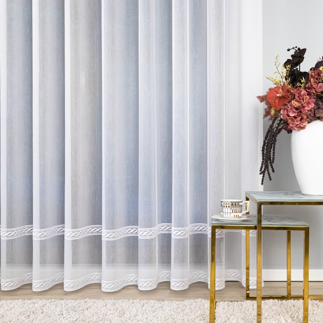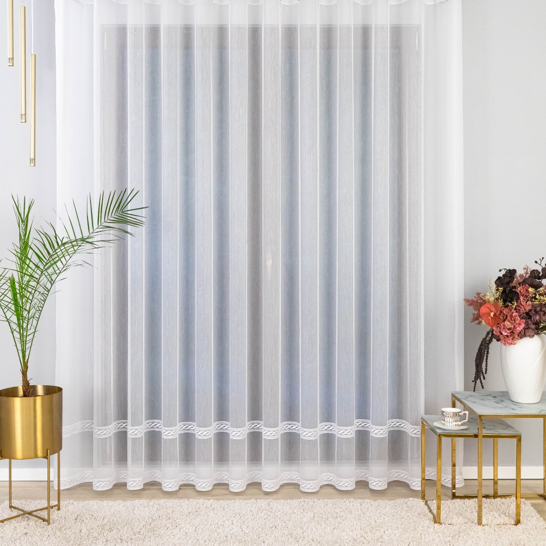 Delikatny haft w formie poziomych pasków umieszczony w dolnej części firany dodaje jej wyrafinowanego uroku i sprawia, że całość prezentuje się elegancko i lekko. Dzięki wszytej taśmie marszczącej firana jest gotowa do zawieszenia od razu po zakupie – to szybkie i wygodne rozwiązanie bez dodatkowych przeróbek.