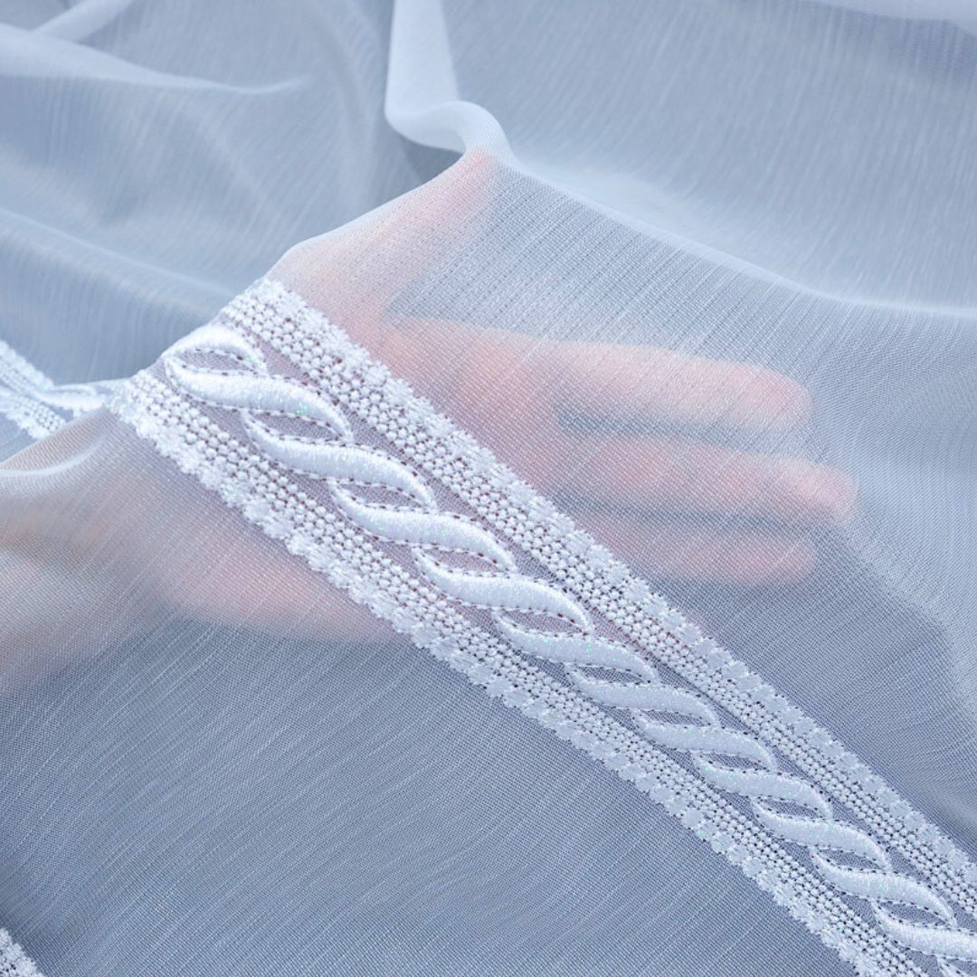 Elegancka gotowa firana markizeta haftowana z ozdobnymi poziomymi paseczkami – z taśmą marszczącą to stylowa i praktyczna dekoracja okienna, która odświeży każde wnętrze. Wykonana z lekkiej markizety o subtelnym połysku, pięknie przepuszcza światło, rozświetlając pomieszczenie i nadając mu eleganckiego charakteru.