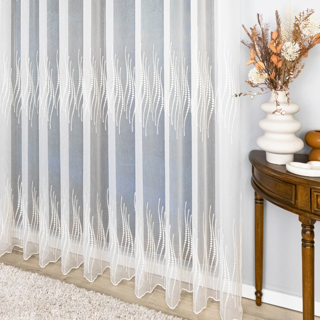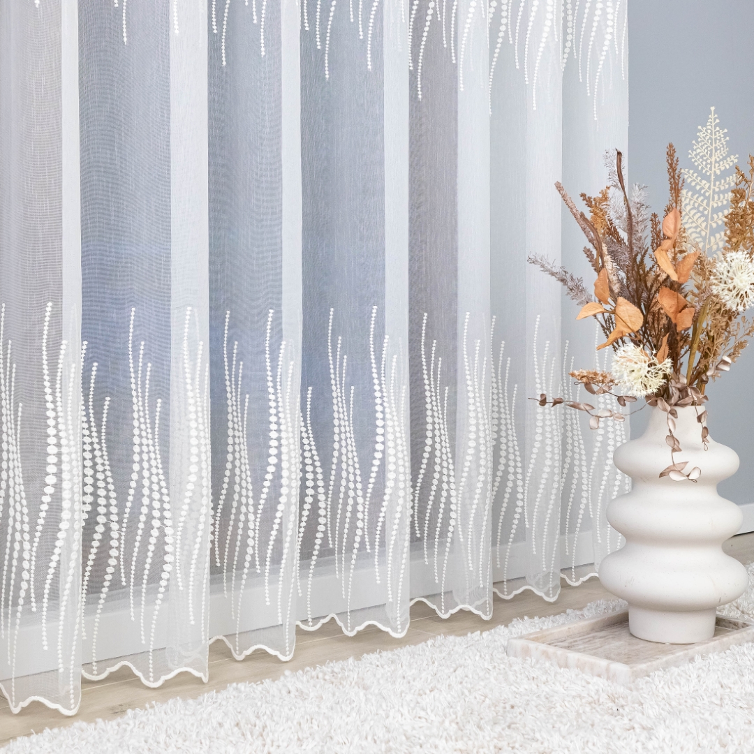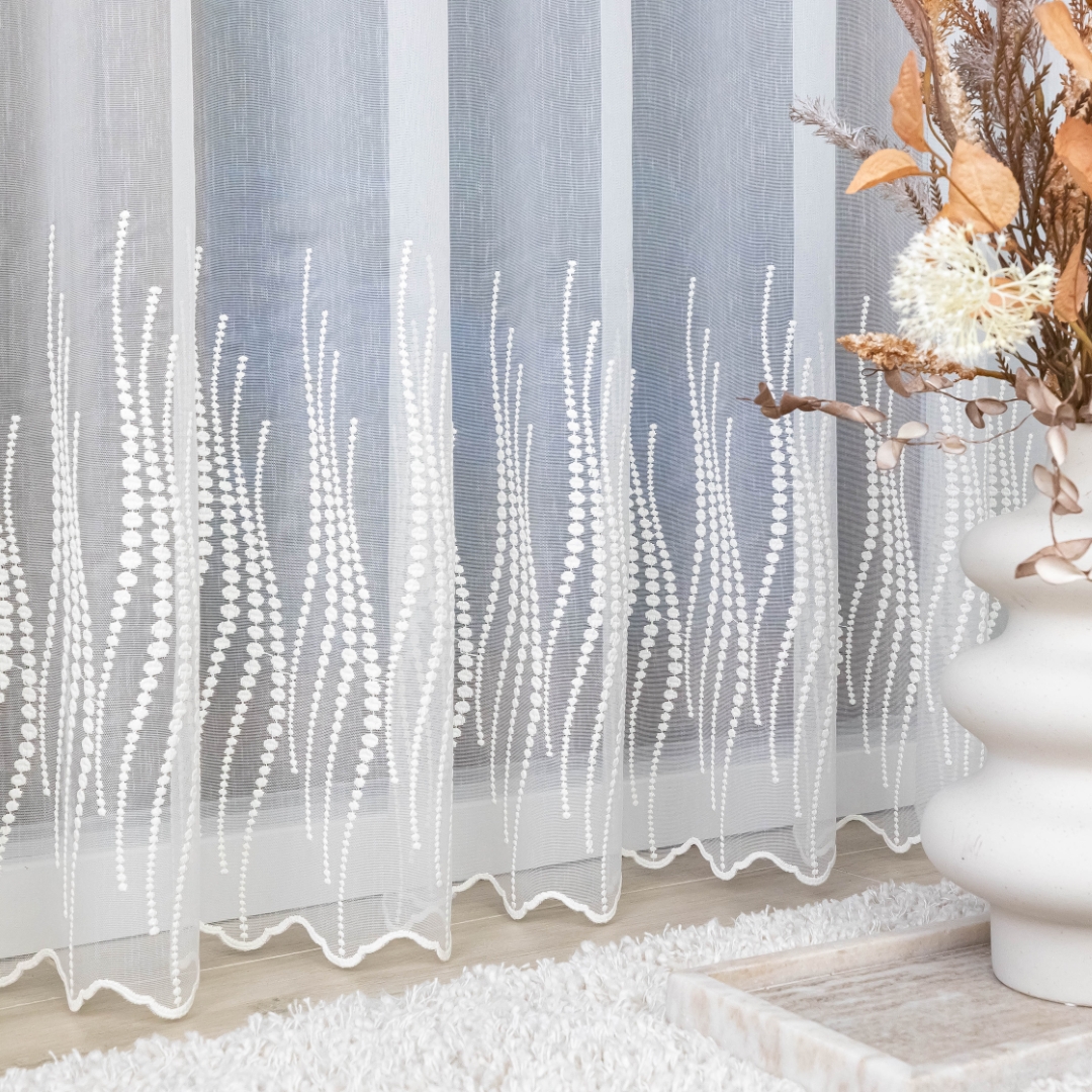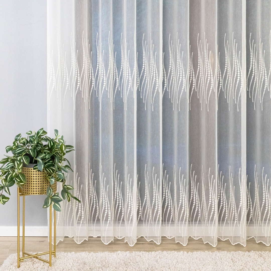Subtelna i stylowa firana kremowa z haftowanym nowoczesnym wzorem to wyjątkowy element dekoracyjny, który wprowadzi do Twojego wnętrza elegancję, lekkość i ciepło. Wykonana z delikatnej tkaniny o drobnym splocie, zdobiona geometryczno-organicznym haftem przypominającym falujące trawy lub smukłe gałązki. Jej kremowy odcień pięknie ociepla przestrzeń, tworząc przytulną, a jednocześnie wyrafinowaną atmosferę.