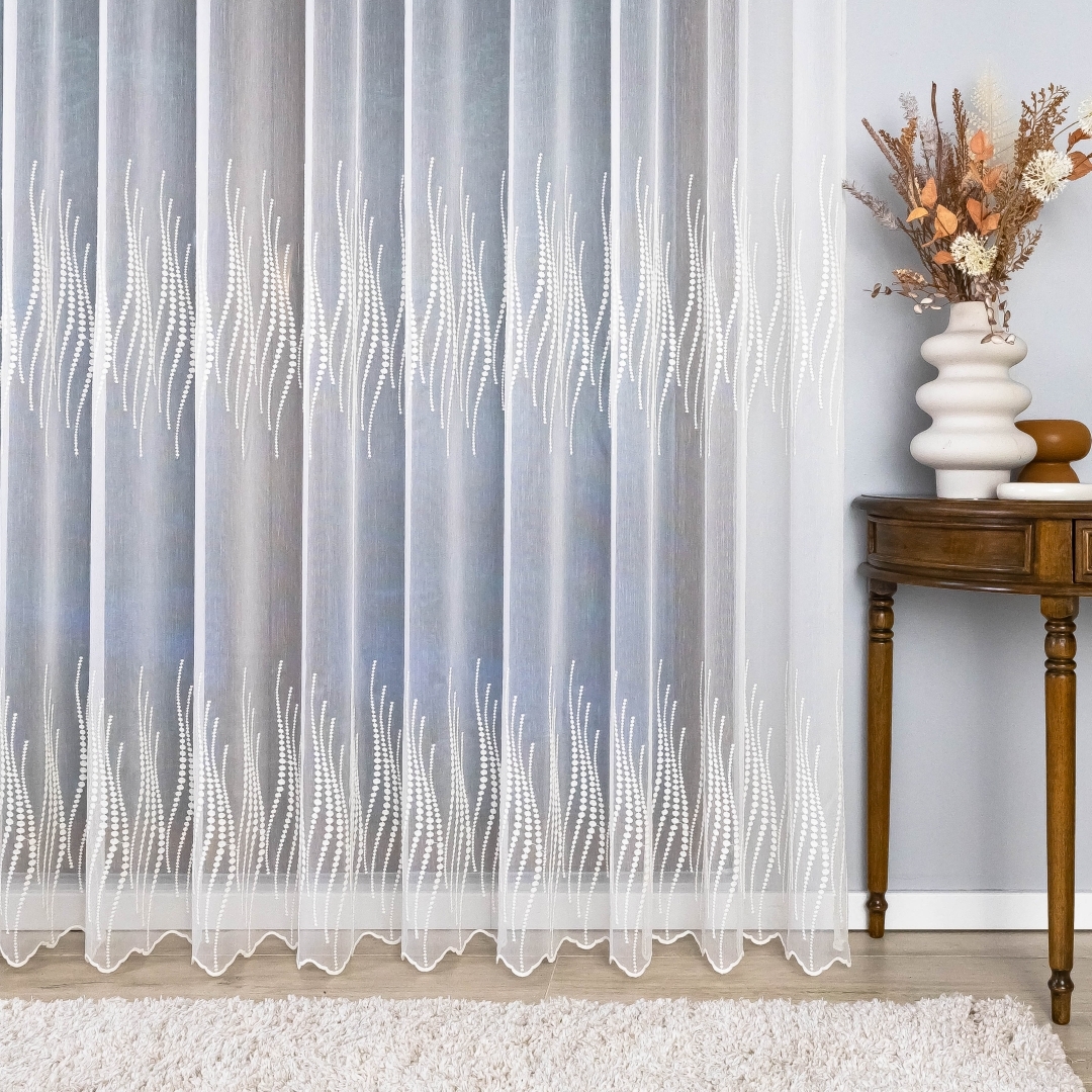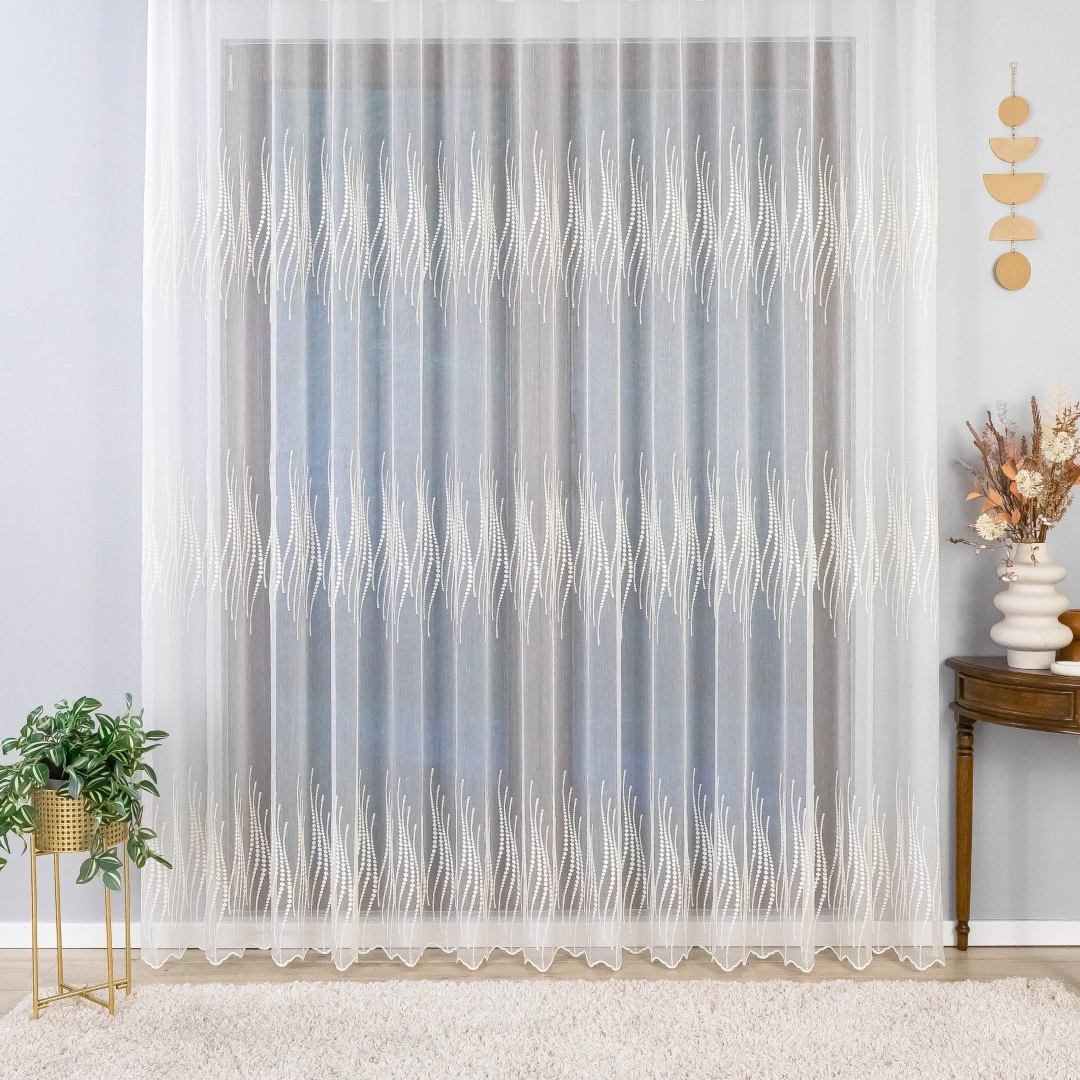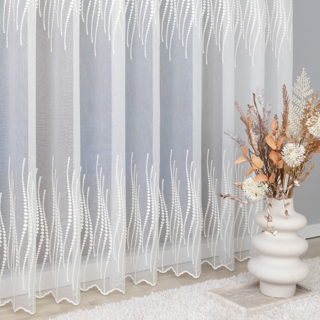 Subtelna i stylowa firana kremowa z haftowanym nowoczesnym wzorem to wyjątkowy element dekoracyjny, który wprowadzi do Twojego wnętrza elegancję, lekkość i ciepło. Wykonana z delikatnej tkaniny o drobnym splocie, zdobiona geometryczno-organicznym haftem przypominającym falujące trawy lub smukłe gałązki. Jej kremowy odcień pięknie ociepla przestrzeń, tworząc przytulną, a jednocześnie wyrafinowaną atmosferę.