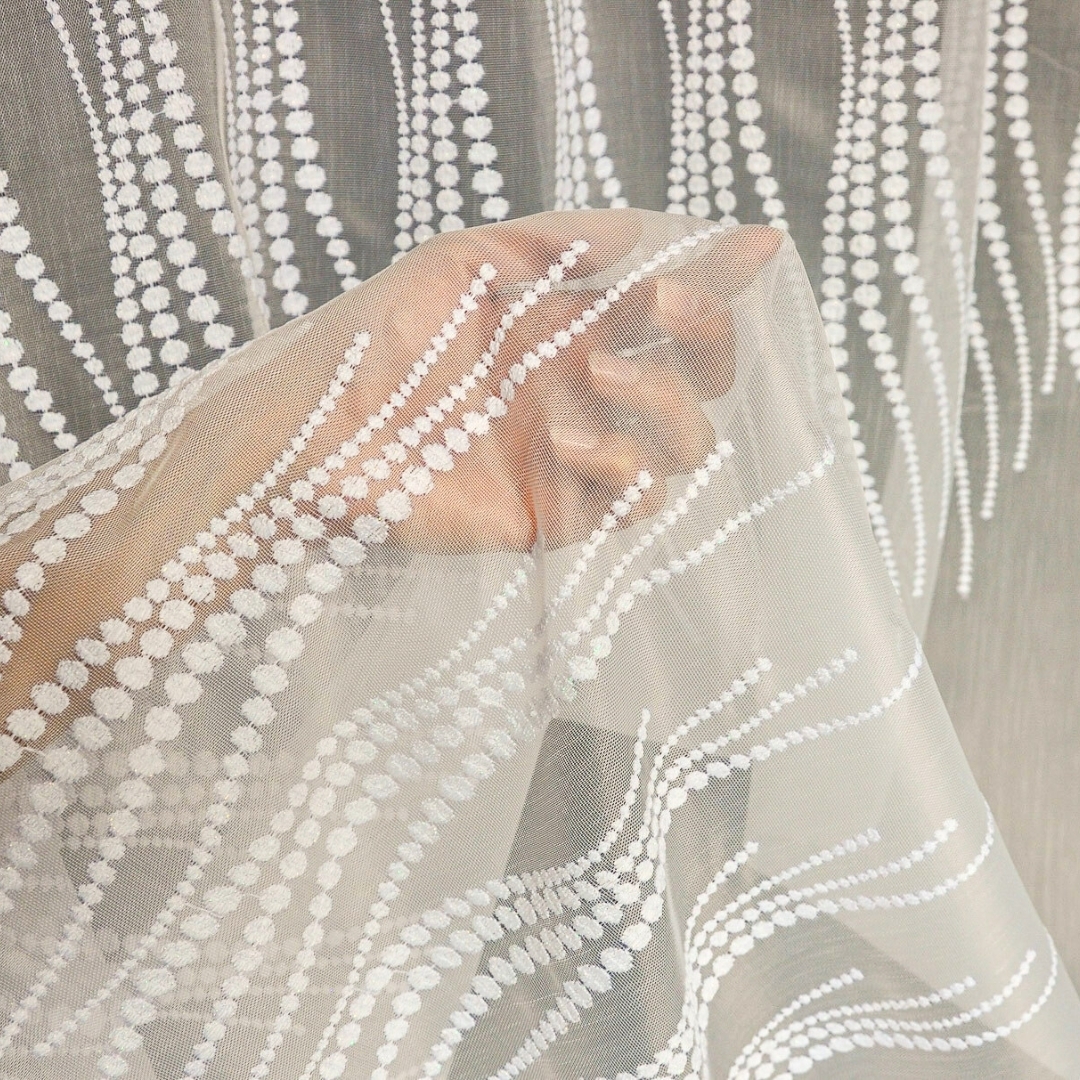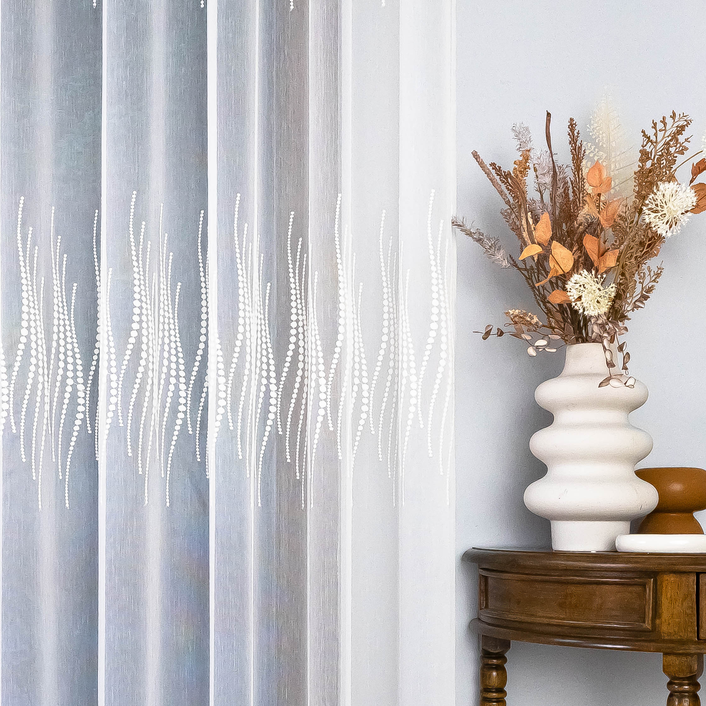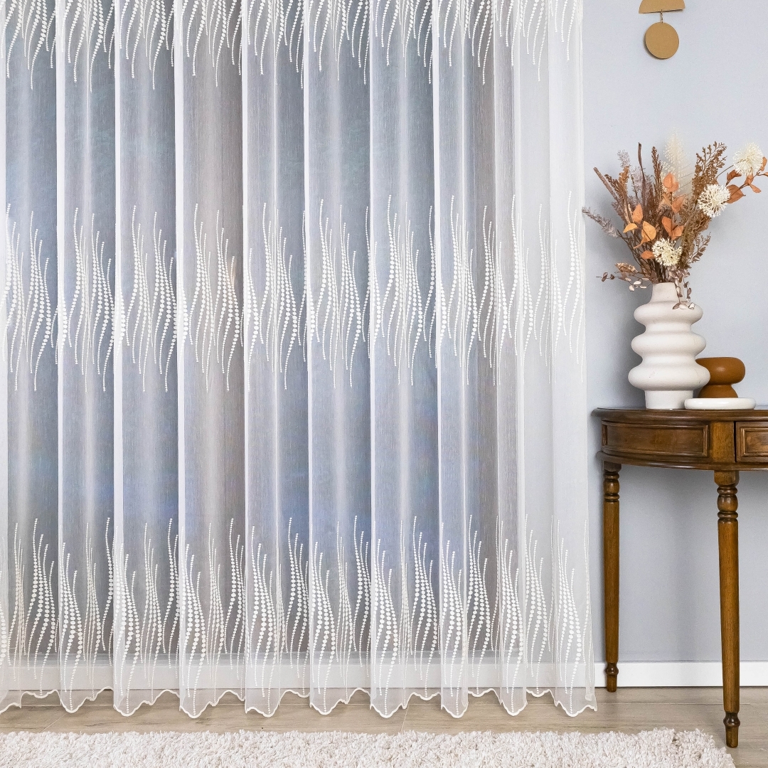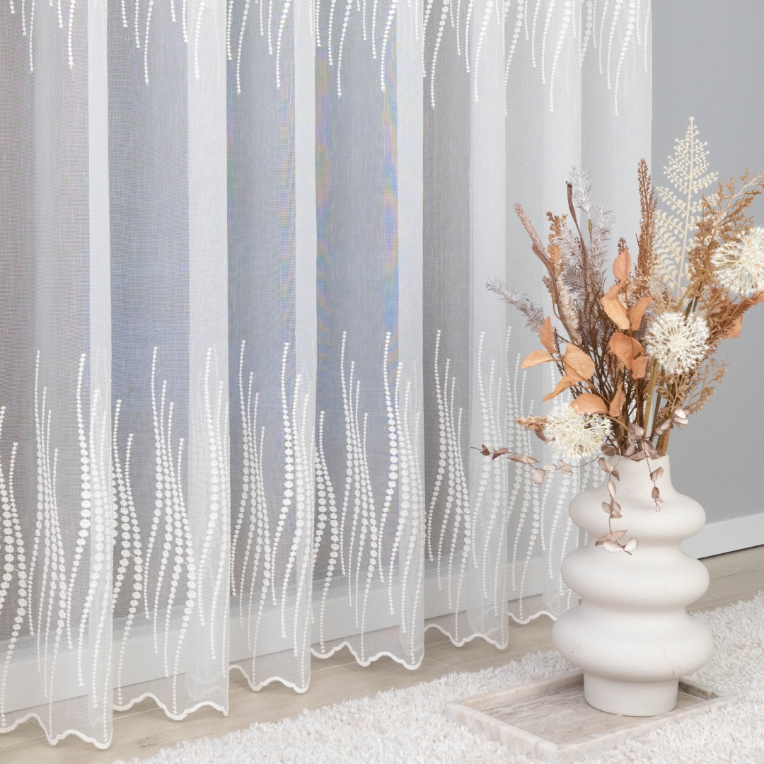 Subtelna i stylowa firana kremowa z haftowanym nowoczesnym wzorem to wyjątkowy element dekoracyjny, który wprowadzi do Twojego wnętrza elegancję, lekkość i ciepło. Wykonana z delikatnej tkaniny o drobnym splocie, zdobiona geometryczno-organicznym haftem przypominającym falujące trawy lub smukłe gałązki. Jej kremowy odcień pięknie ociepla przestrzeń, tworząc przytulną, a jednocześnie wyrafinowaną atmosferę.
