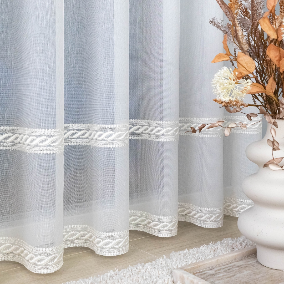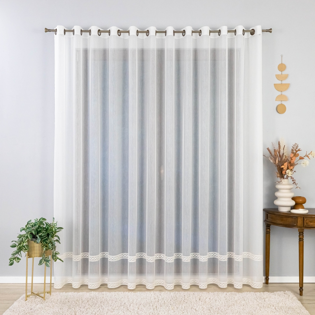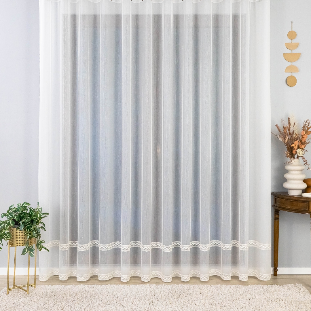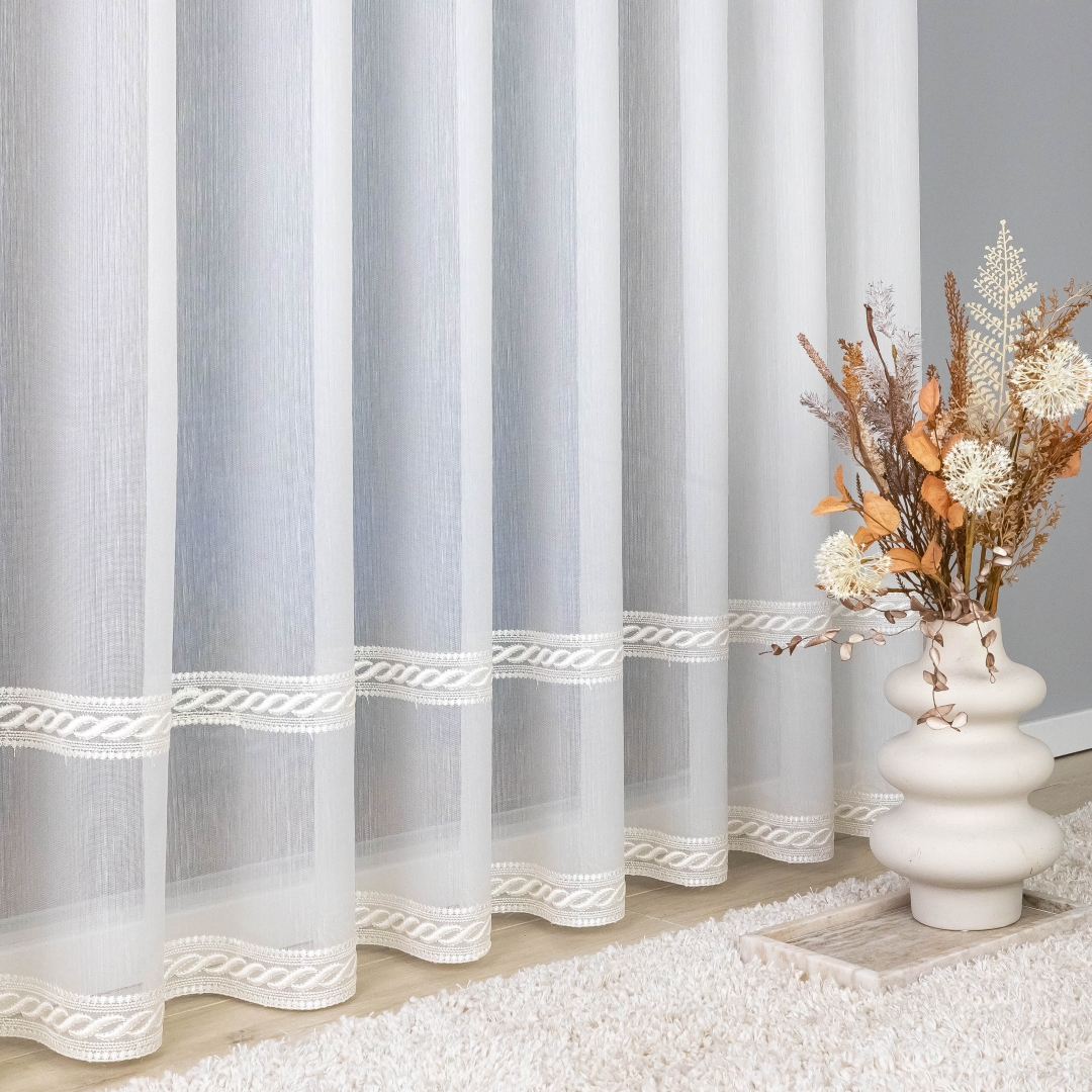 Haftowany wzór w formie ozdobnych, poziomych paseczków umieszczony w dolnej części firany nadaje jej lekkości i elegancji. Dzięki metalowym przelotkom firana jest gotowa do zawieszenia od razu po zakupie – montaż jest szybki, wygodny i wyjątkowo estetyczny.