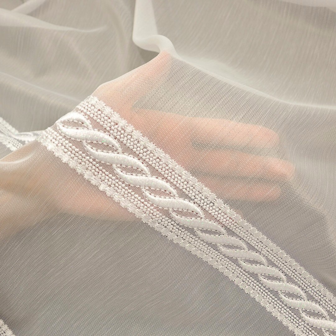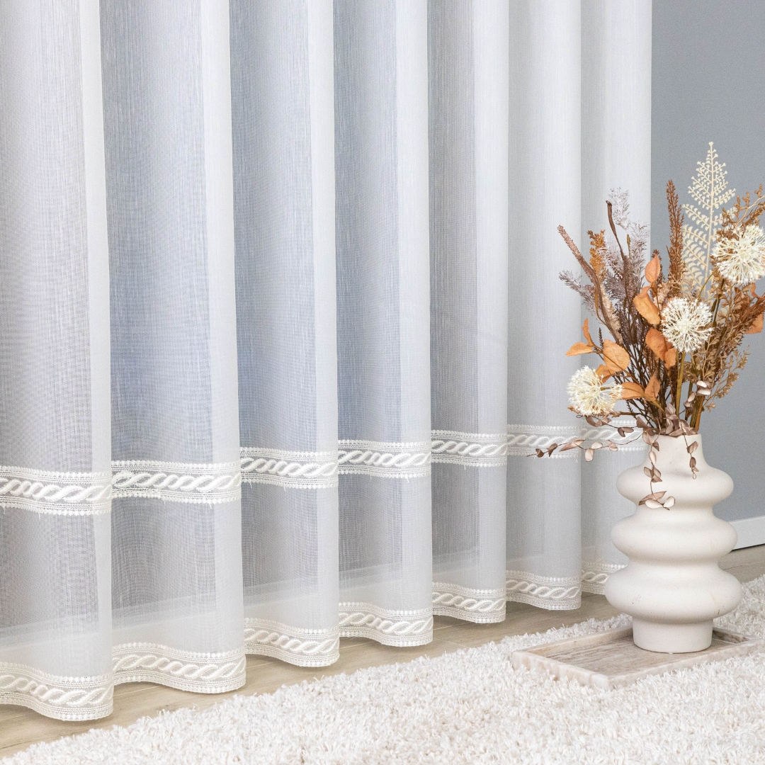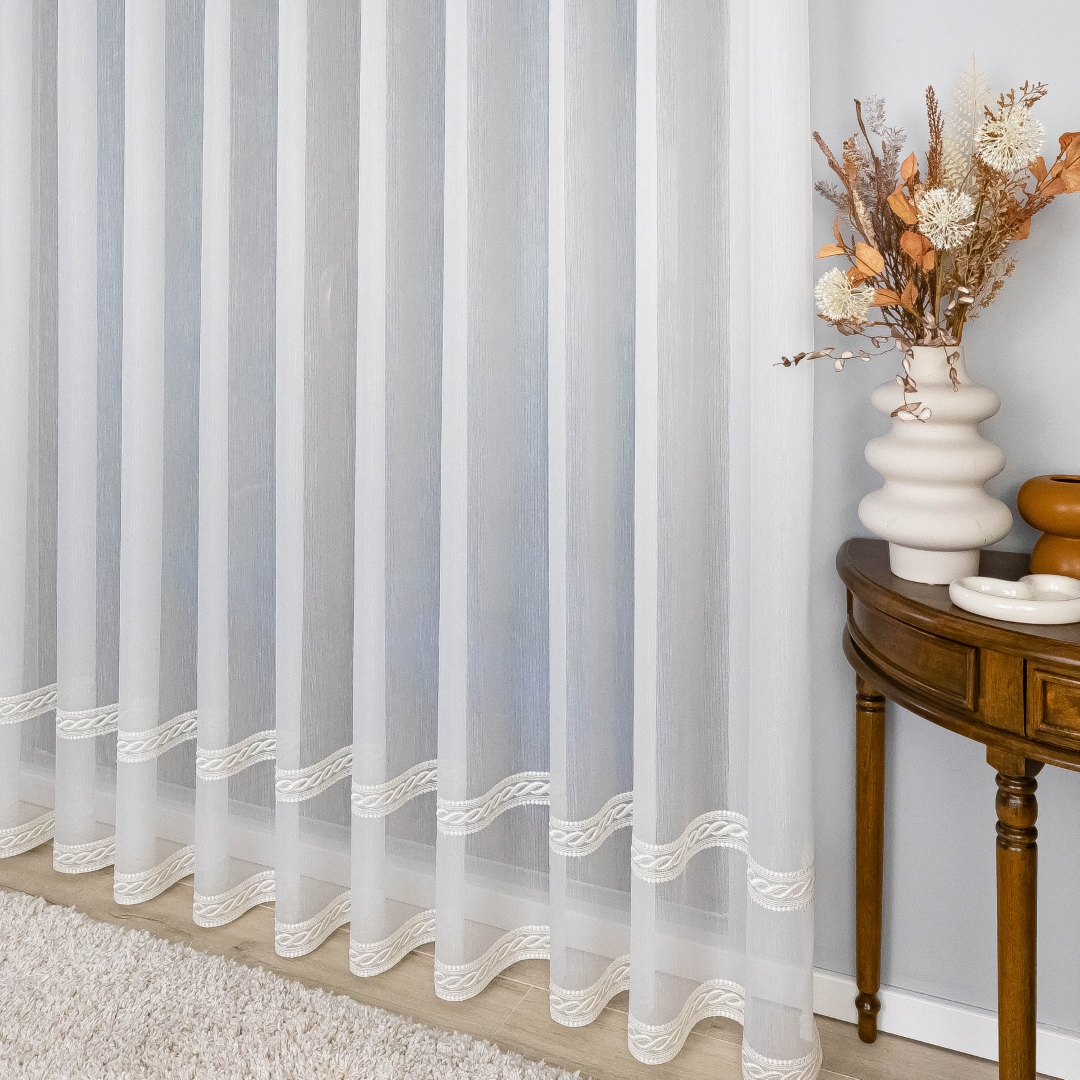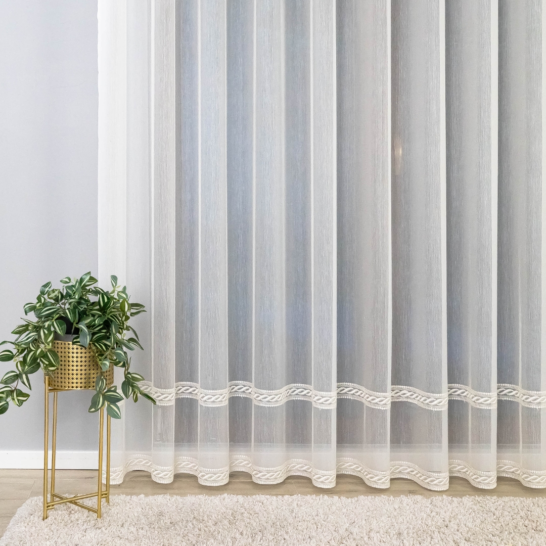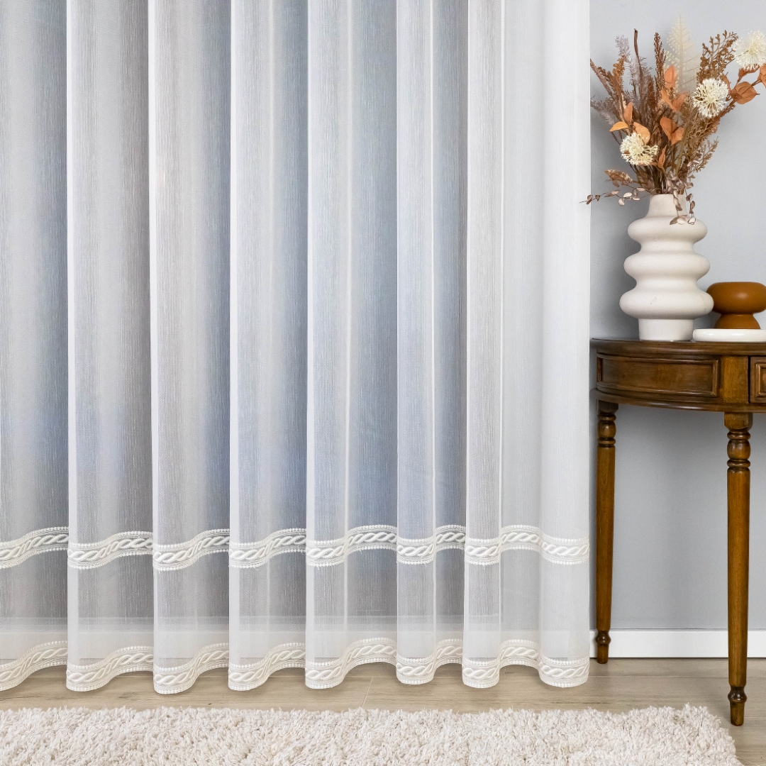 Haftowany wzór w formie ozdobnych, poziomych paseczków umieszczony w dolnej części firany nadaje jej lekkości i elegancji. Dzięki metalowym przelotkom firana jest gotowa do zawieszenia od razu po zakupie – montaż jest szybki, wygodny i wyjątkowo estetyczny.