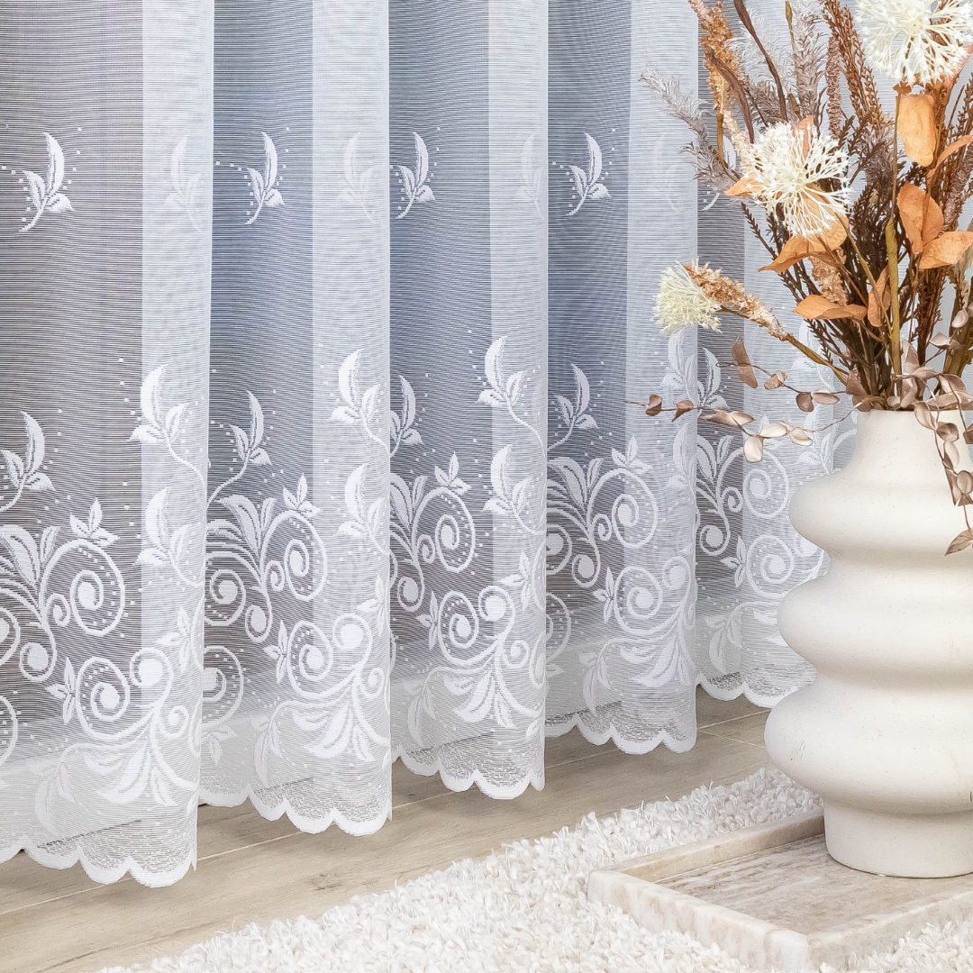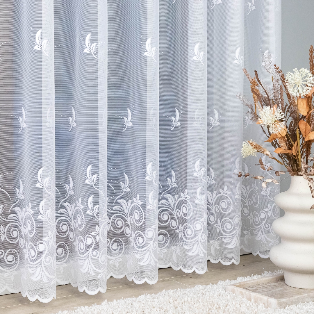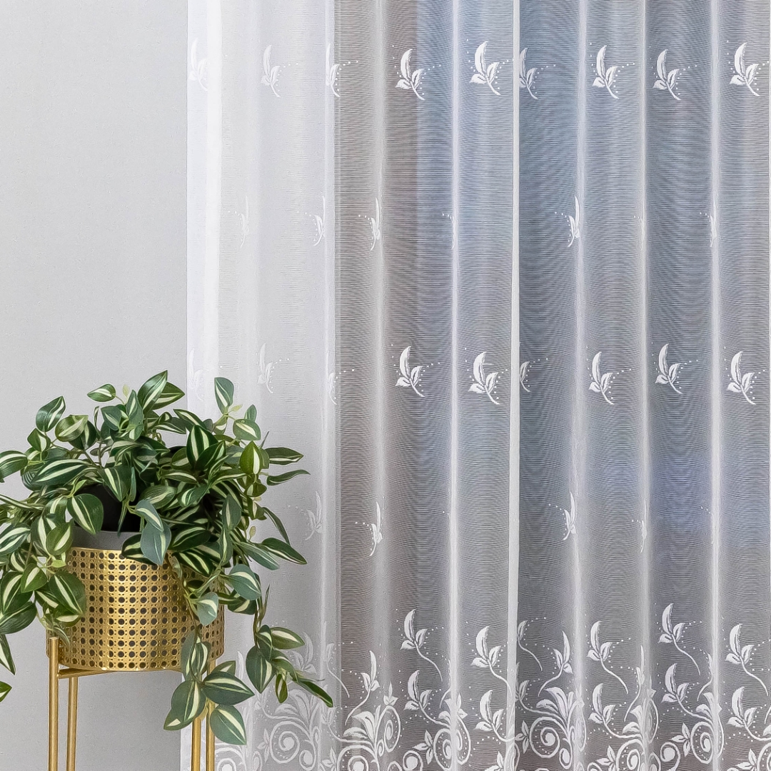 Na tkaninie widoczny jest delikatny motyw roślinny, rozmieszczony w regularny sposób, a ozdobny pas w dolnej części nadaje firanie elegancki charakter.