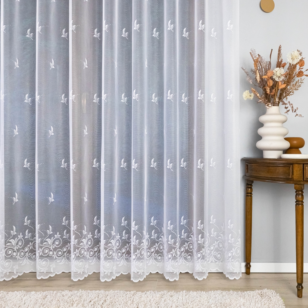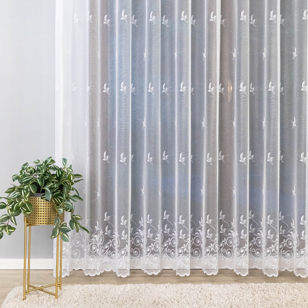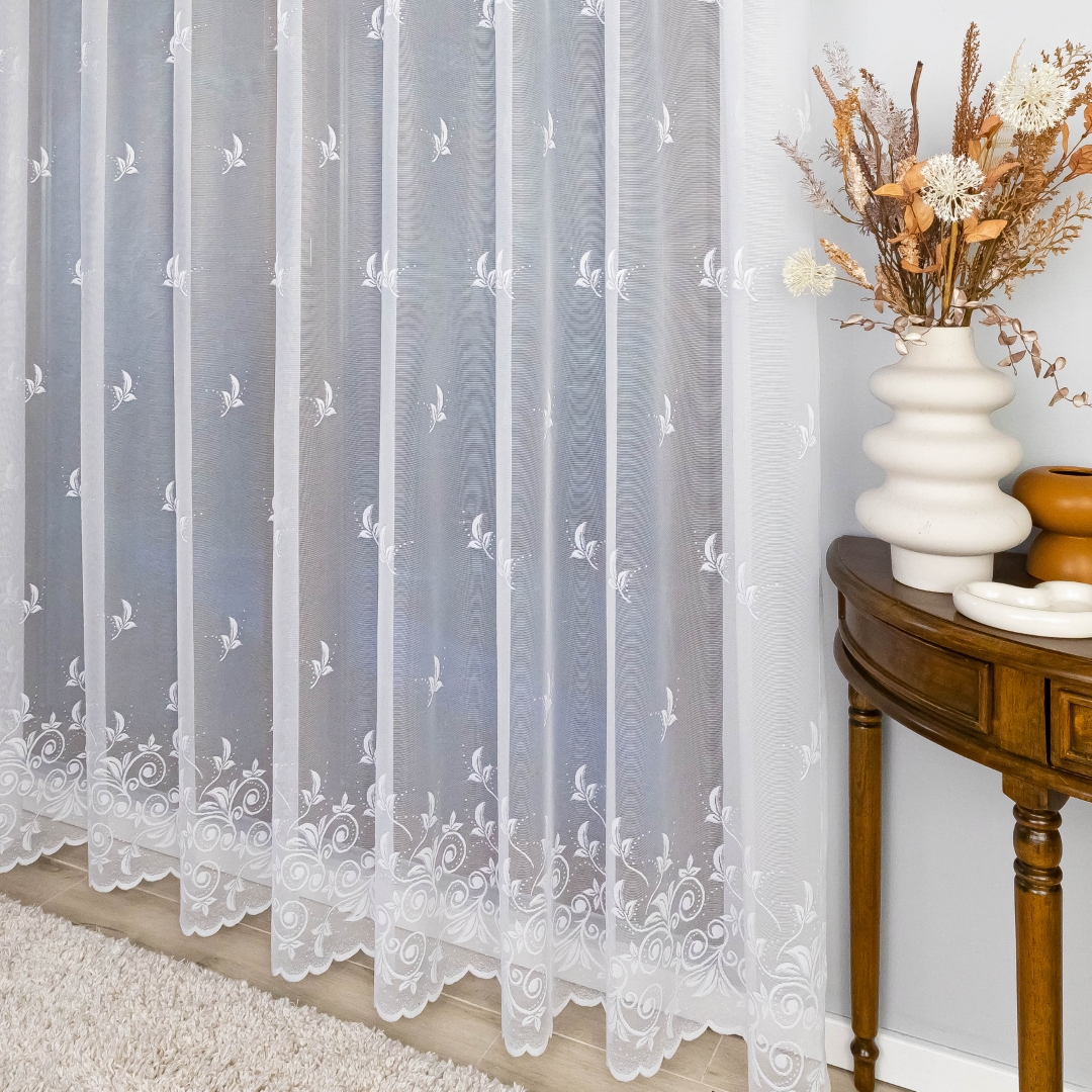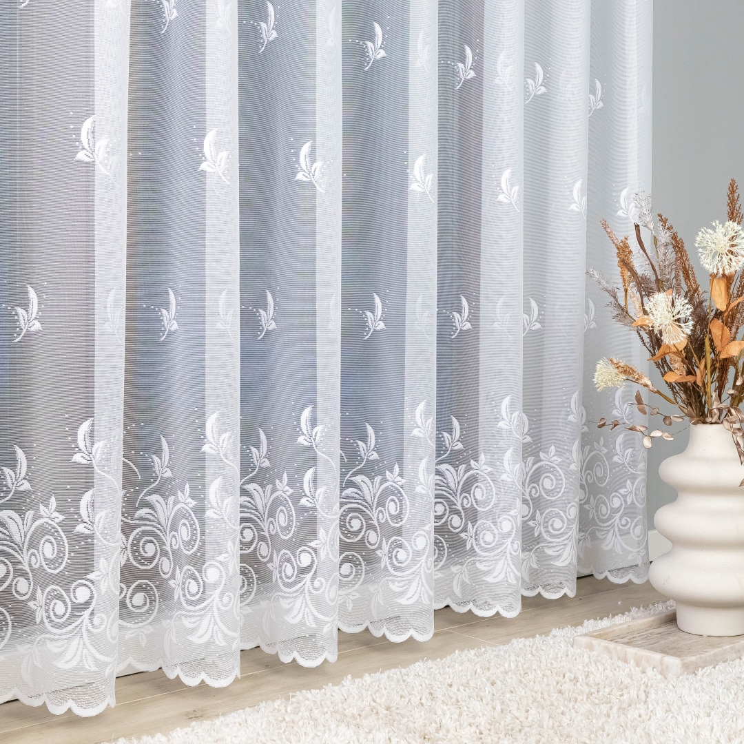 Na tkaninie widoczny jest delikatny motyw roślinny, rozmieszczony w regularny sposób, a ozdobny pas w dolnej części nadaje firanie elegancki charakter.