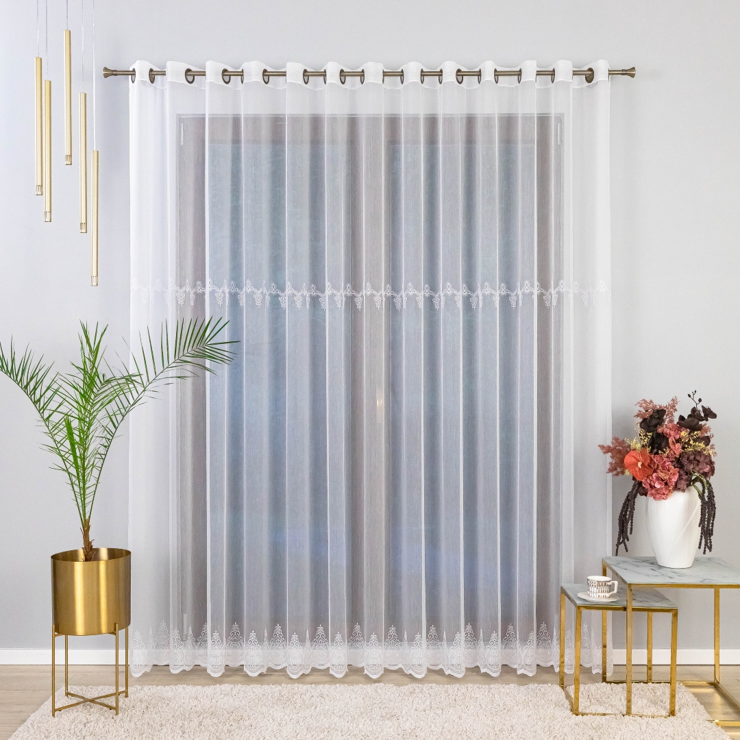 Dzięki metalowym przelotkom montaż firany jest szybki i wygodny – wystarczy zawiesić ją na karniszu, bez dodatkowych akcesoriów. To rozwiązanie sprawdzi się w salonie, sypialni, jadalni i pokoju gościnnym, podkreślając ich charakter i dodając im lekkości.
