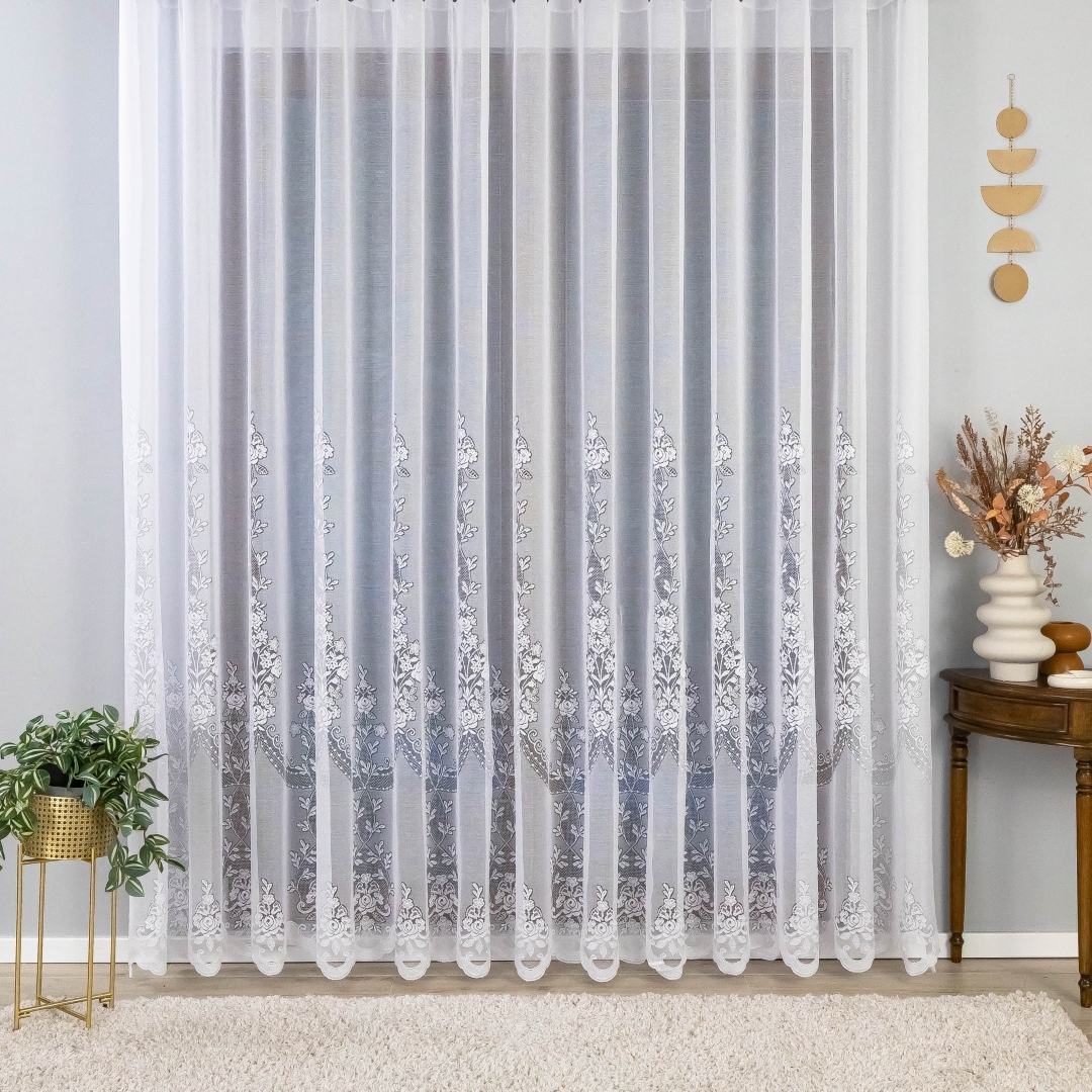 Dół firany wykończony jest ozdobnym łukiem z delikatnym zdobieniem, co nadaje całości stylowy, klasyczny charakter.