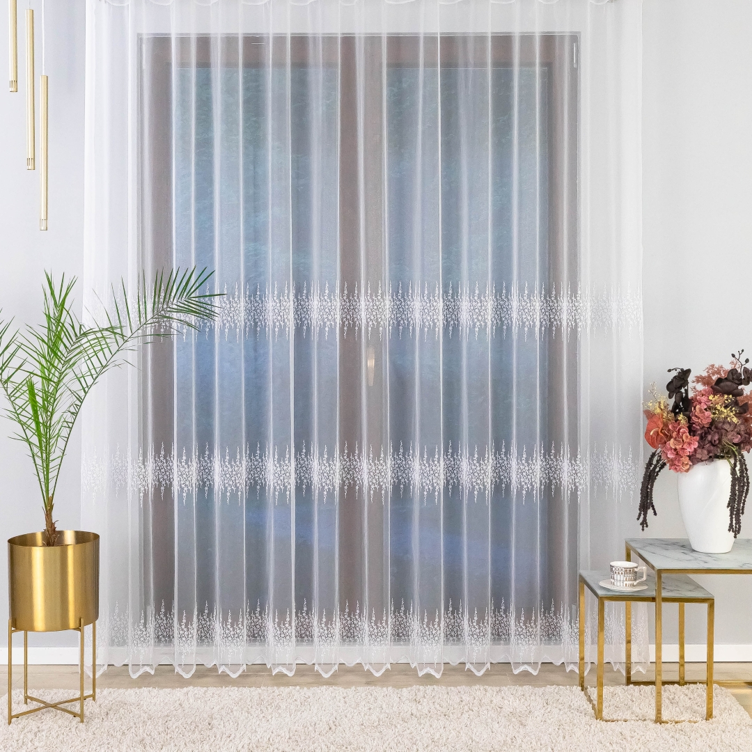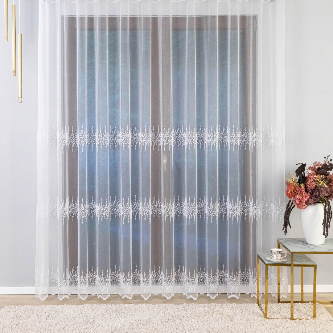 Firana zdobiona jest trzema pasami haftowanego wzoru, które nadają jej lekkości i harmonii. Dzięki wszytej taśmie marszczącej jest gotowa do zawieszenia zaraz po zakupie – bez dodatkowego szycia i dopasowywania.
