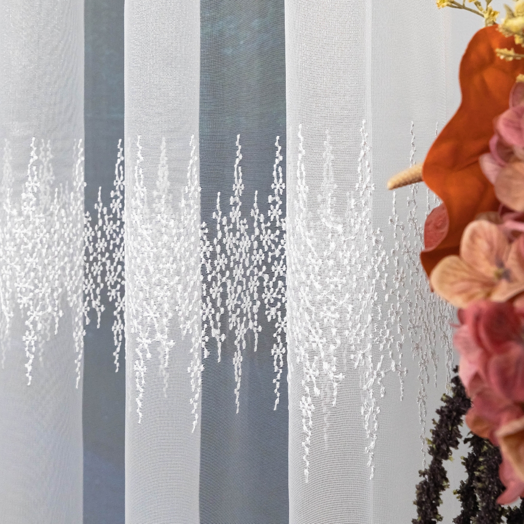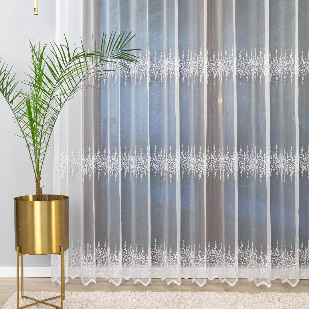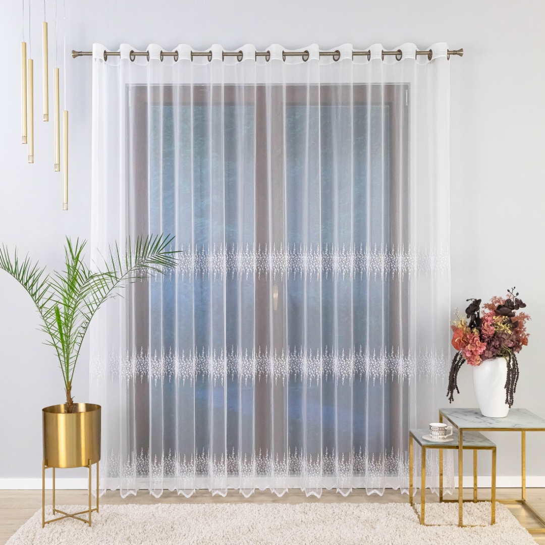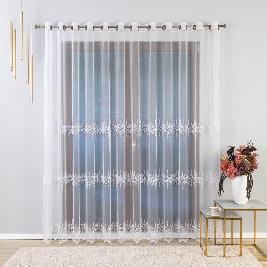 Firana zdobiona jest trzema pasami haftowanego wzoru, co tworzy elegancki i harmonijny efekt na oknie. Metalowe przelotki sprawiają, że montaż firany jest szybki i wygodny – wystarczy ją zawiesić na karniszu bez dodatkowych taśm czy haczyków.