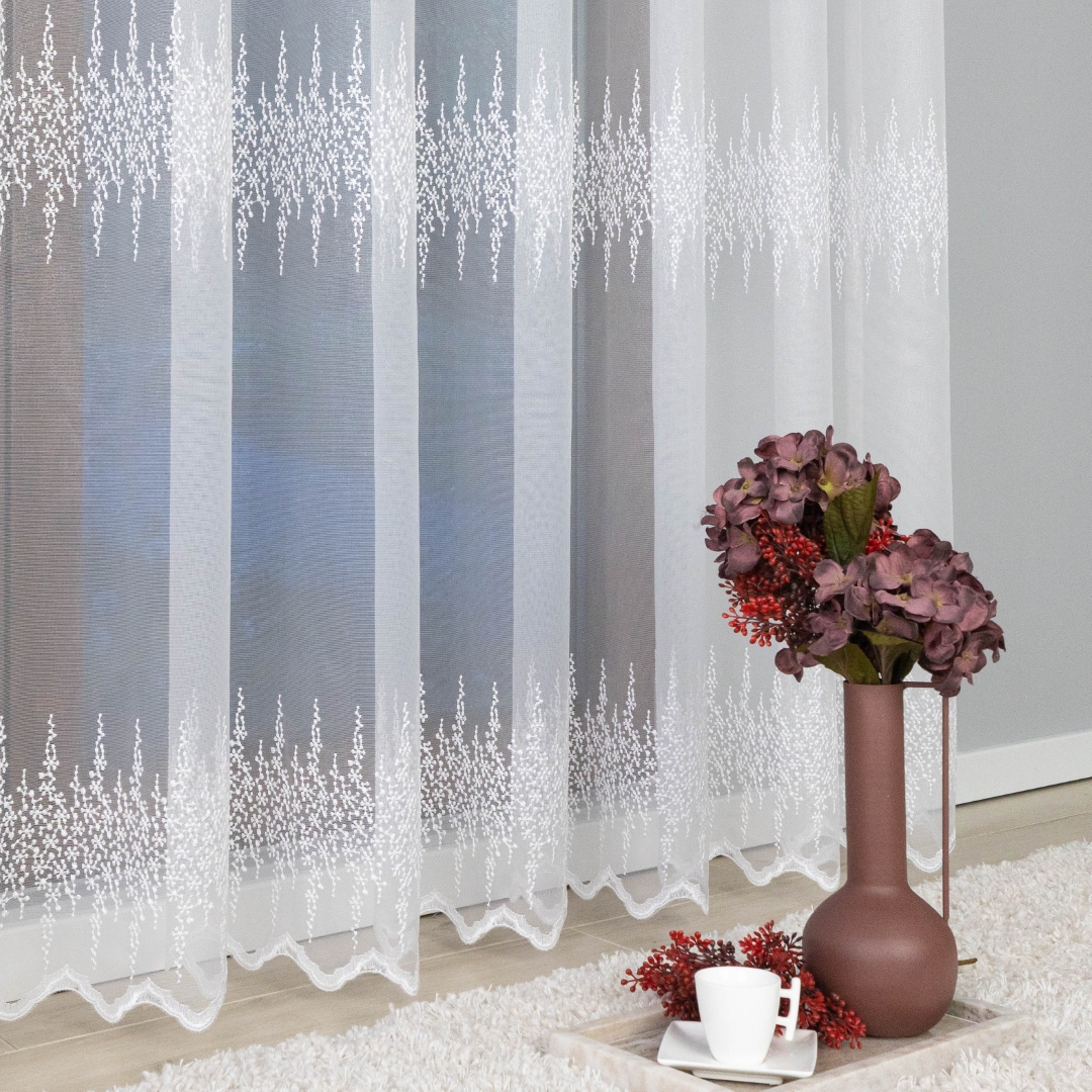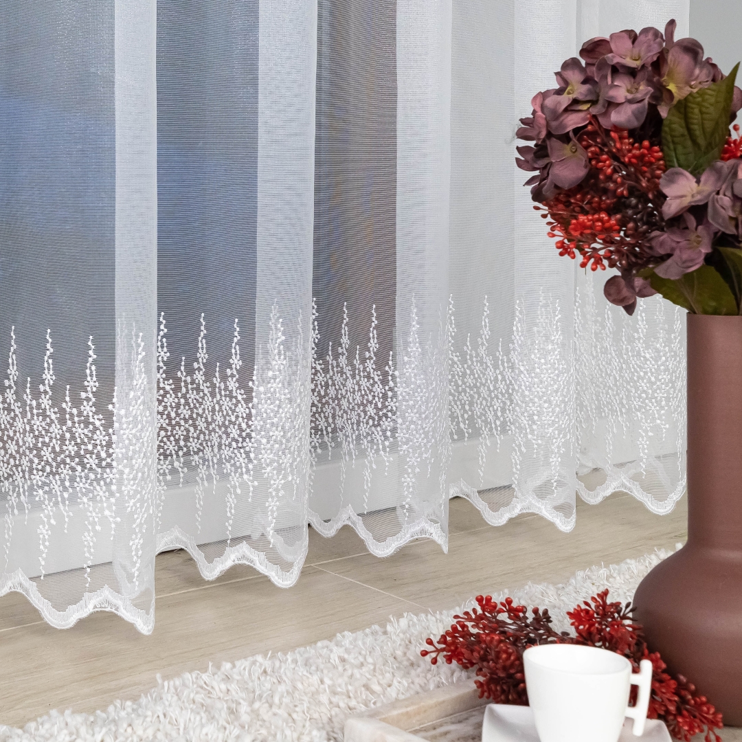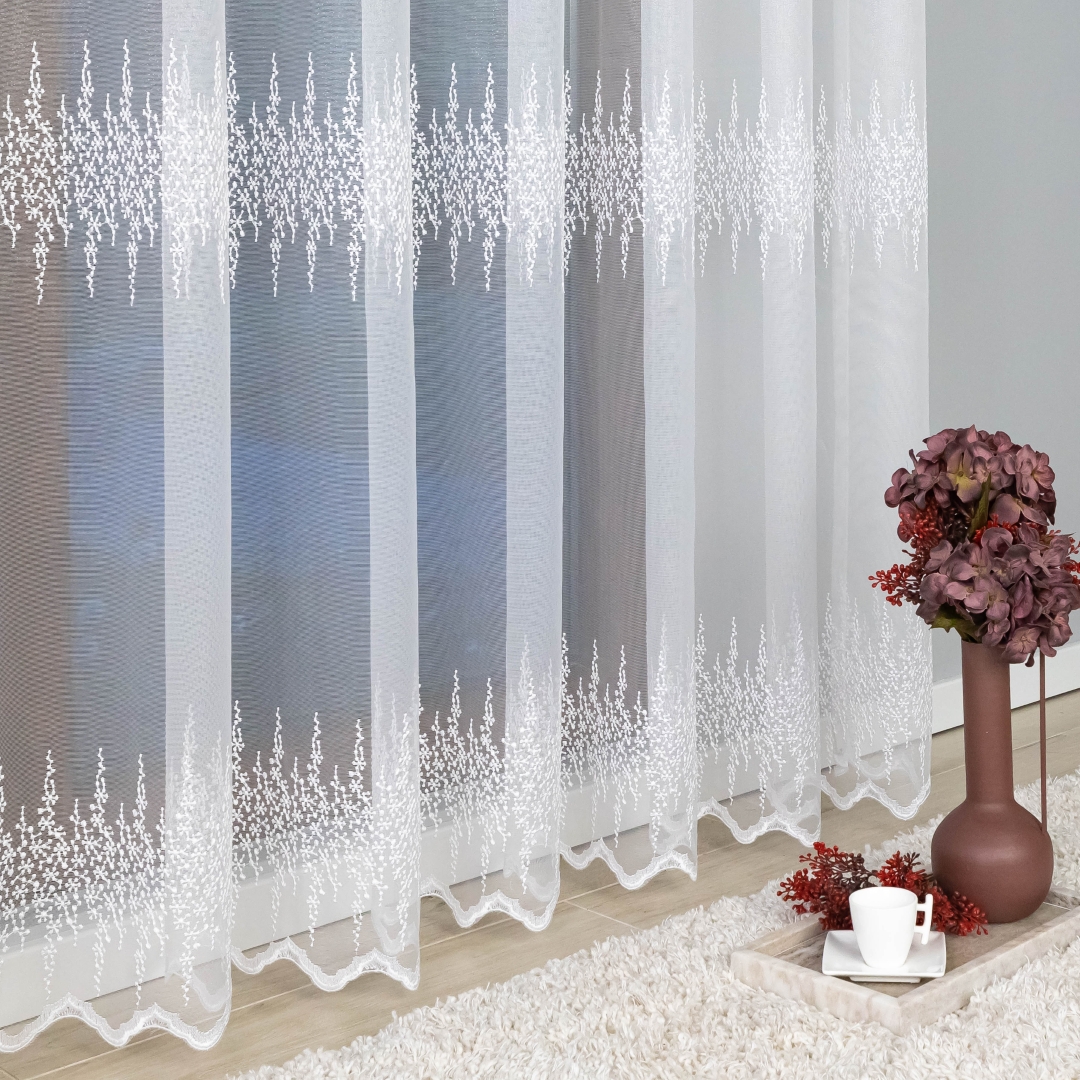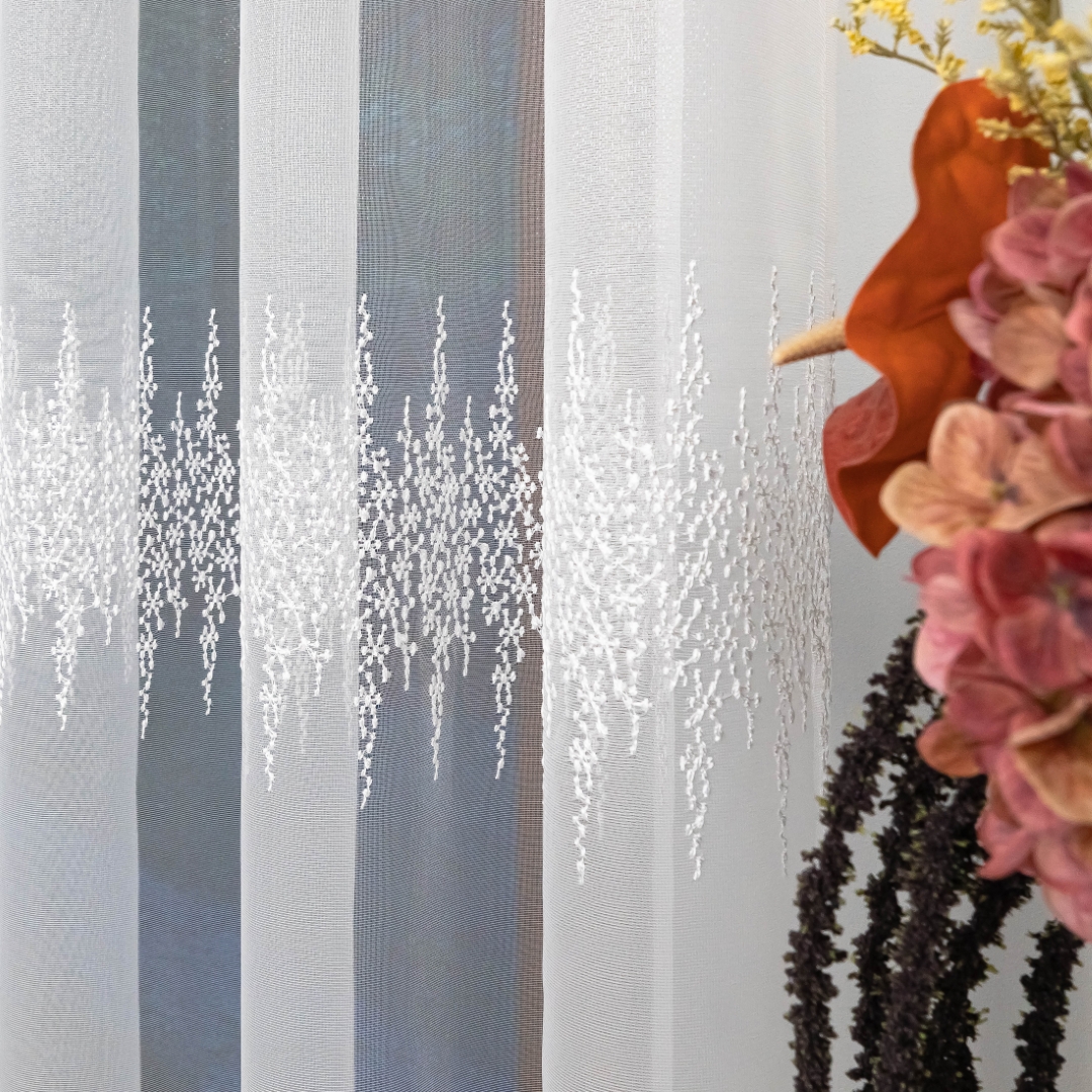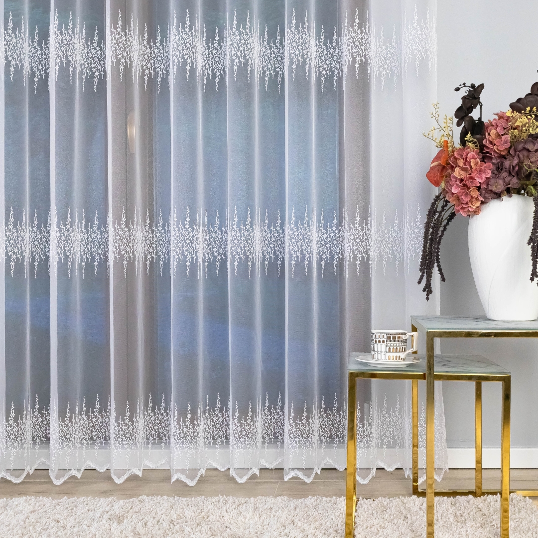 Firana zdobiona jest trzema pasami haftowanego wzoru, co tworzy elegancki i harmonijny efekt na oknie. Metalowe przelotki sprawiają, że montaż firany jest szybki i wygodny – wystarczy ją zawiesić na karniszu bez dodatkowych taśm czy haczyków.