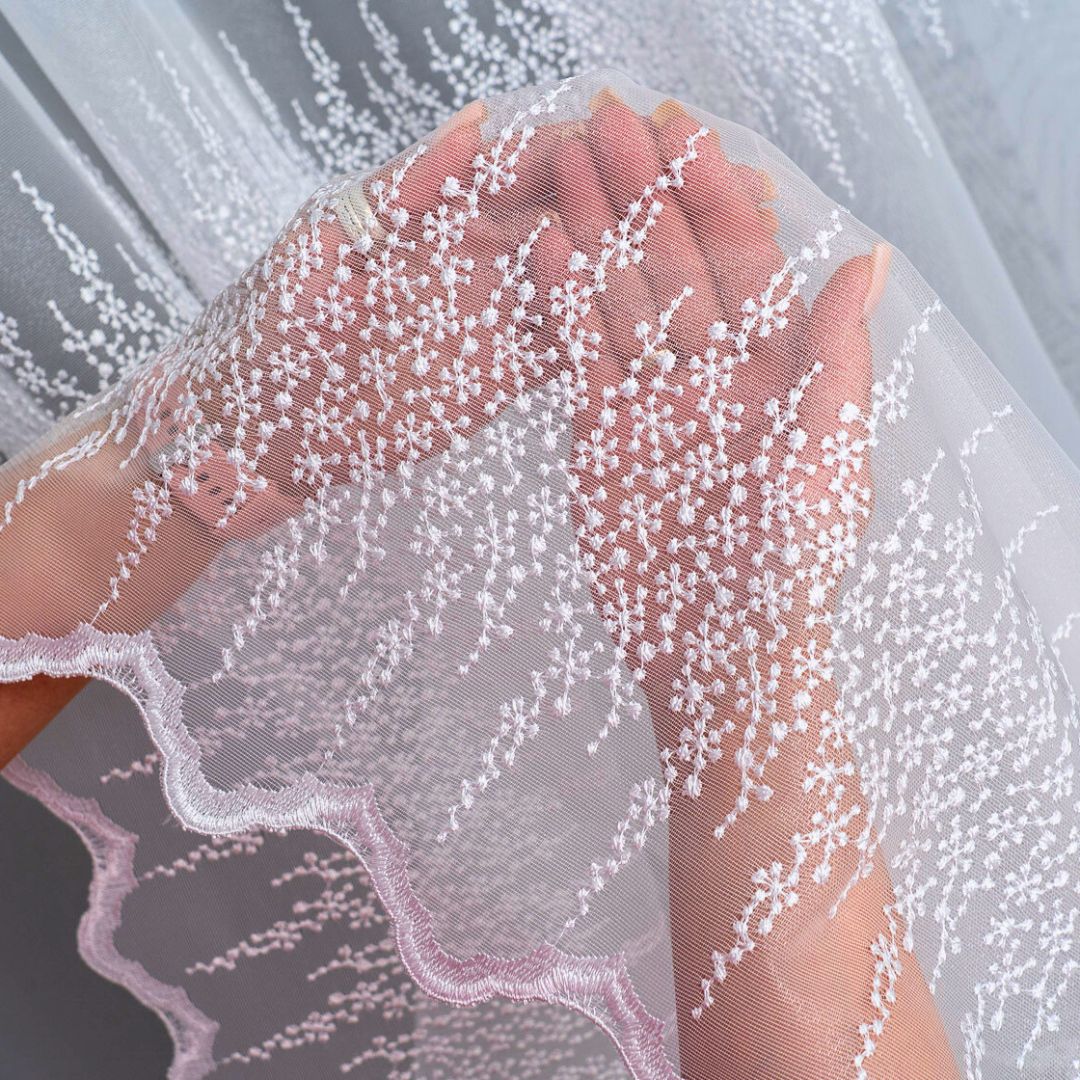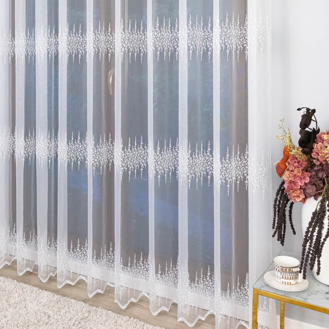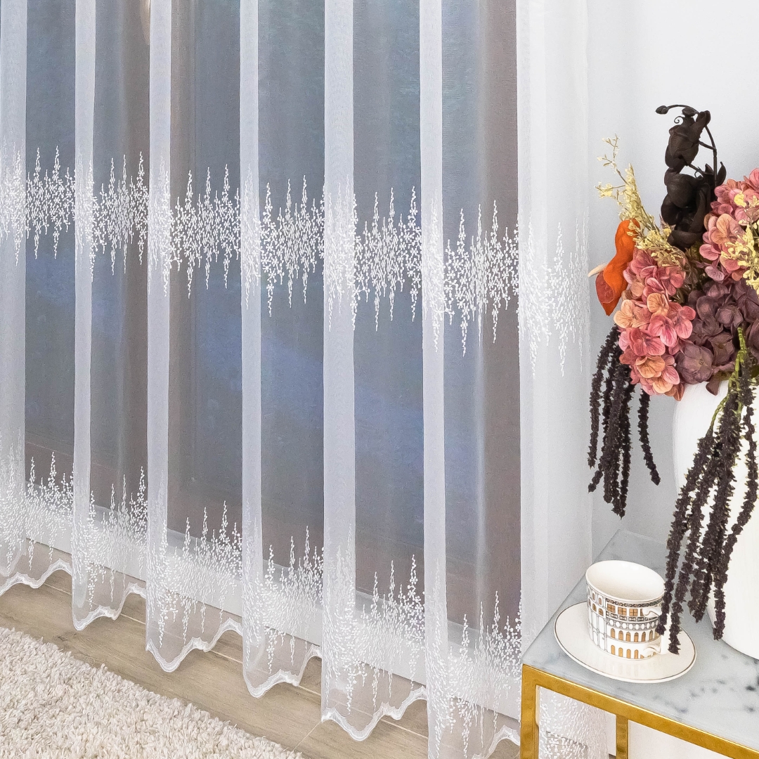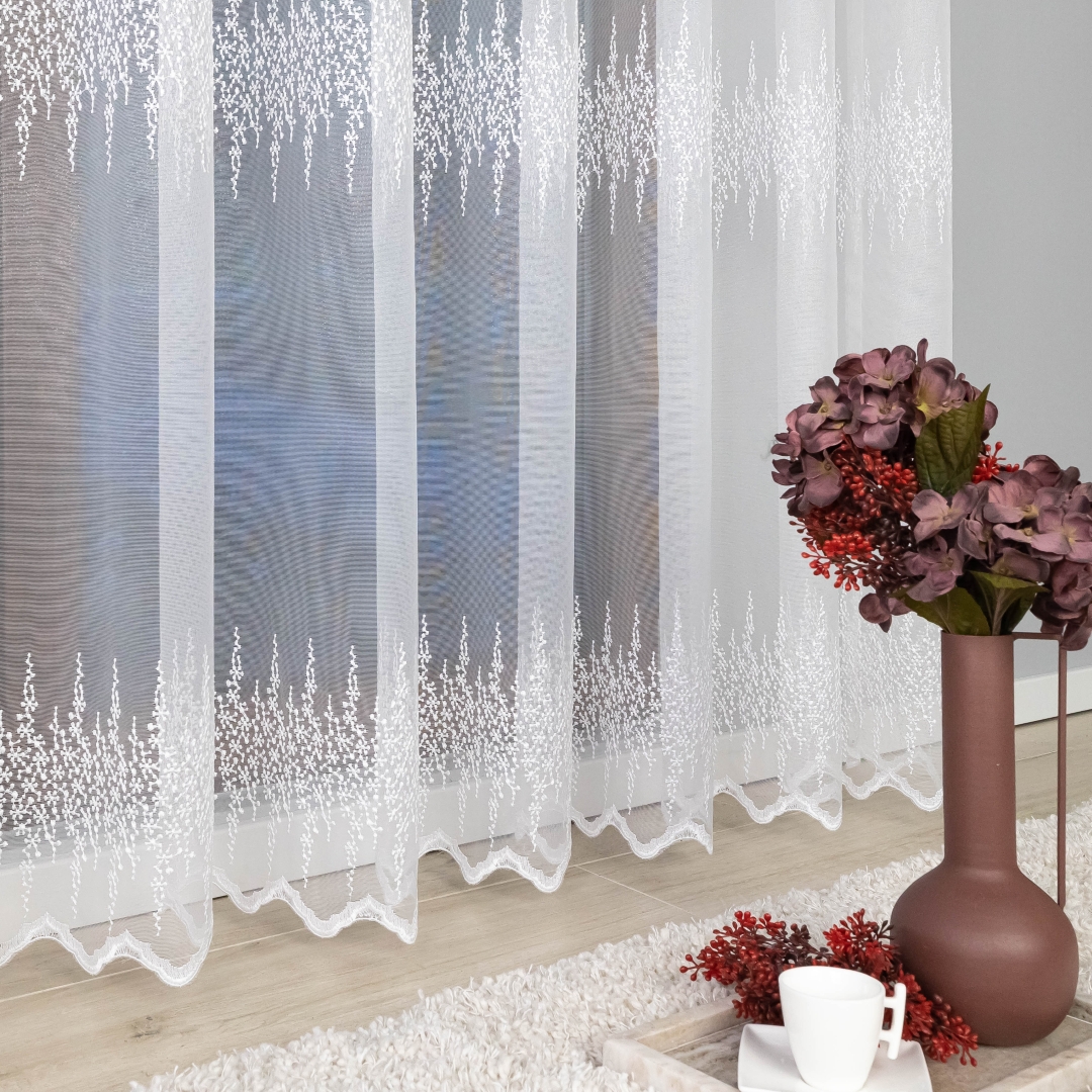 Firana zdobiona jest trzema pasami haftowanego wzoru, co tworzy elegancki i harmonijny efekt na oknie. Metalowe przelotki sprawiają, że montaż firany jest szybki i wygodny – wystarczy ją zawiesić na karniszu bez dodatkowych taśm czy haczyków.