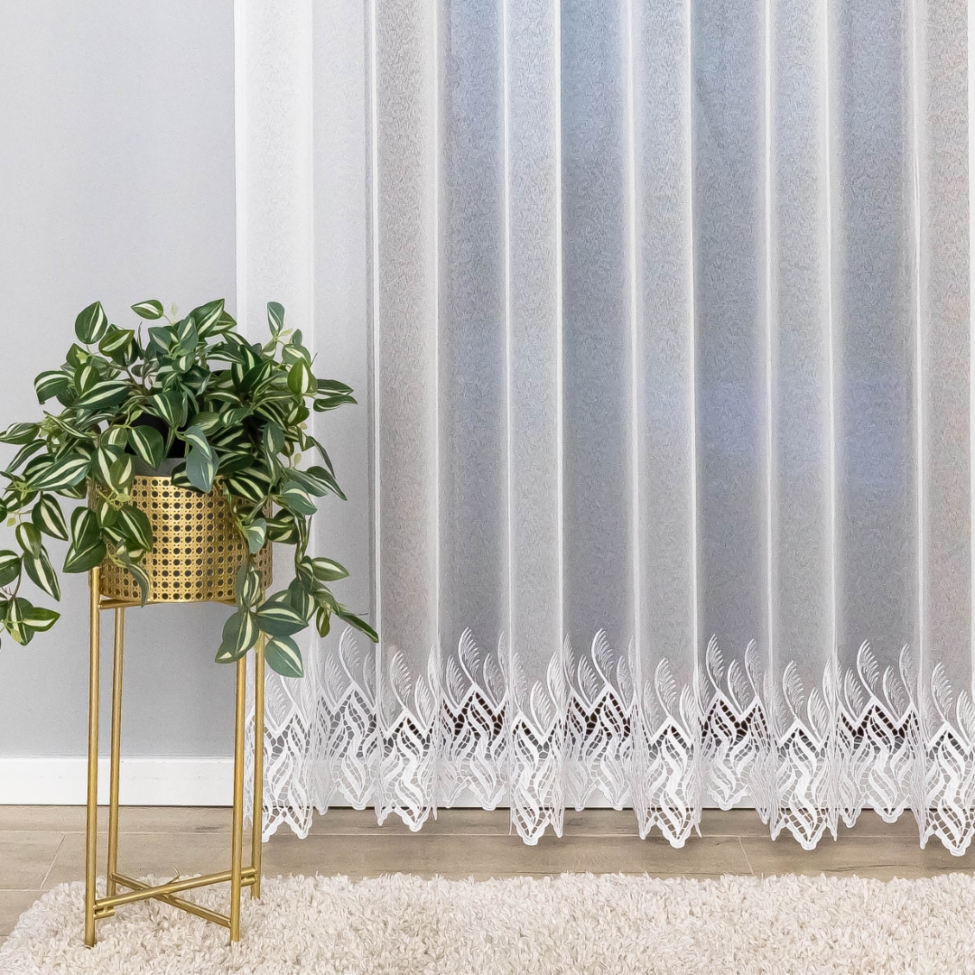 Elegancka firana z białej markizety z oryginalną gipiurową aplikacją na dole, gotowa do zawieszenia dzięki przelotkom. To propozycja dla osób, które chcą szybko i bezproblemowo udekorować swoje okna, a jednocześnie zależy im na nowoczesnym i efektownym wyglądzie wnętrza.