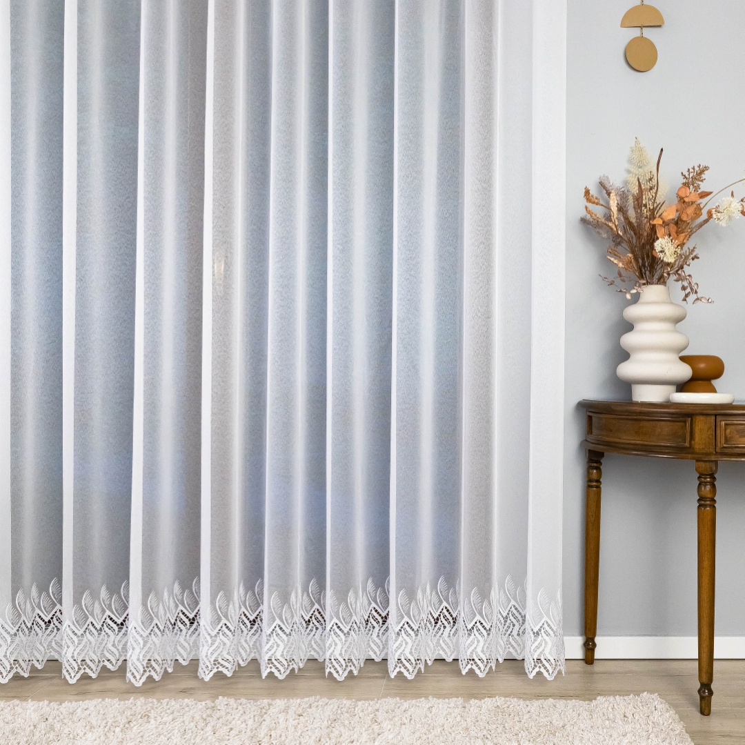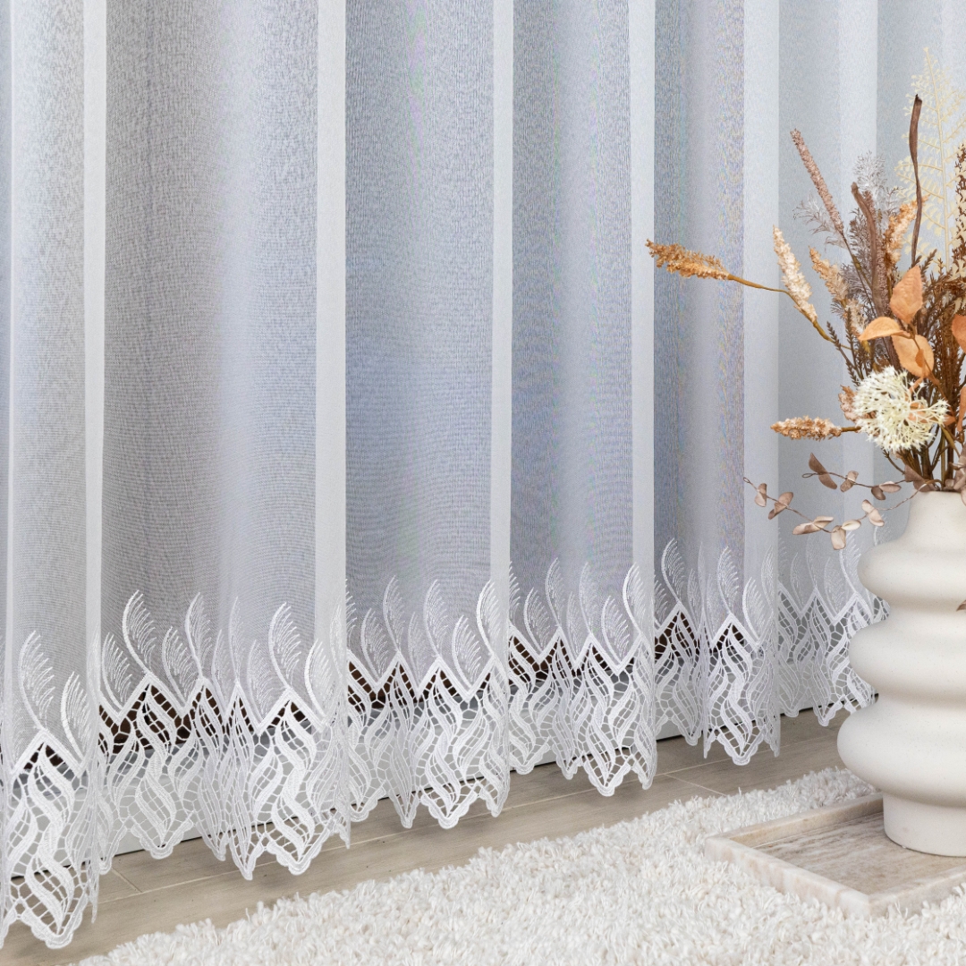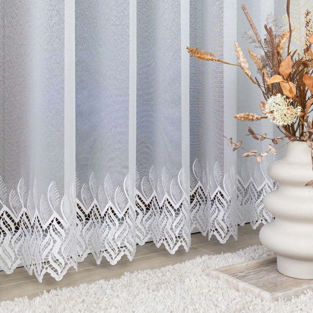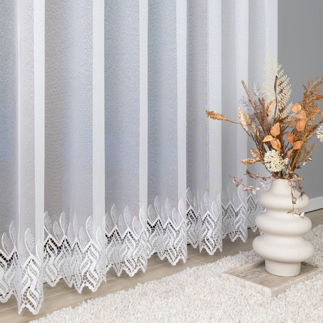 Subtelna markizeta w kolorze czystej bieli pięknie przepuszcza światło, rozjaśniając pomieszczenie, a ozdobny, nowoczesny wzór gipiurowy na dole dodaje całości elegancji i wyrafinowania.