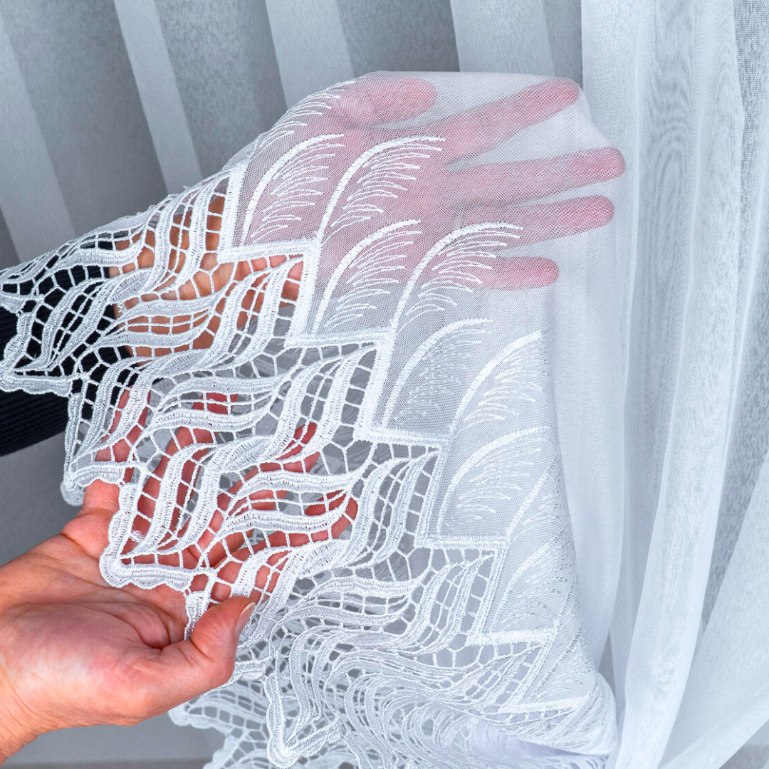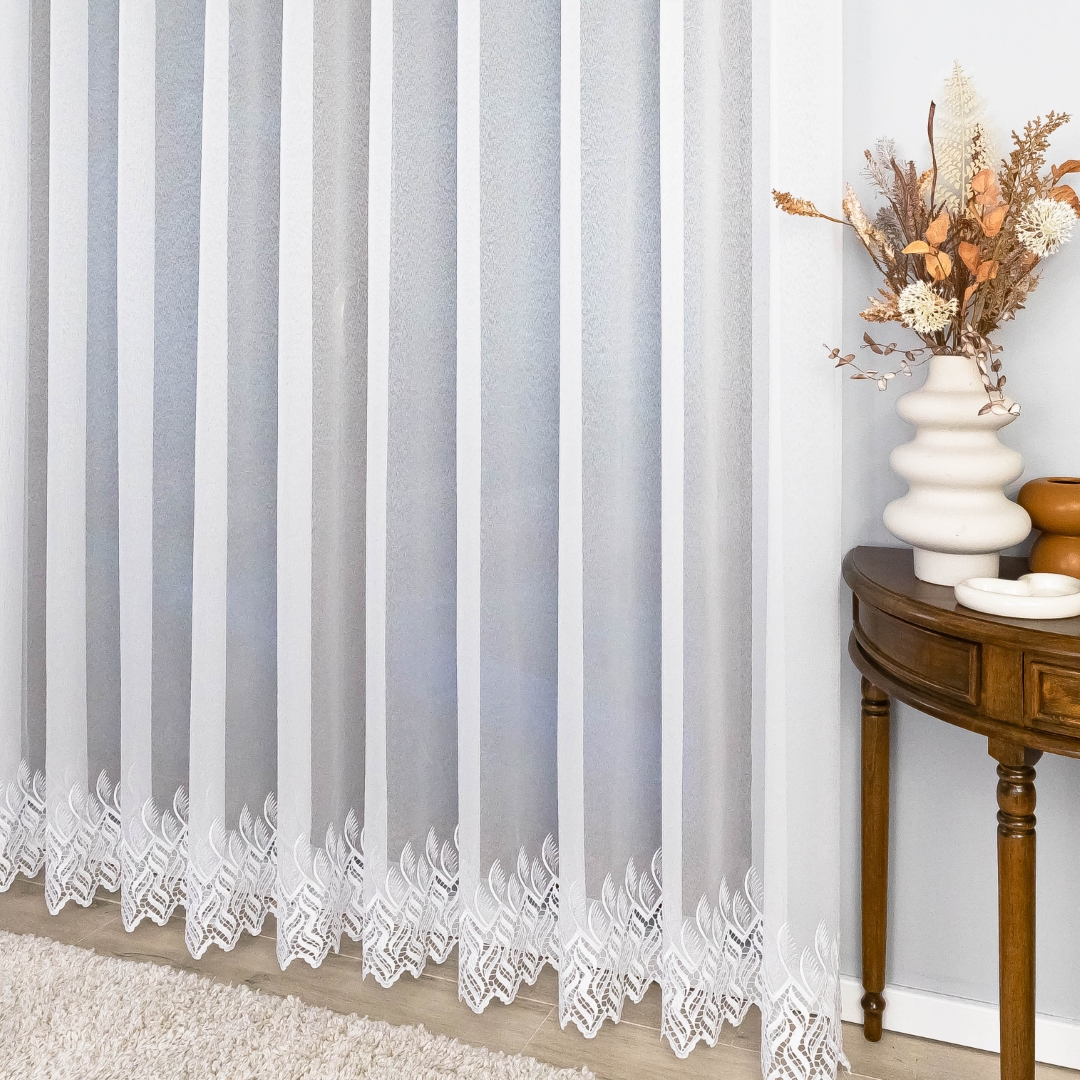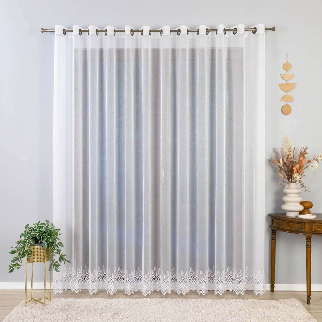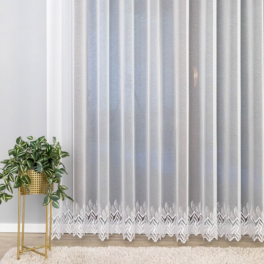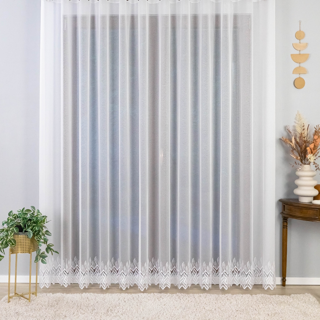 Subtelna markizeta w kolorze czystej bieli pięknie przepuszcza światło, rozjaśniając pomieszczenie, a ozdobny, nowoczesny wzór gipiurowy na dole dodaje całości elegancji i wyrafinowania.