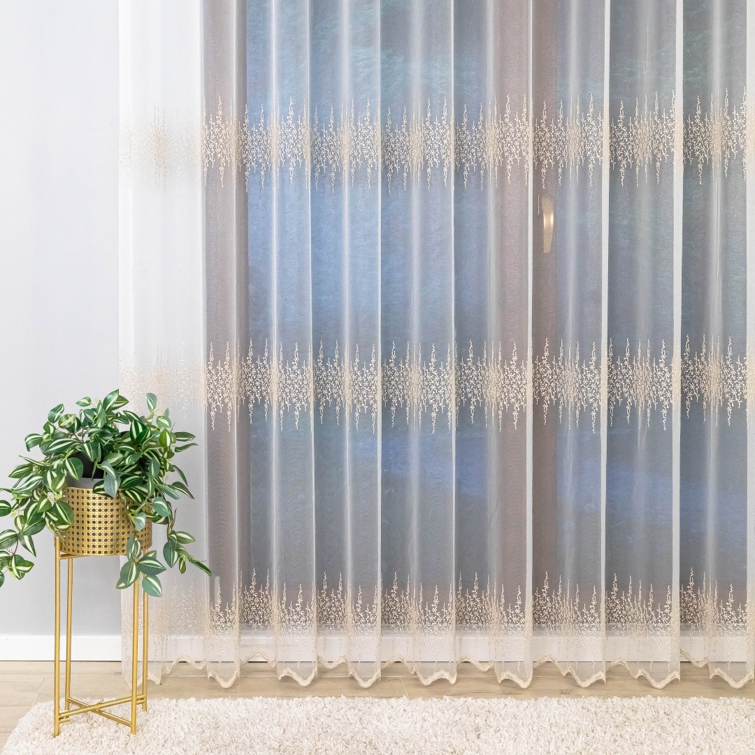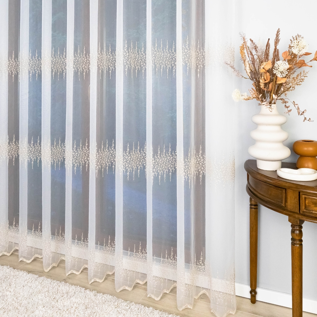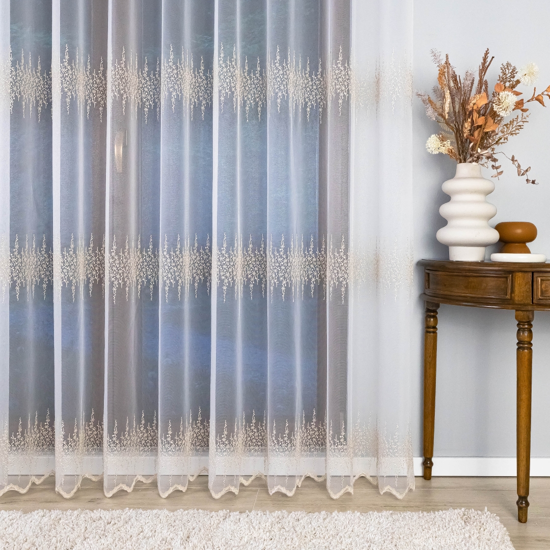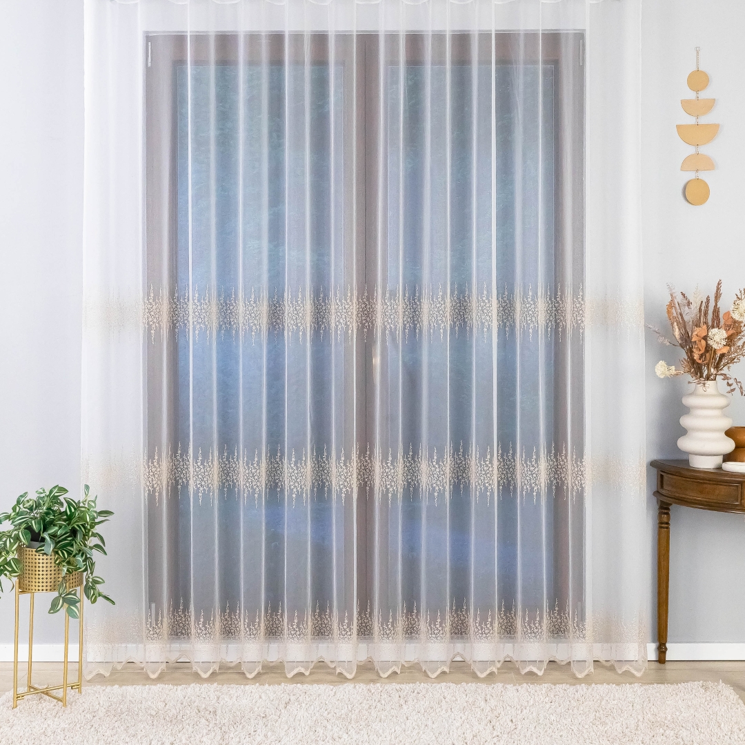 Ta firana z taśmą wspaniale dopełni salon, sypialnię czy elegancką jadalnię. Złoty haft pięknie komponuje się z drewnem, beżem, kremem i szarością, podkreślając ciepło i elegancję wnętrza.