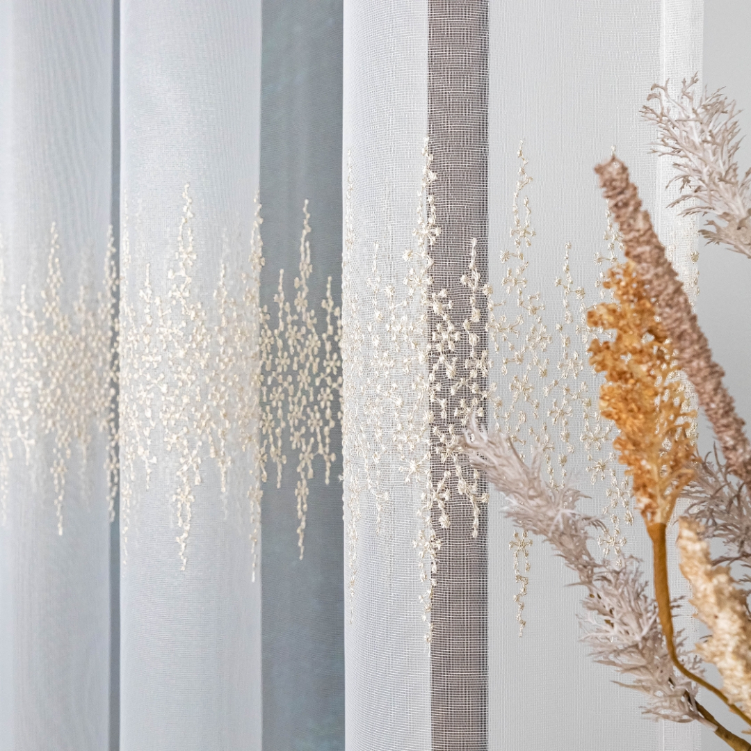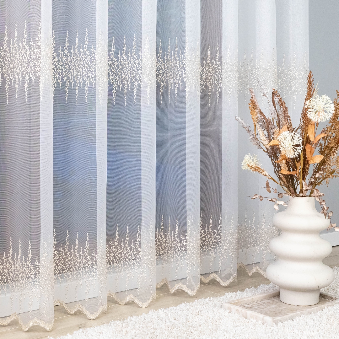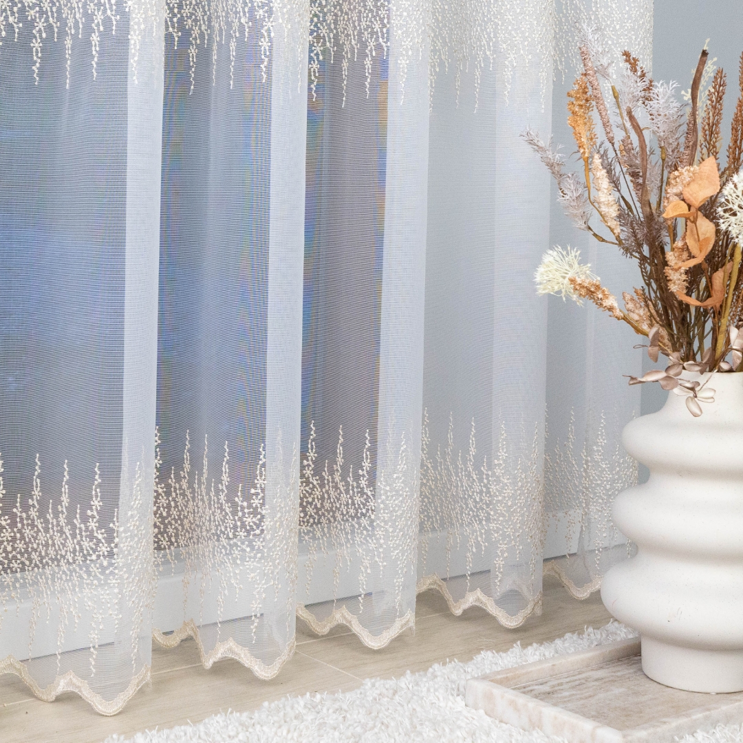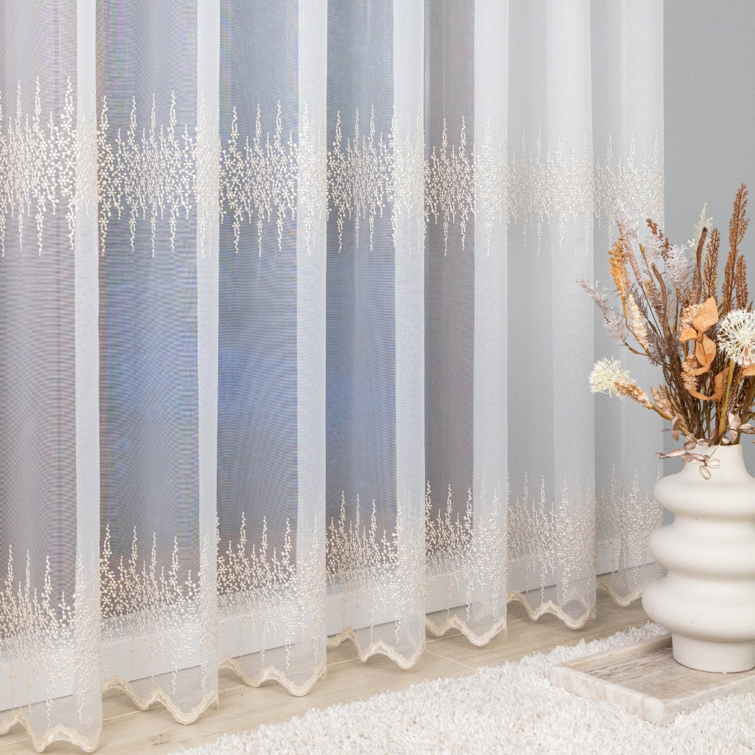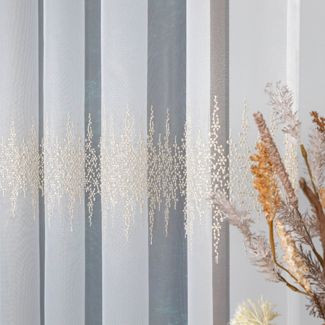 Ta firana z taśmą wspaniale dopełni salon, sypialnię czy elegancką jadalnię. Złoty haft pięknie komponuje się z drewnem, beżem, kremem i szarością, podkreślając ciepło i elegancję wnętrza.