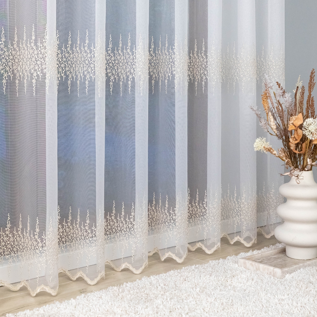 Zachwycająca firana markizeta ze złotym haftem, gotowa do zawieszenia na eleganckich przelotkach, to idealne połączenie nowoczesnej prostoty z nutą luksusu. Delikatna, półtransparentna tkanina o subtelnym połysku ozdobiona została haftem w odcieniu złota, który tworzy efekt lekkiej mgiełki pełnej blasku.