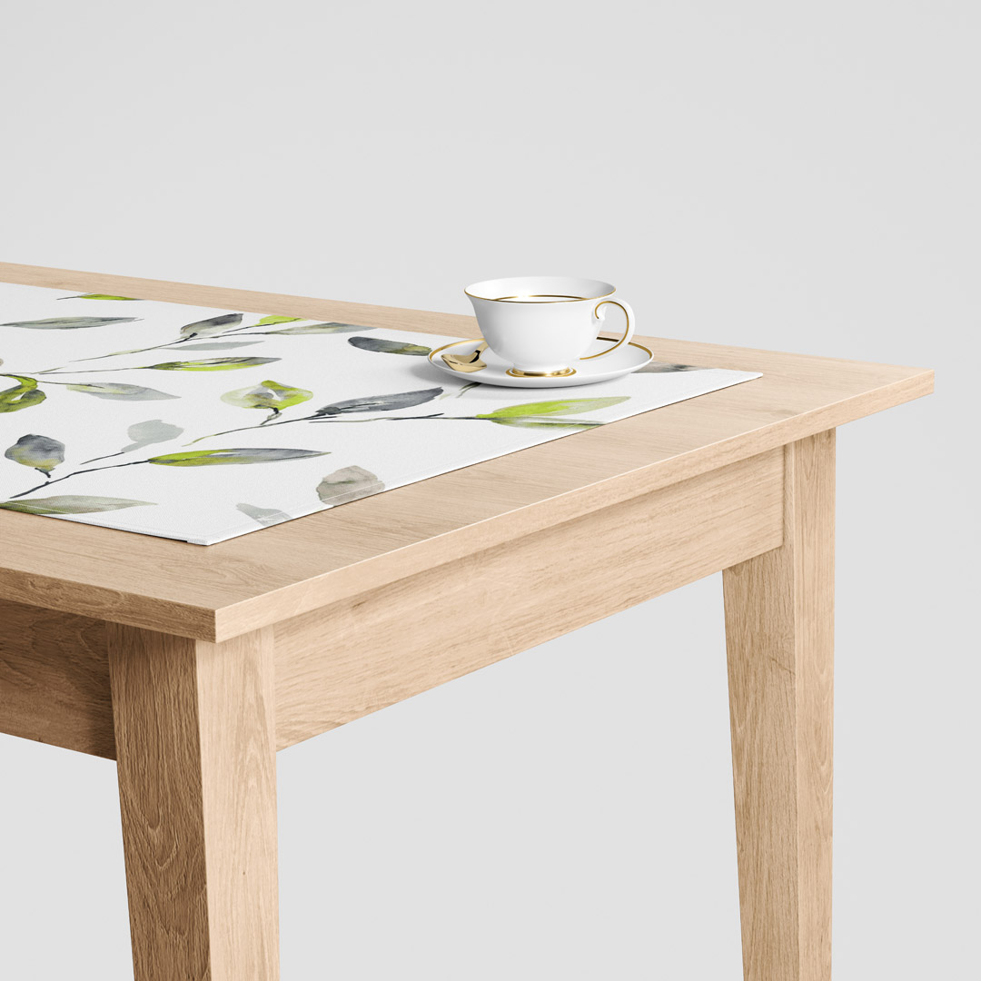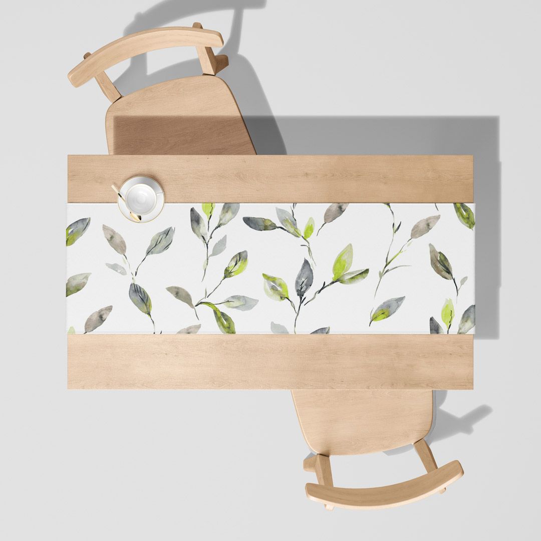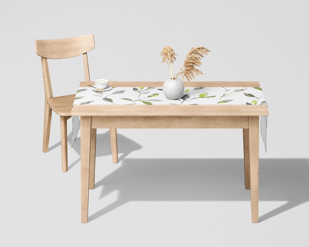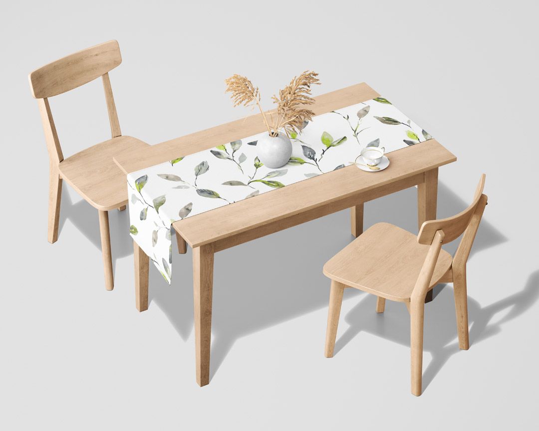 Bieżnik z subtelnym wzorem szarych i zielonych liści na białym tle to elegancka i praktyczna dekoracja stołu. Idealny na co dzień i na specjalne okazje. Doskonale podkreśli styl skandynawski, boho i rustykalny. Łatwy w utrzymaniu czystości, uszyty z trwałej tkaniny.