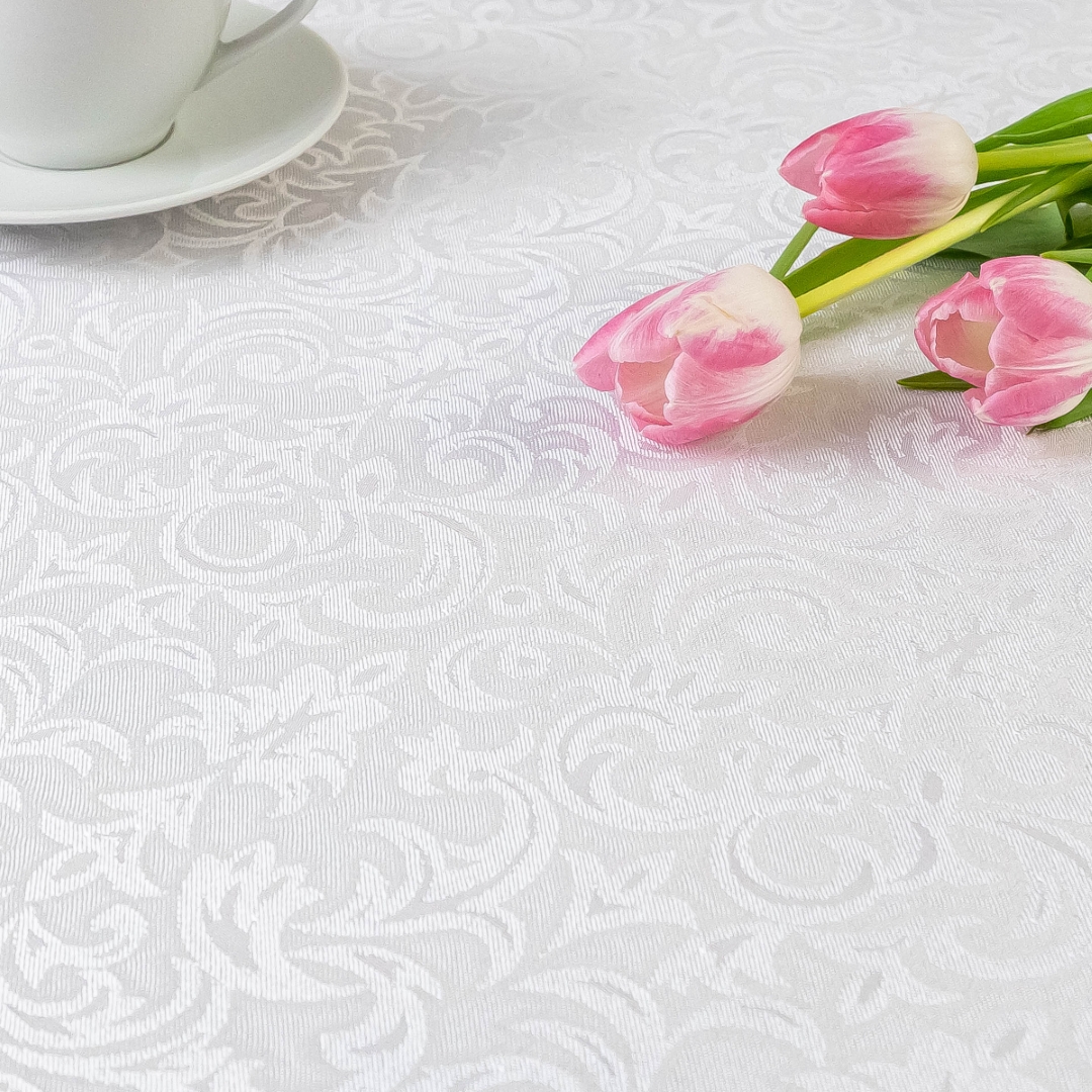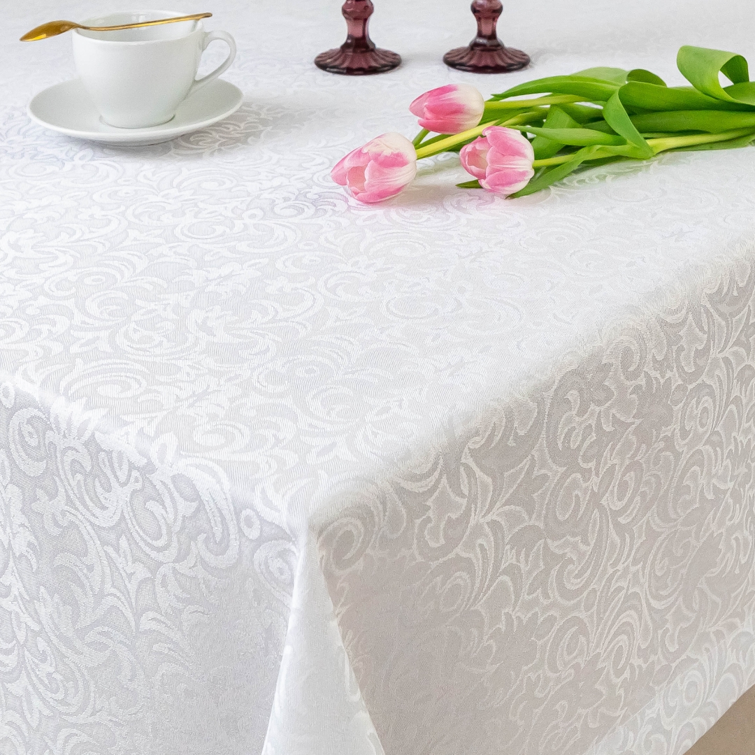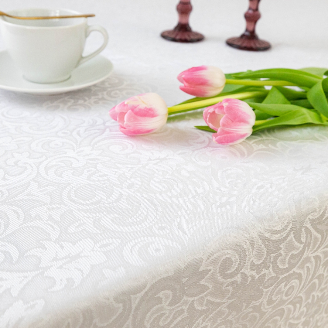 Ten wyjątkowy biały obrus łączy klasyczny styl z nowoczesną funkcjonalnością. Subtelny ornament nadaje wnętrzu elegancji i ponadczasowego charakteru. Doskonale sprawdzi się w jadalni, salonie, a także podczas uroczystości rodzinnych.