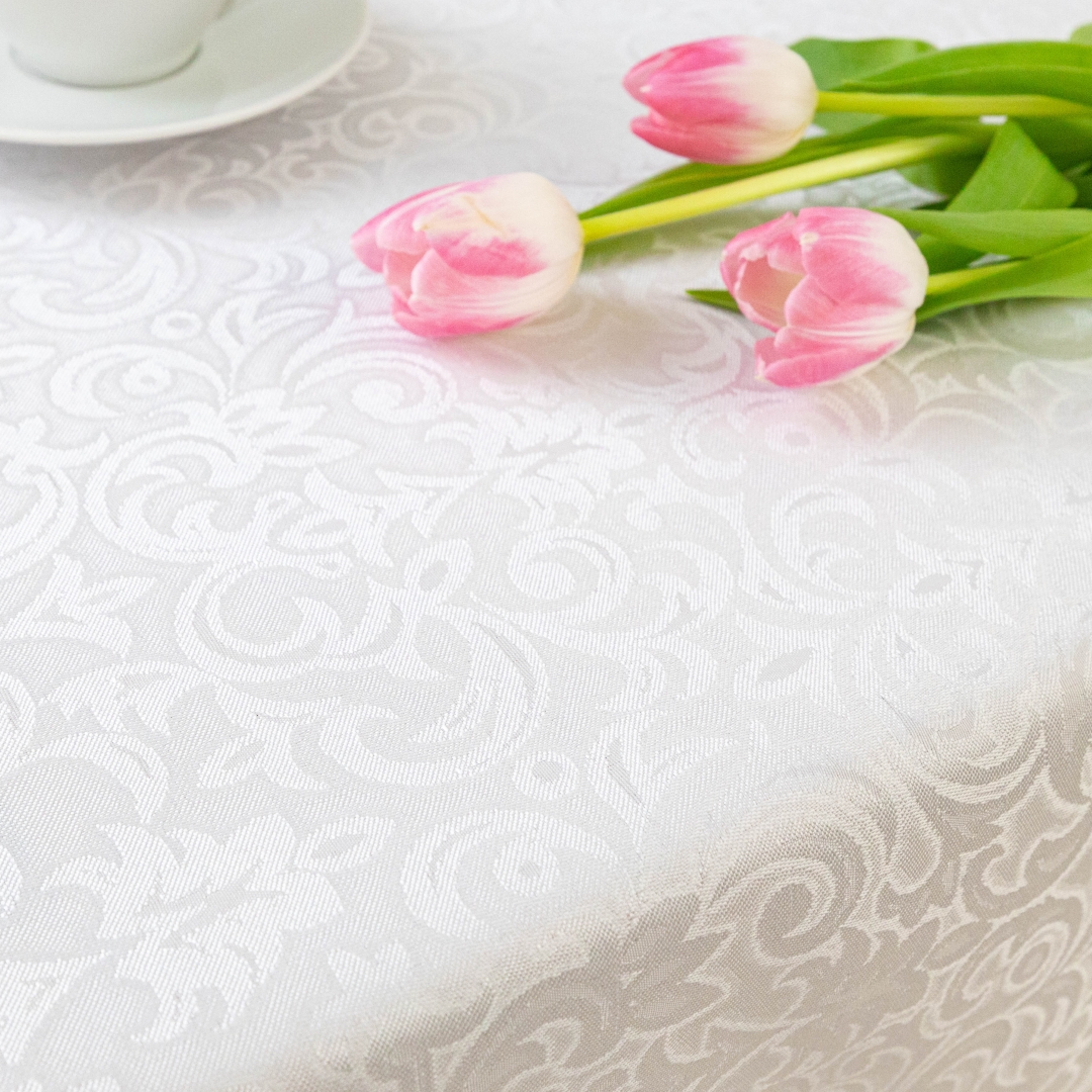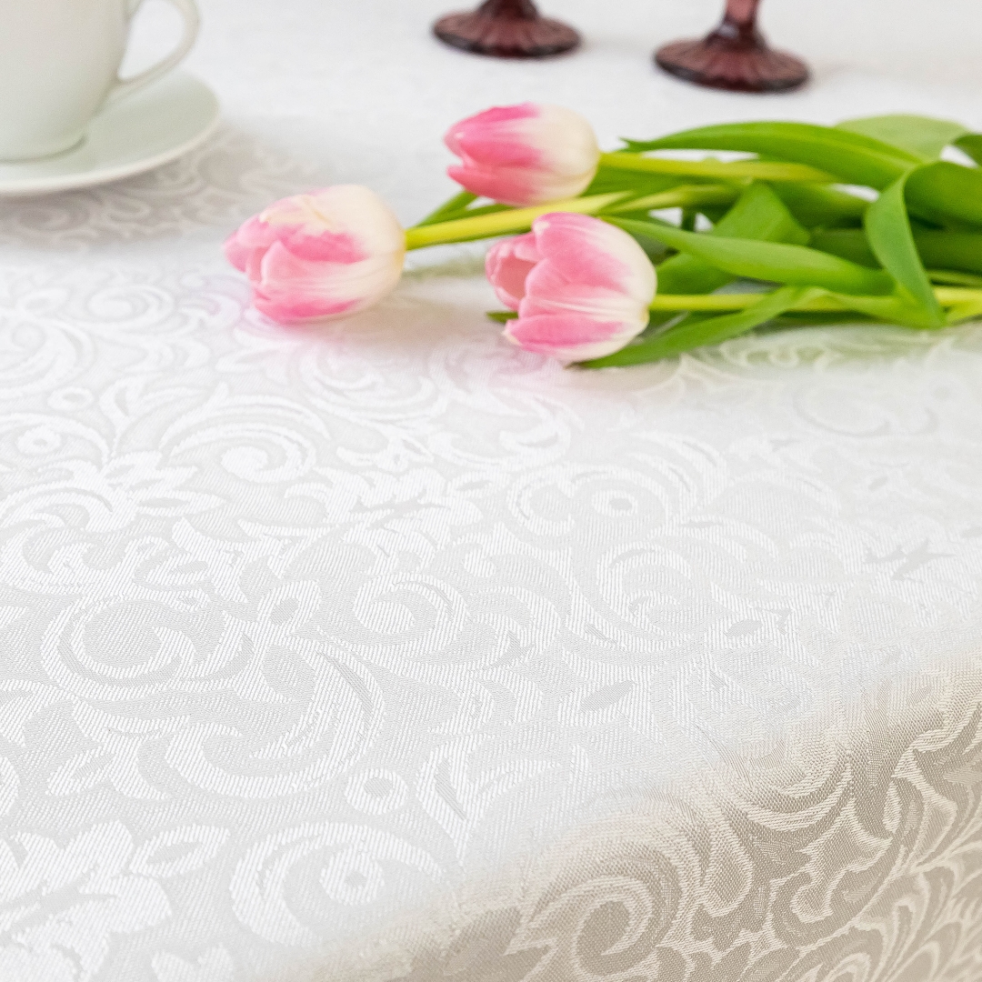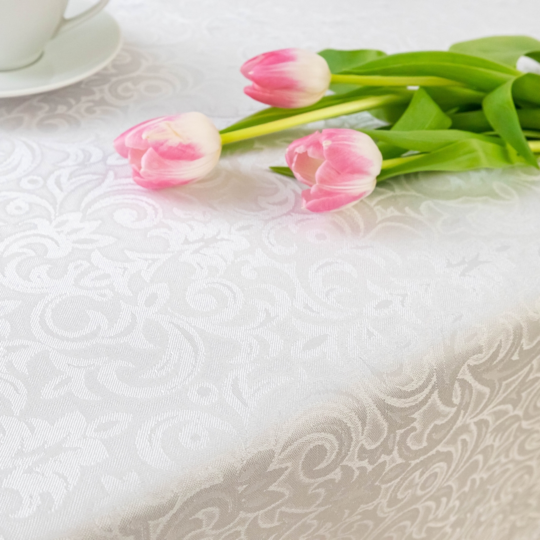 Ten wyjątkowy biały obrus łączy klasyczny styl z nowoczesną funkcjonalnością. Subtelny ornament nadaje wnętrzu elegancji i ponadczasowego charakteru. Doskonale sprawdzi się w jadalni, salonie, a także podczas uroczystości rodzinnych.