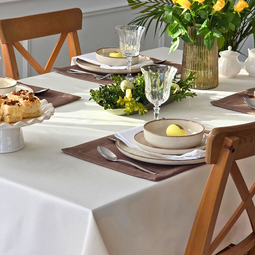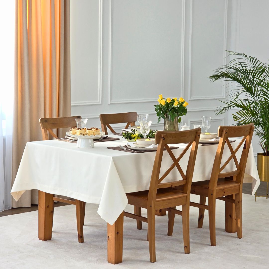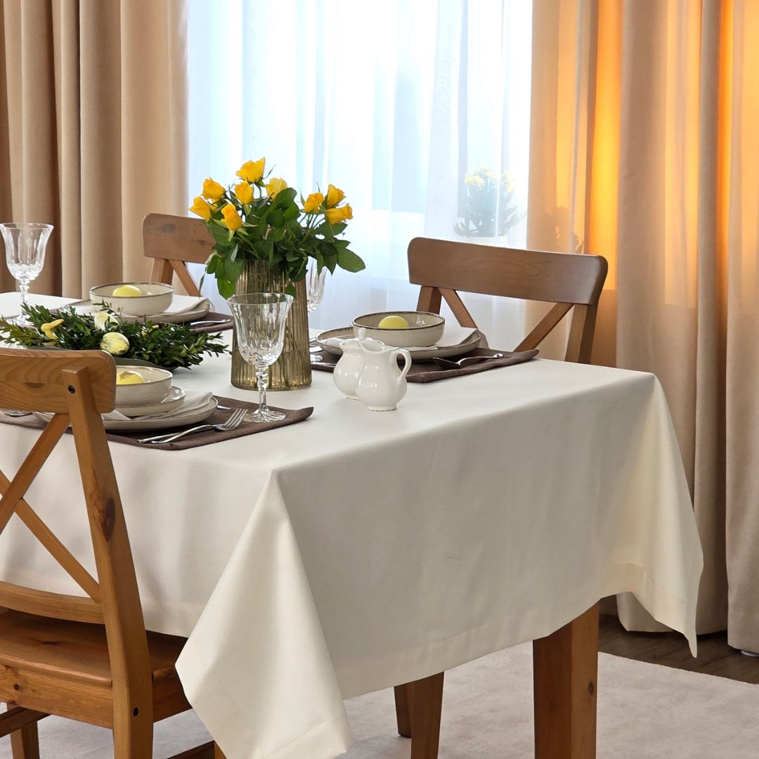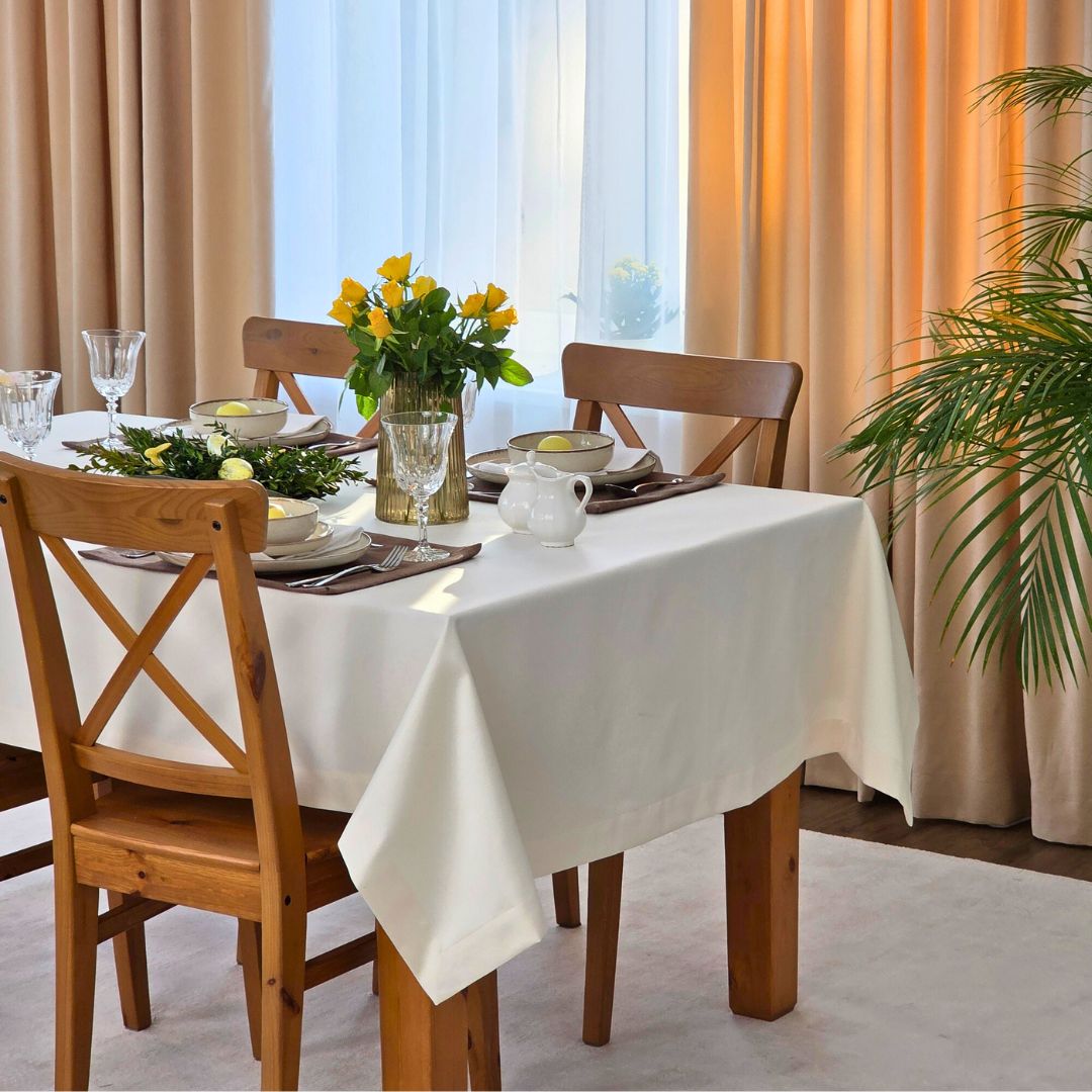 Obrus bawełniany ecru to idealny wybór do jadalni, salonu oraz kuchni. Doskonale sprawdzi się podczas świąt, rodzinnych obiadów oraz spotkań przy wspólnym stole. Neutralny kolor pozwala łatwo dopasować obrus do różnych dodatków oraz zastawy stołowej.