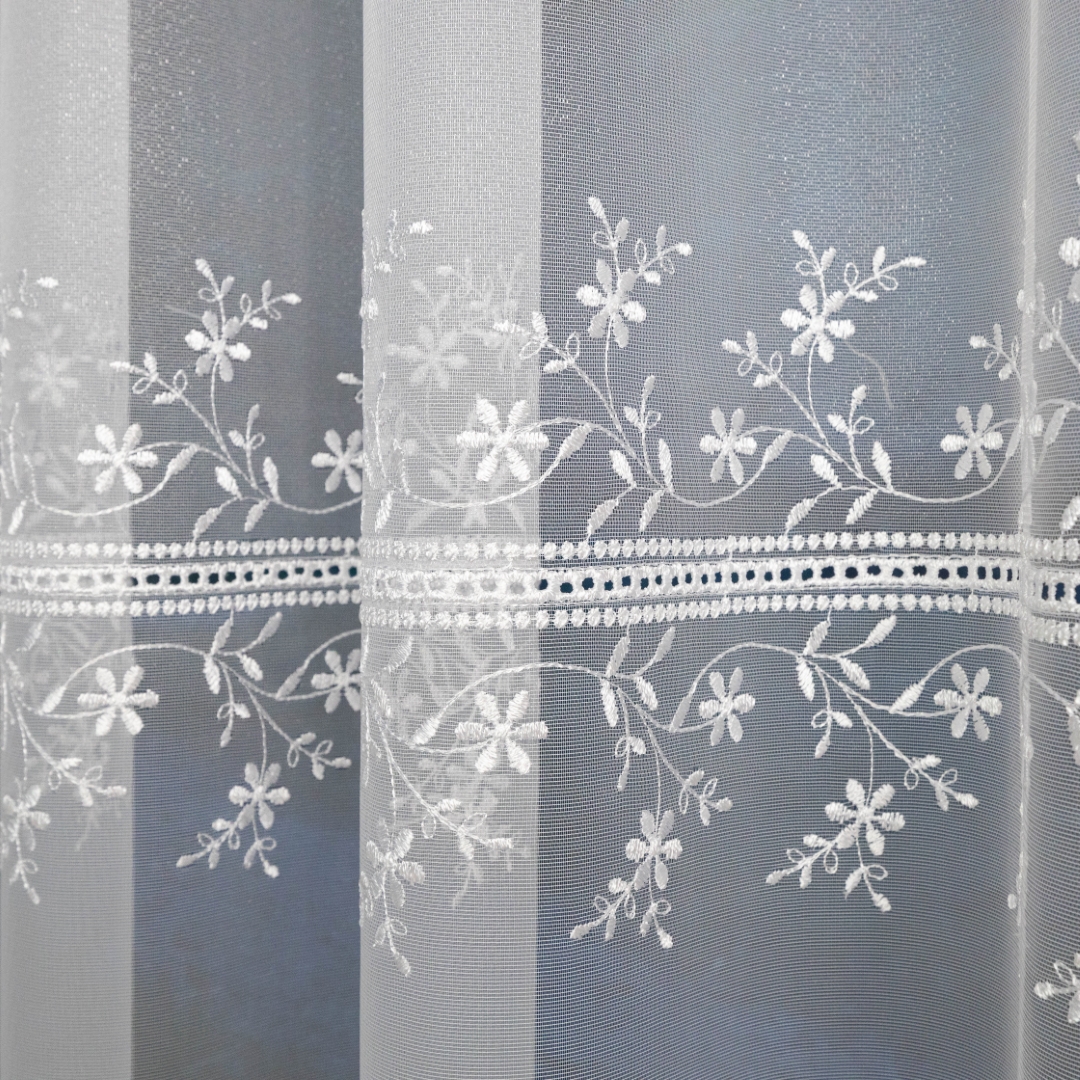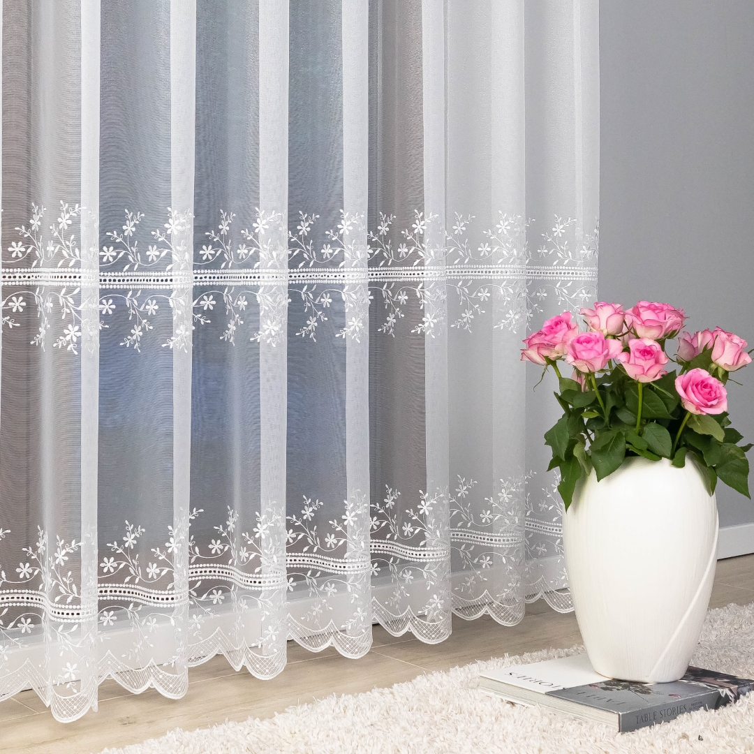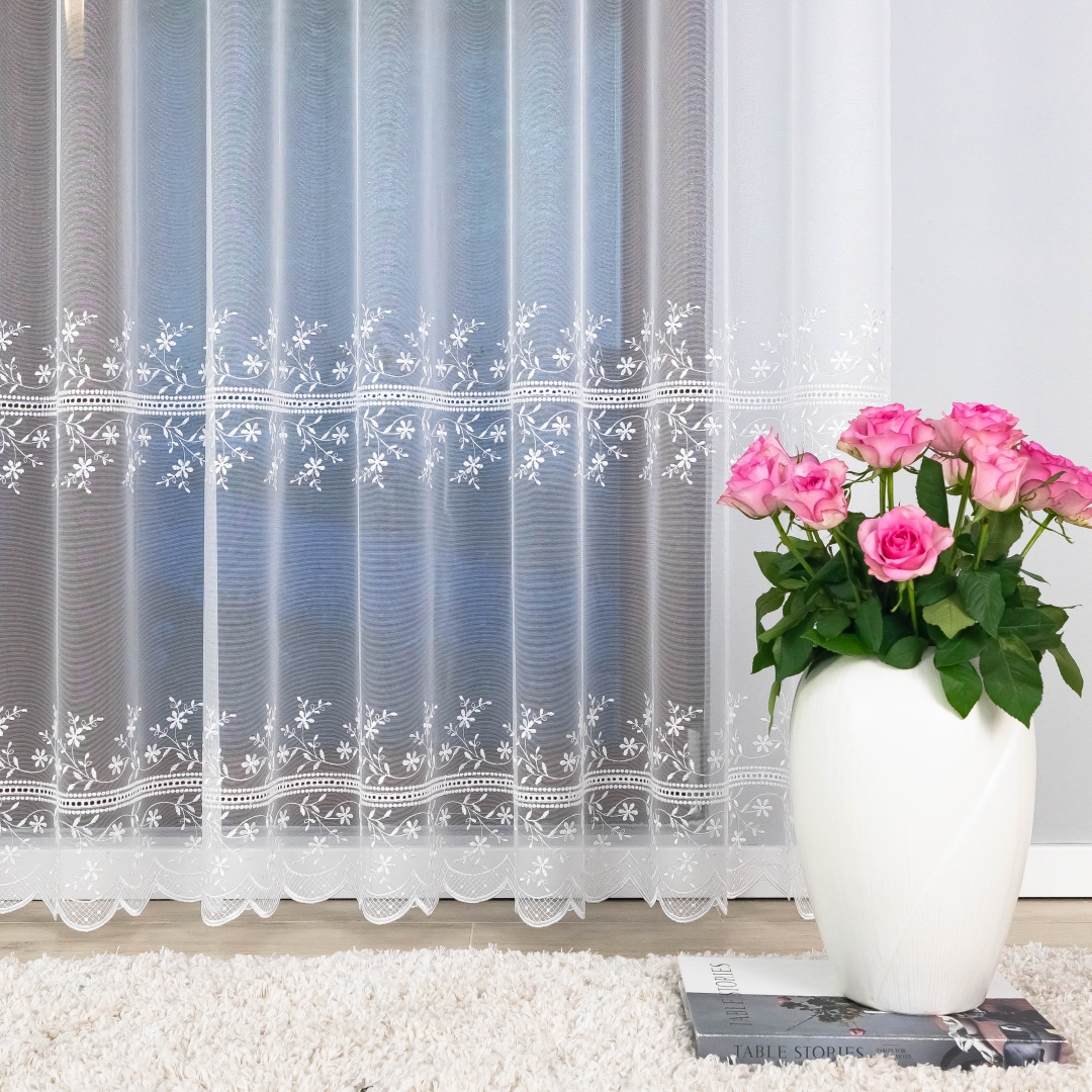 Tkanina została ozdobiona haftowanym wzorem florystycznym, rozmieszczonym w dwóch poziomych pasach, oraz wykończona dekoracyjną falą z ażurową koronką. Dzięki temu firana prezentuje się stylowo i estetycznie zarówno z bliska, jak i z dalszej perspektywy.