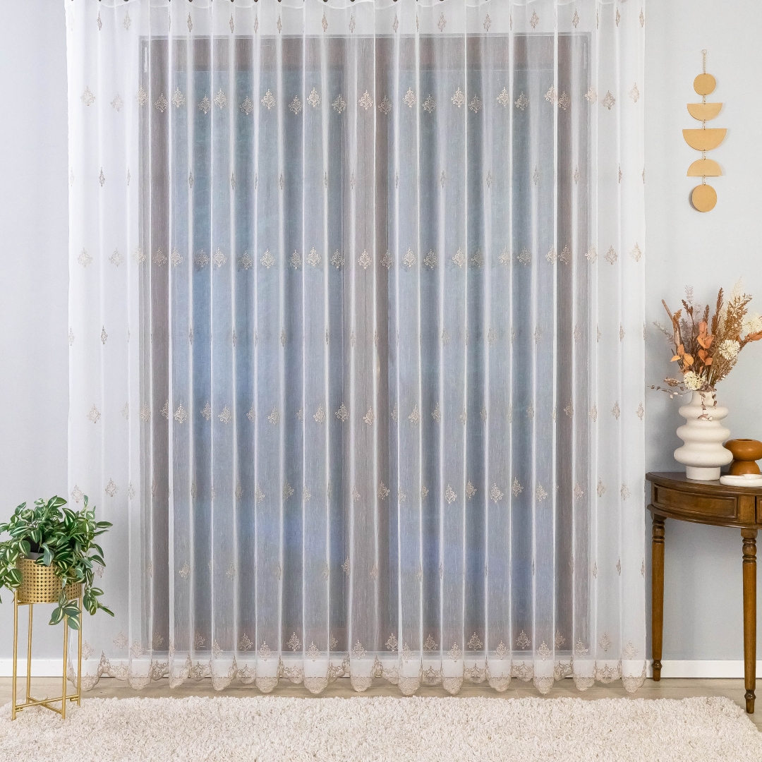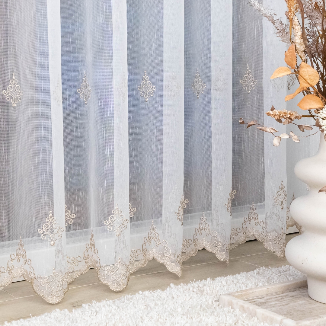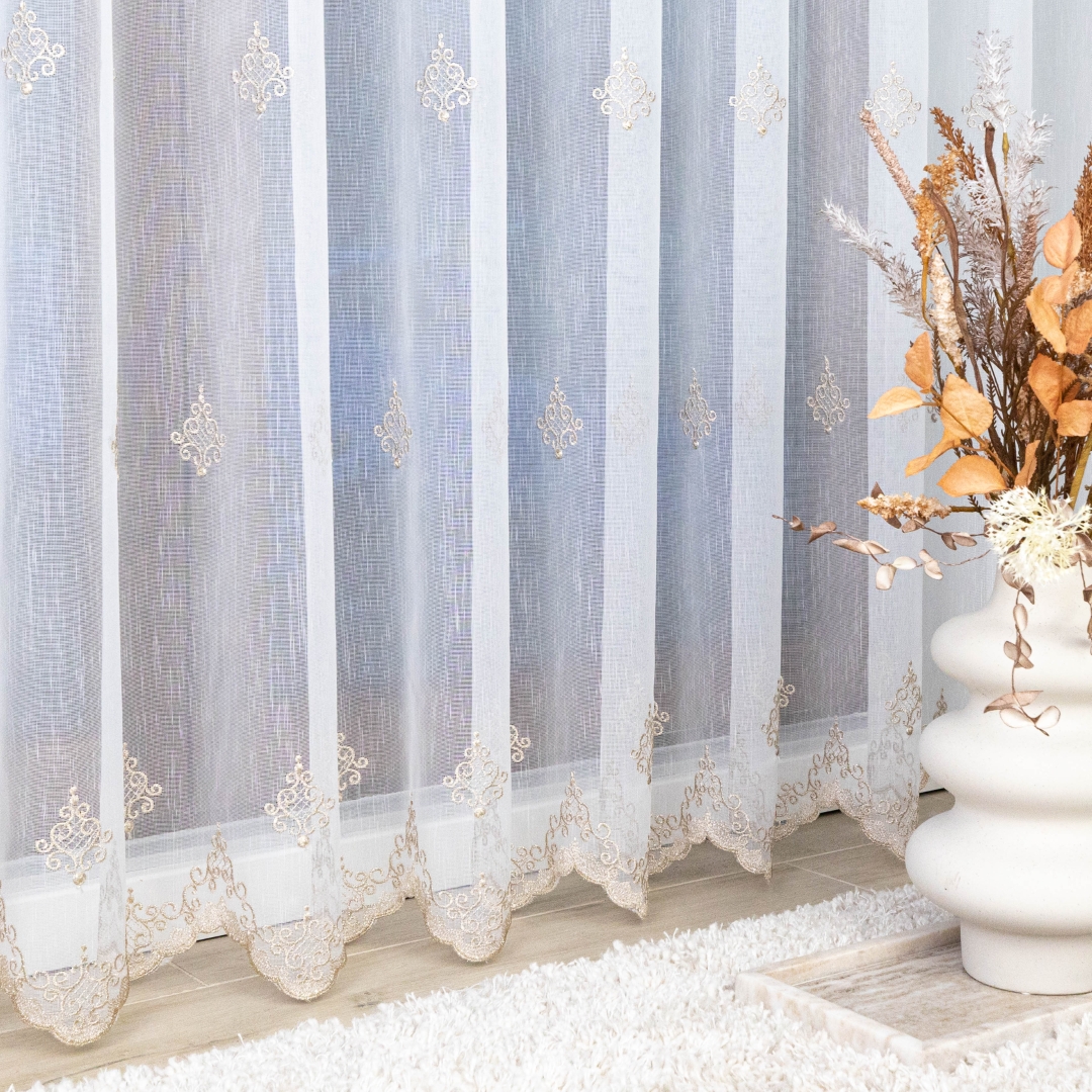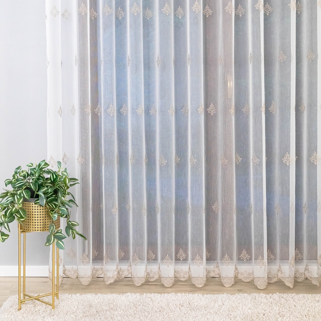Wprowadź do swojego domu lekkość i elegancję dzięki białej firanie ze złotym haftowanym wzorem. Subtelny, rozproszony po całości złoty haft dodaje dekoracji wyrafinowanego charakteru, jednocześnie pozostając delikatnym i nienachalnym akcentem. Dzięki lekko prześwitującej tkaninie firana przepuszcza dużo naturalnego światła, sprawiając, że wnętrza stają się jaśniejsze, bardziej przestronne i przytulne.