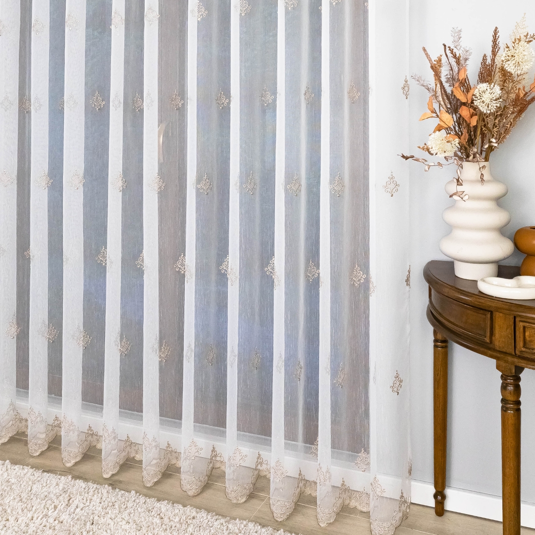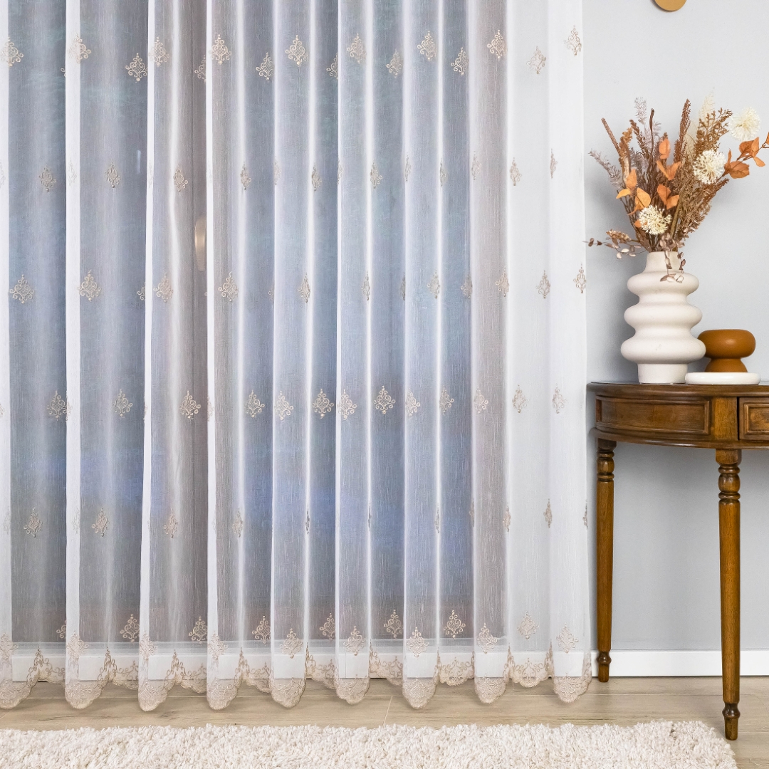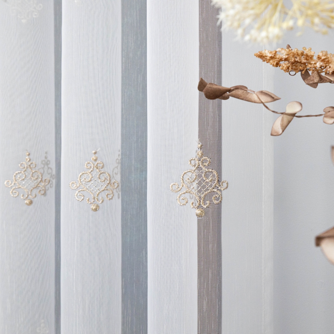 Wprowadź do swojego domu lekkość i elegancję dzięki białej firanie ze złotym haftowanym wzorem. Subtelny, rozproszony po całości złoty haft dodaje dekoracji wyrafinowanego charakteru, jednocześnie pozostając delikatnym i nienachalnym akcentem. Dzięki lekko prześwitującej tkaninie firana przepuszcza dużo naturalnego światła, sprawiając, że wnętrza stają się jaśniejsze, bardziej przestronne i przytulne.