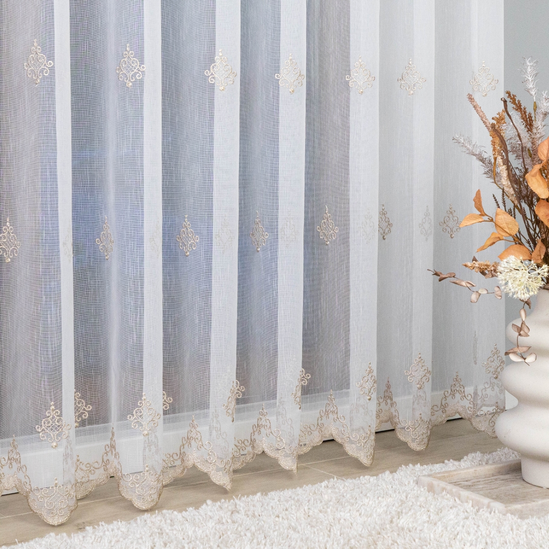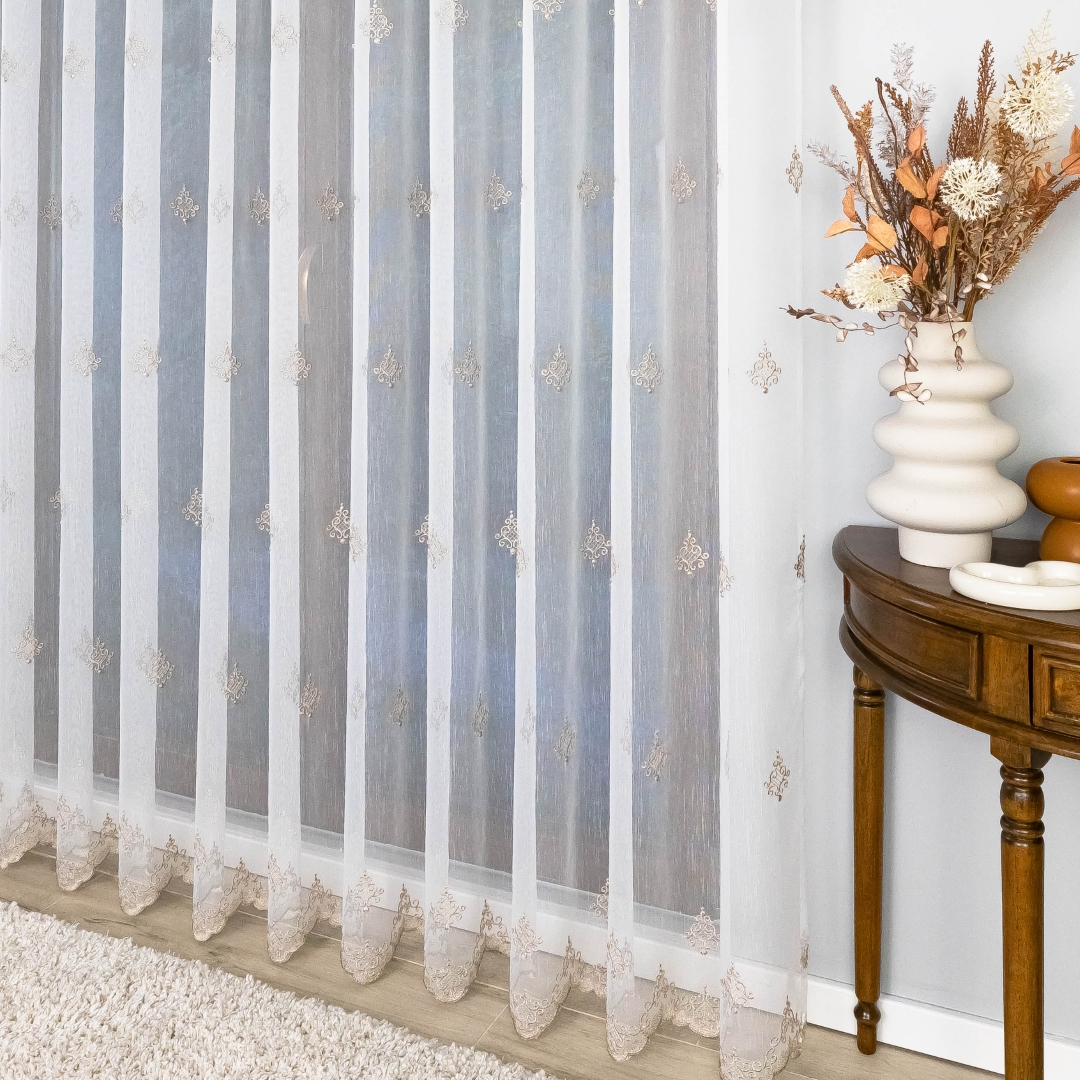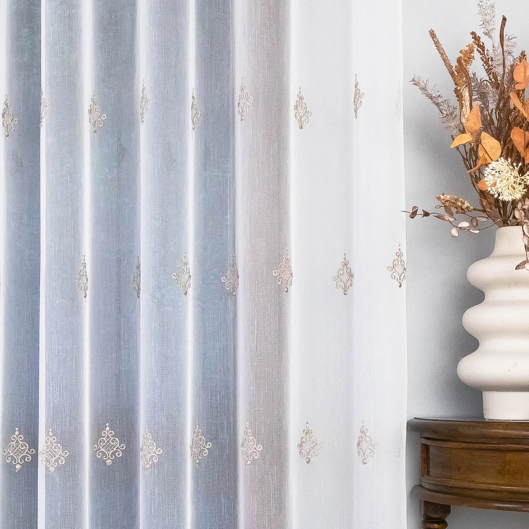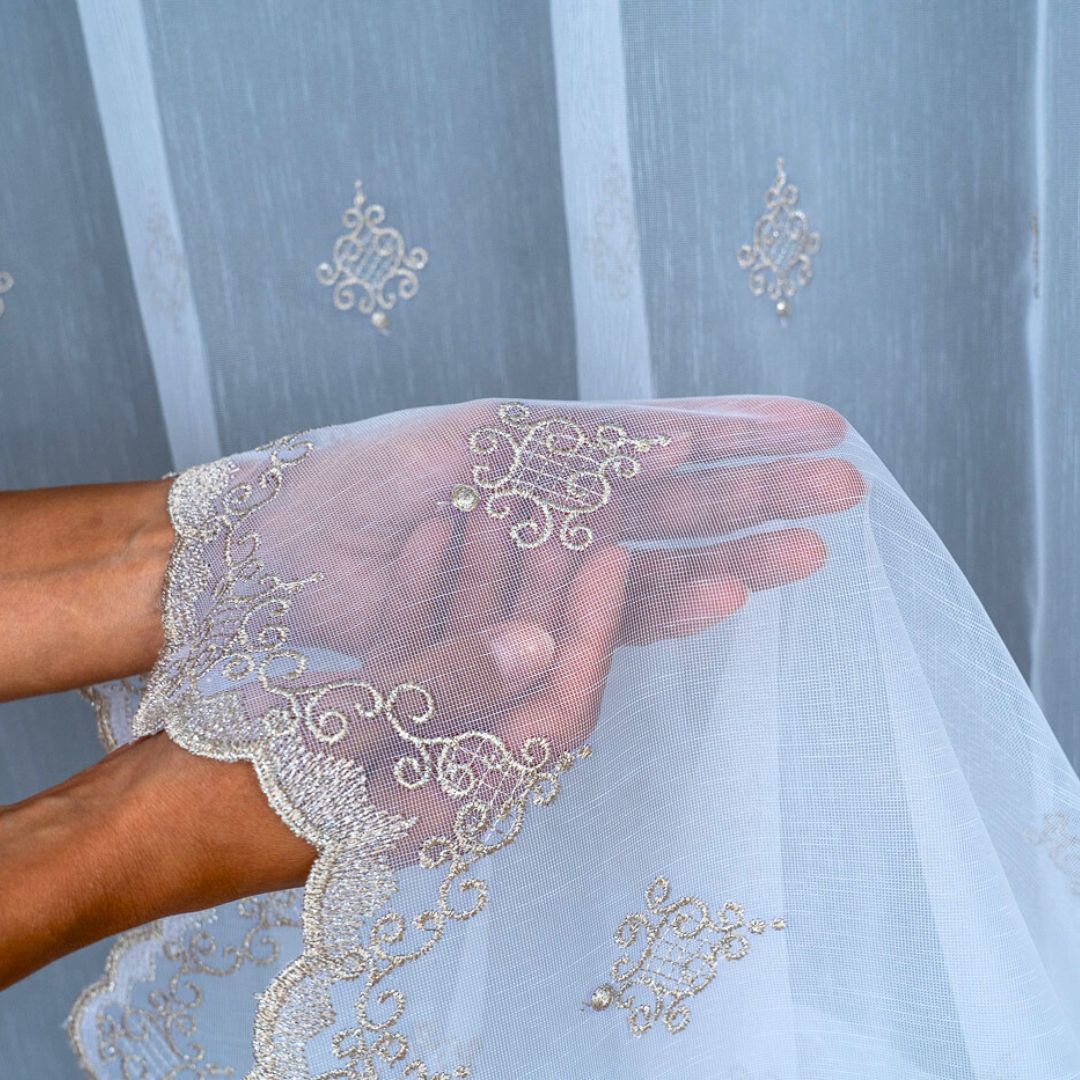 Wprowadź do swojego domu lekkość i elegancję dzięki białej firanie ze złotym haftowanym wzorem. Subtelny, rozproszony po całości złoty haft dodaje dekoracji wyrafinowanego charakteru, jednocześnie pozostając delikatnym i nienachalnym akcentem. Dzięki lekko prześwitującej tkaninie firana przepuszcza dużo naturalnego światła, sprawiając, że wnętrza stają się jaśniejsze, bardziej przestronne i przytulne.
