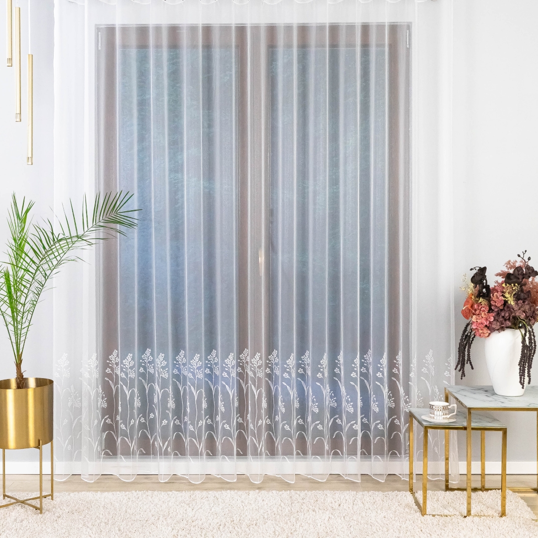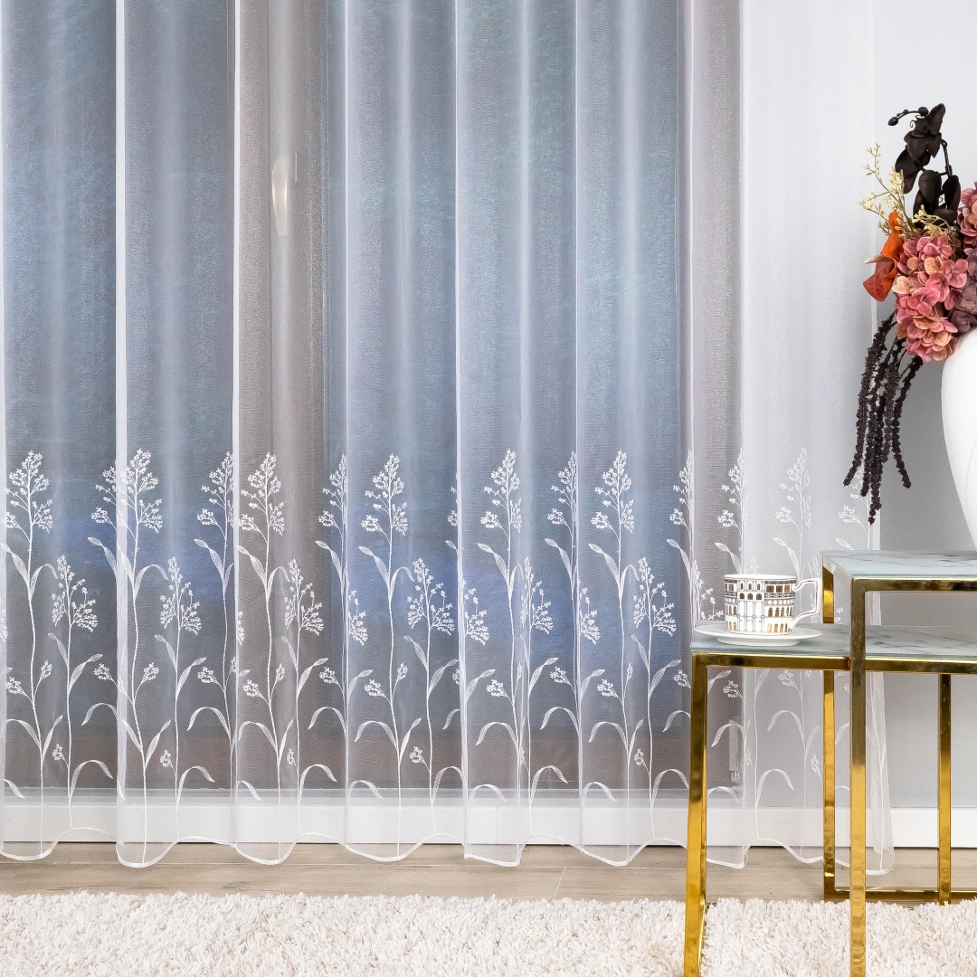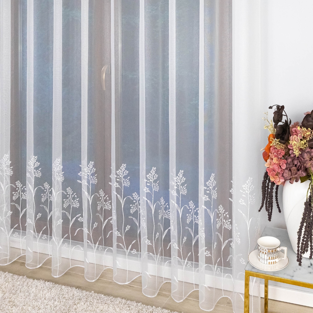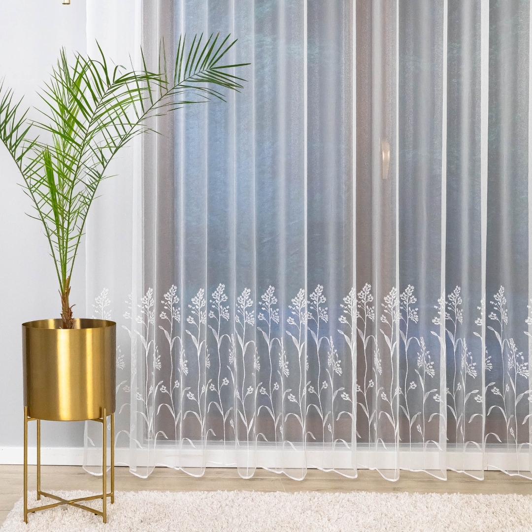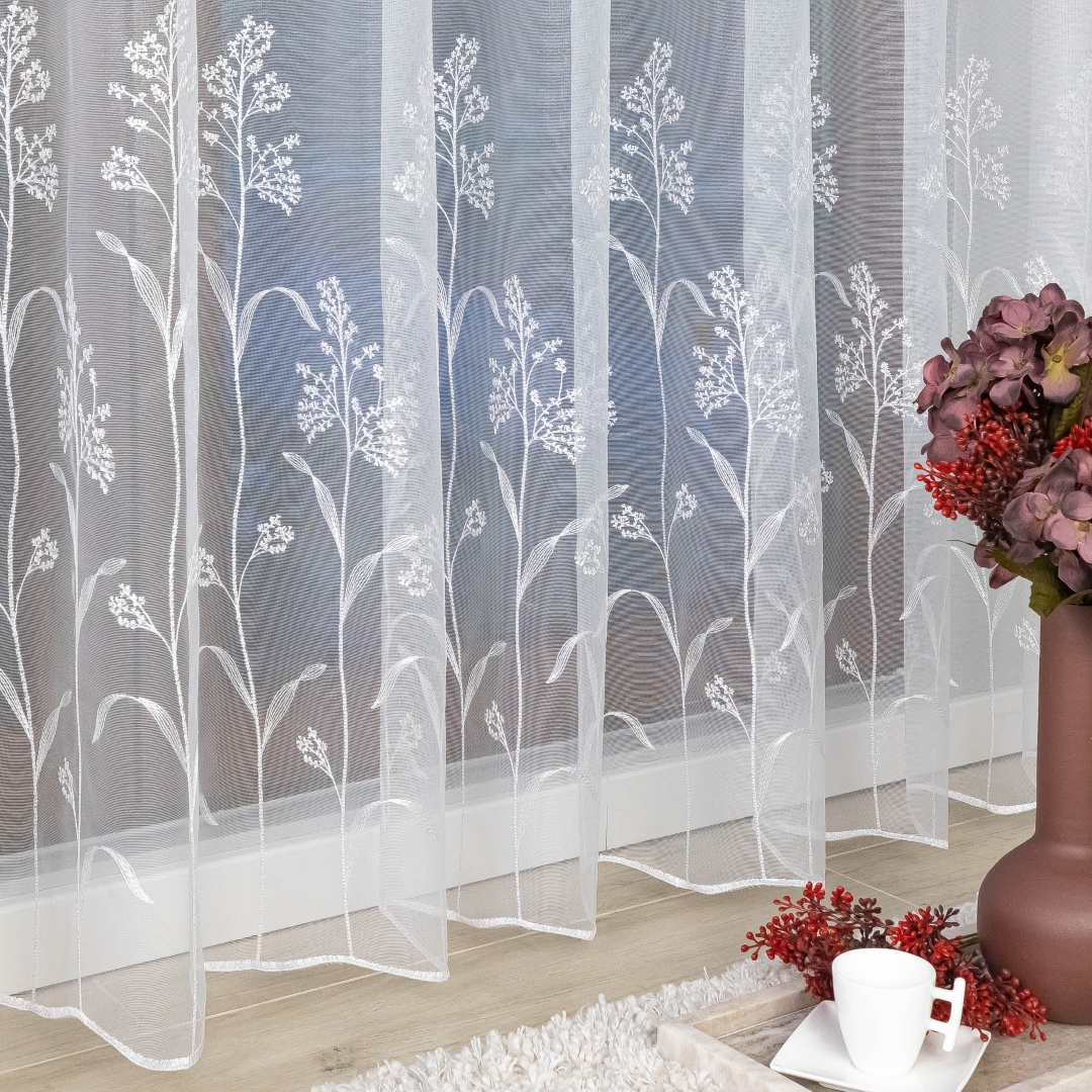 Haftowany motyw roślinny w formie smukłych łodyg z drobnymi kwiatami i listkami zdobi całą wysokość firany, przypominając kwitnące trawy lub polne kwiaty. Subtelny, naturalny wzór nadaje dekoracji romantycznego i świeżego charakteru.