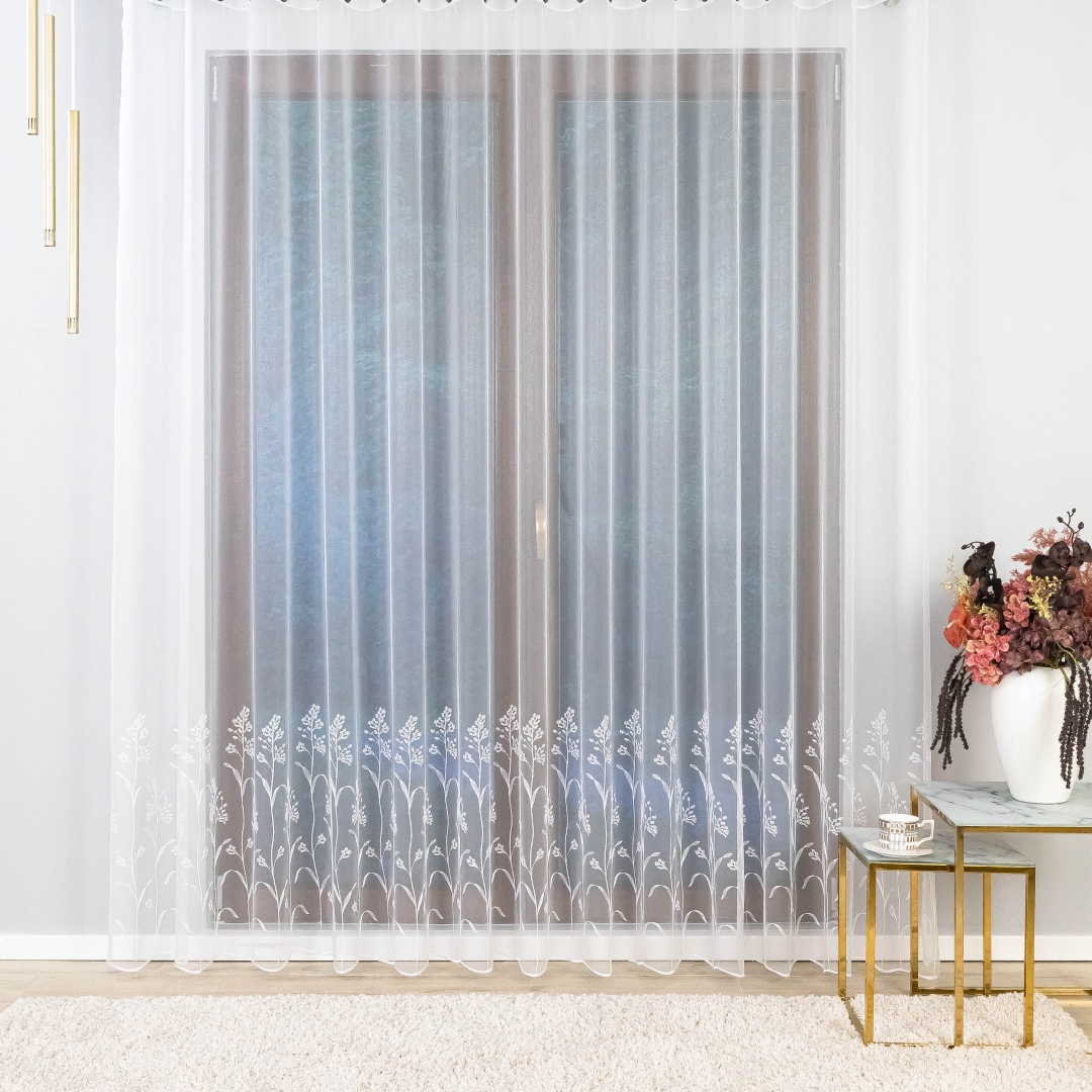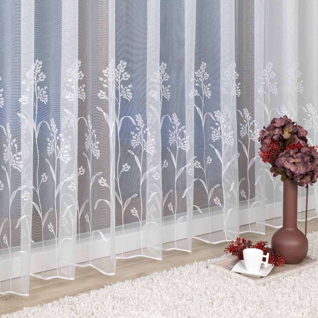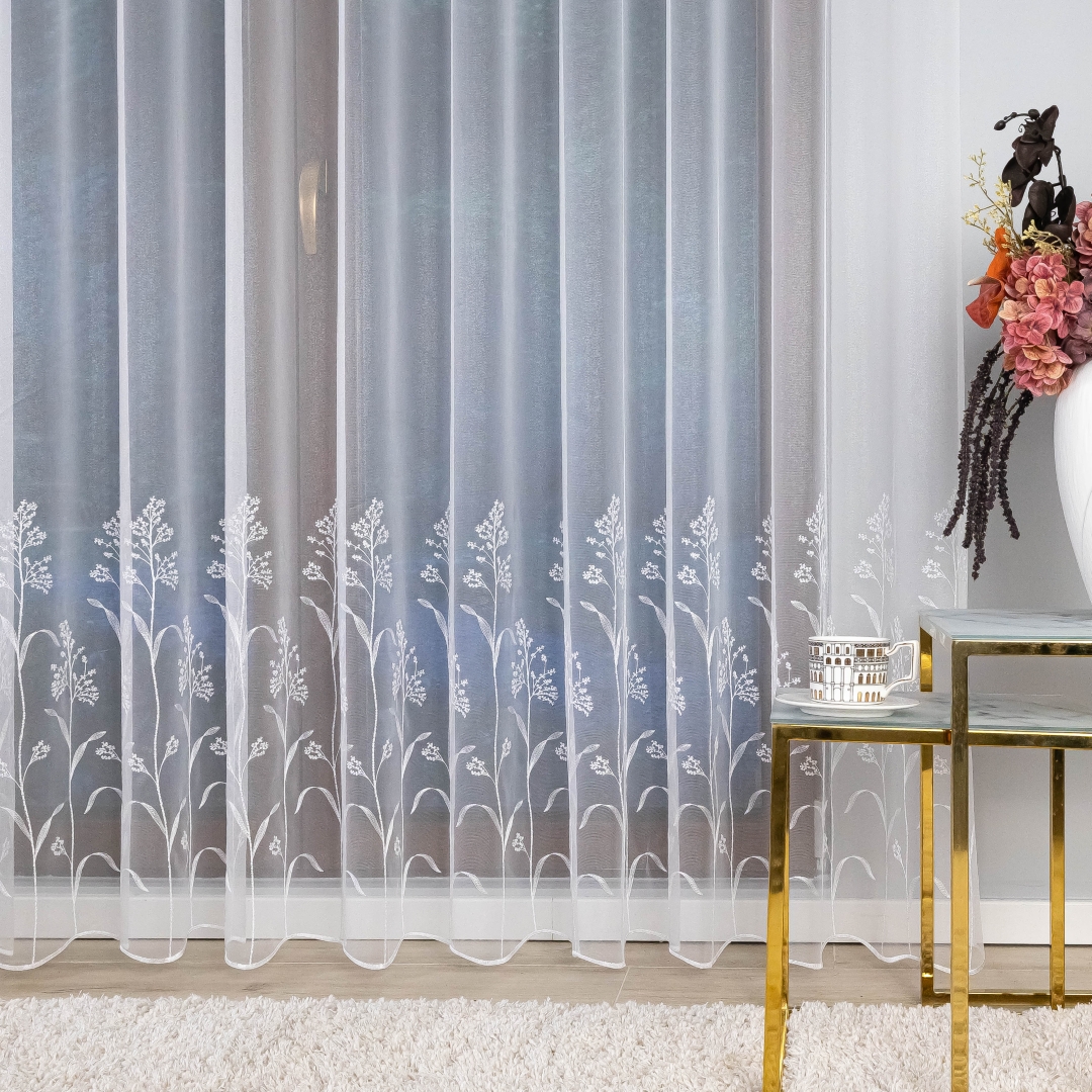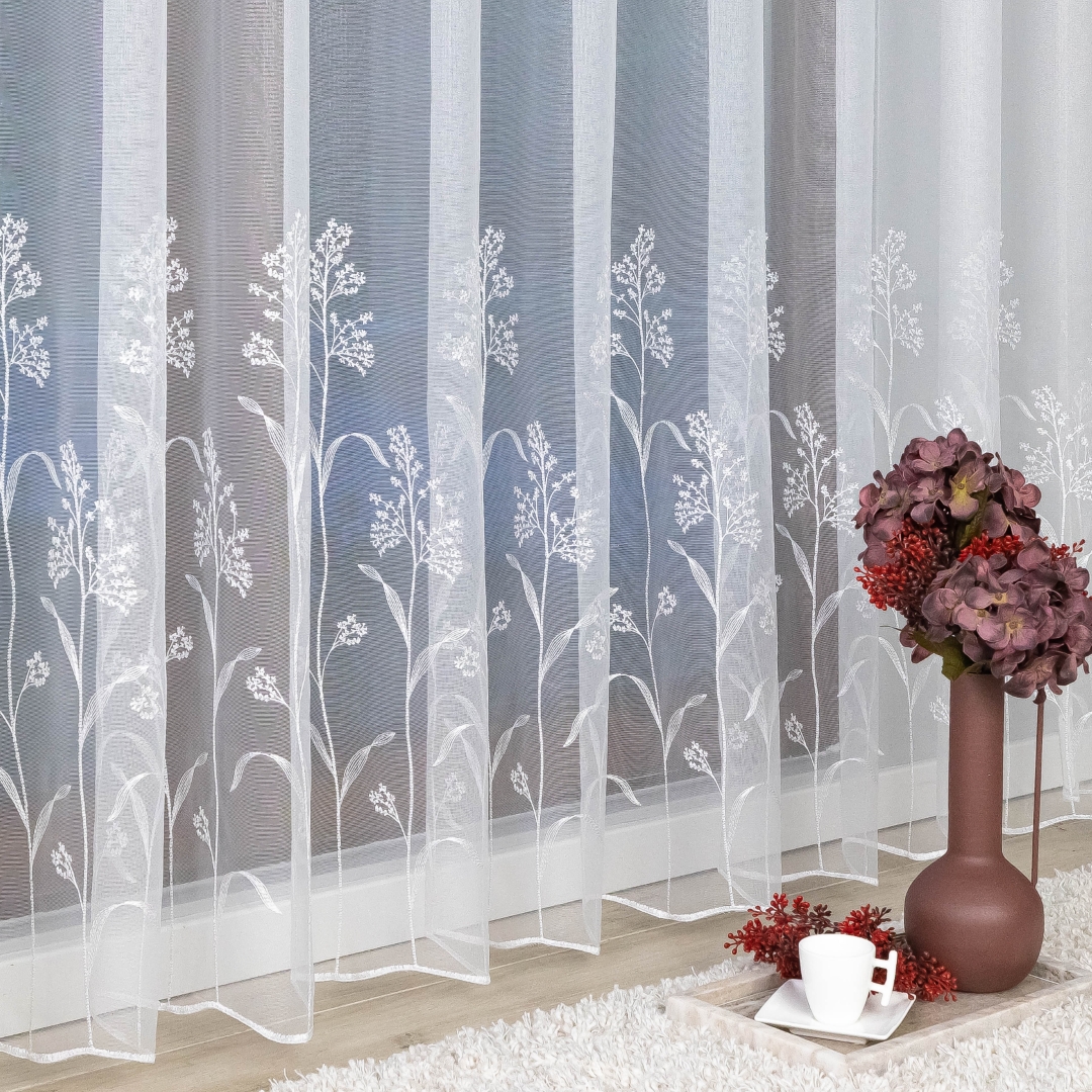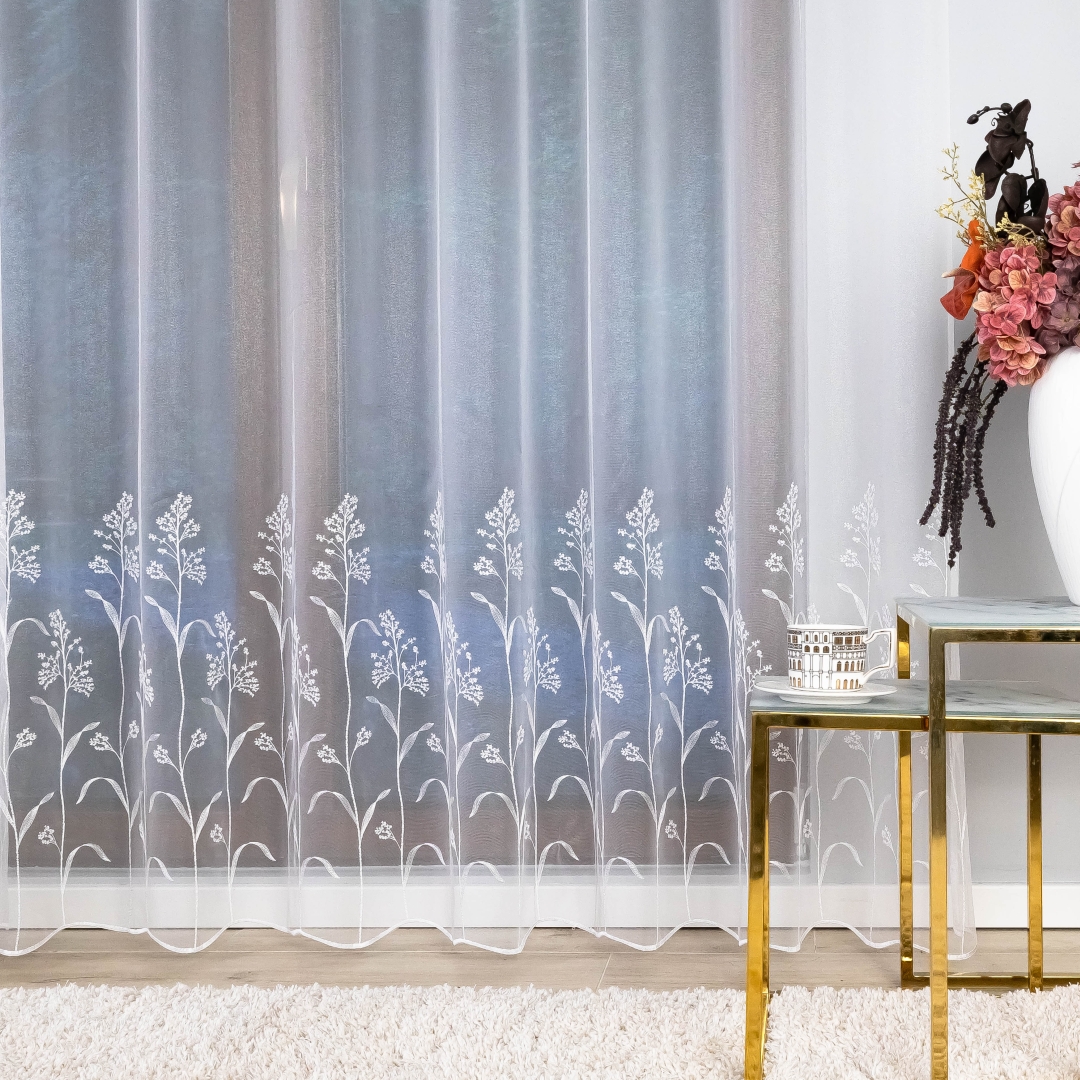 Haftowany motyw roślinny w formie smukłych łodyg z drobnymi kwiatami i listkami zdobi całą wysokość firany, przypominając kwitnące trawy lub polne kwiaty. Subtelny, naturalny wzór nadaje dekoracji romantycznego i świeżego charakteru.