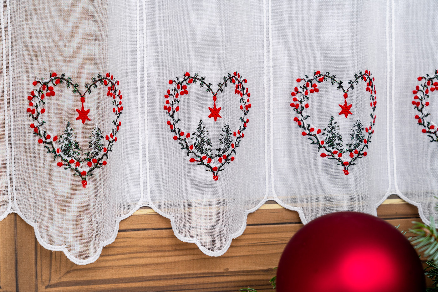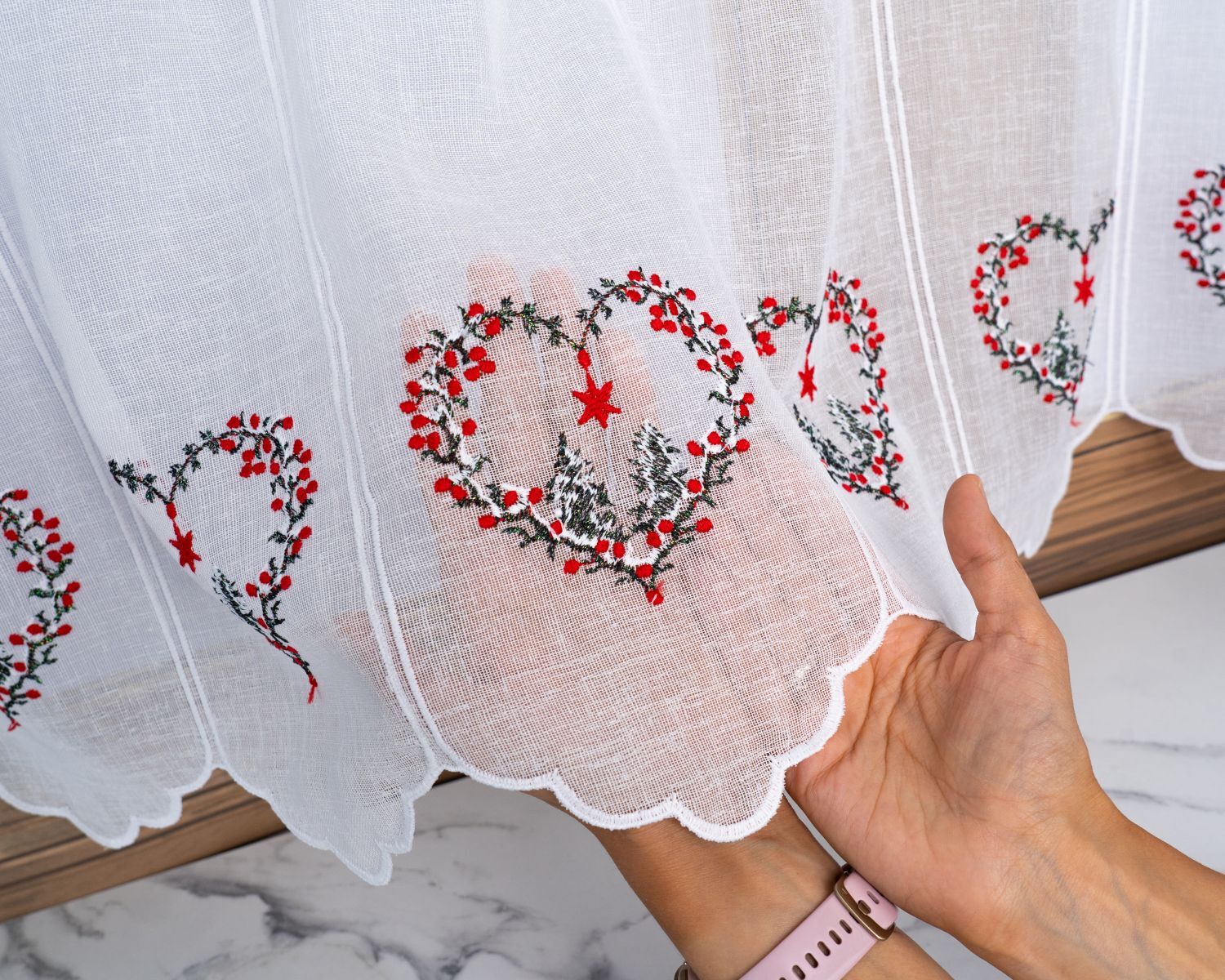 Subtelna i elegancka zazdrostka świąteczna wykonana z białej tkaniny o strukturze przypominającej naturalny len. Jej główną ozdobą jest haft w kształcie serca, w którym znajdują się zielone gałązki oraz czerwona ozdoba przypominająca gwiazdę lub świąteczny kwiat.